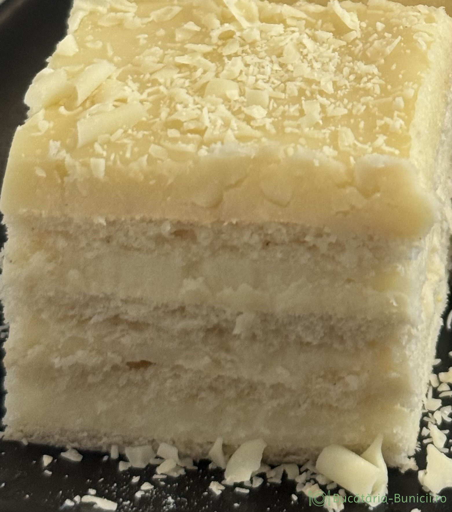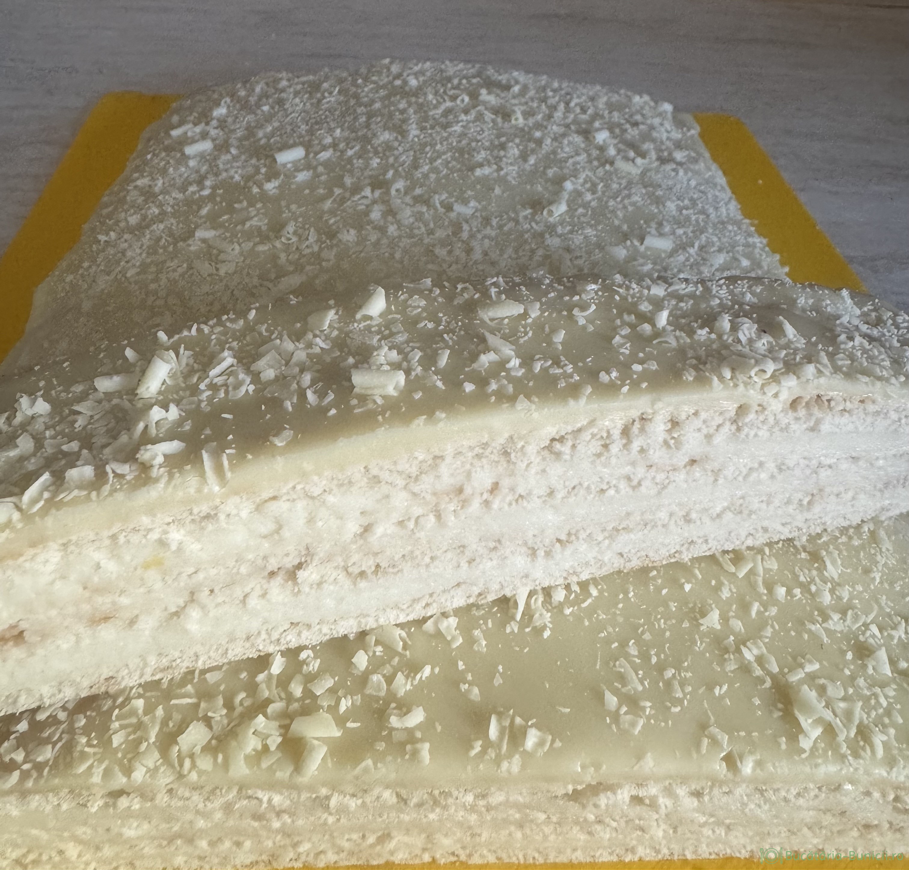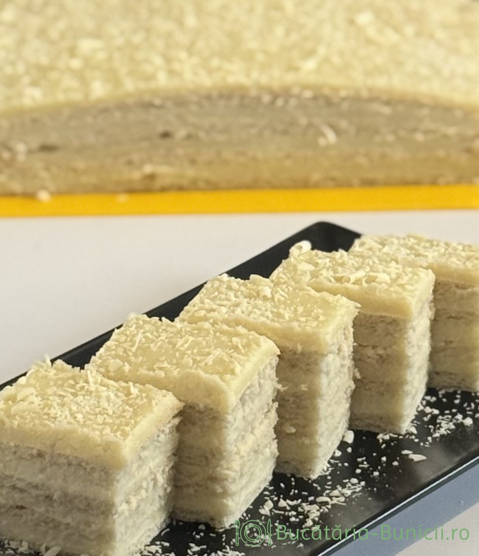 - Se taie marginea neuniforma a prăjiturii și se dă deoparte, iar feliile drepte se feliază după preferințe, pătrate, dreptunghiuri, romburi, mai mici, mai mari, fiecare cum dorește și cum îi place.