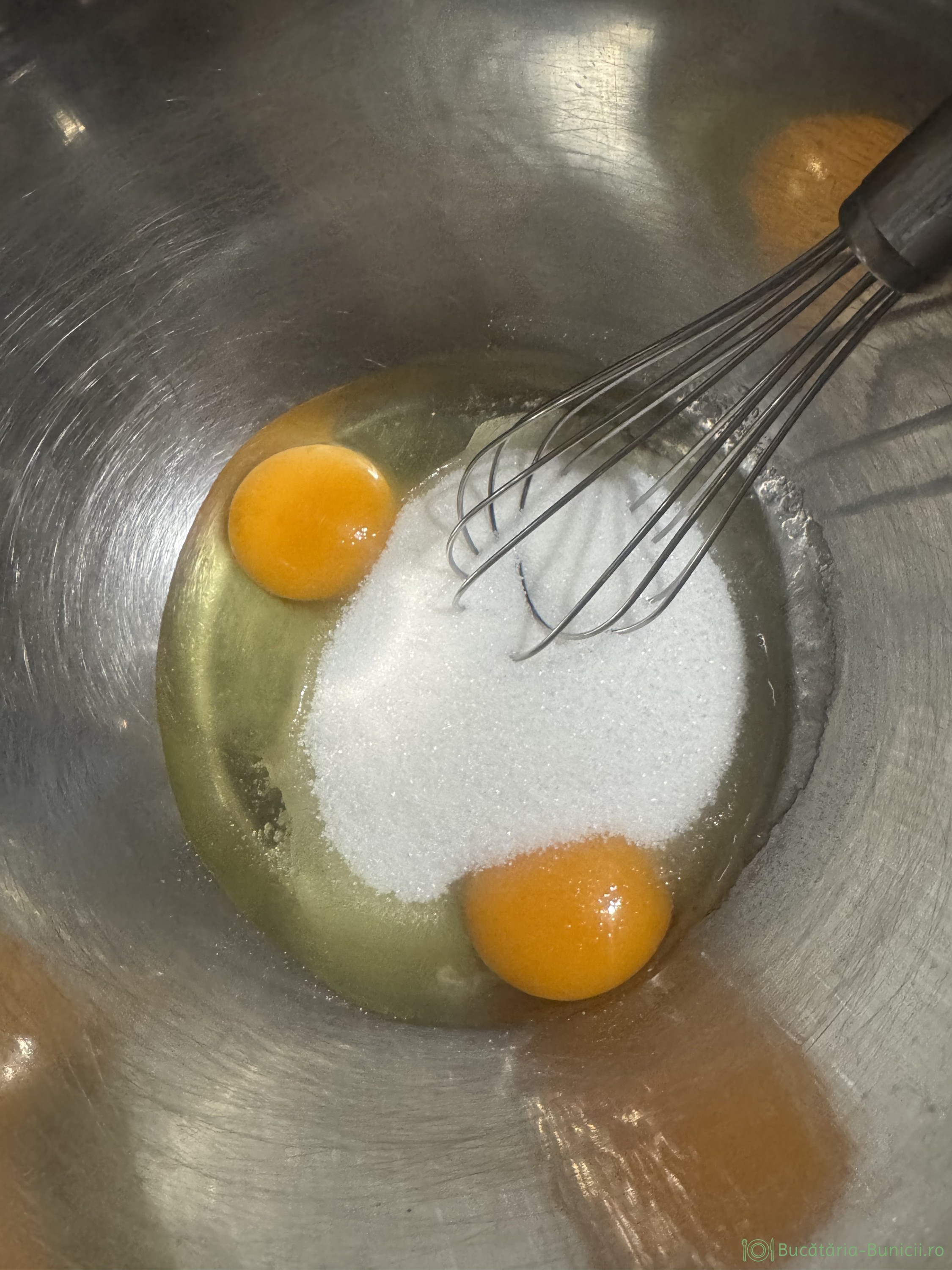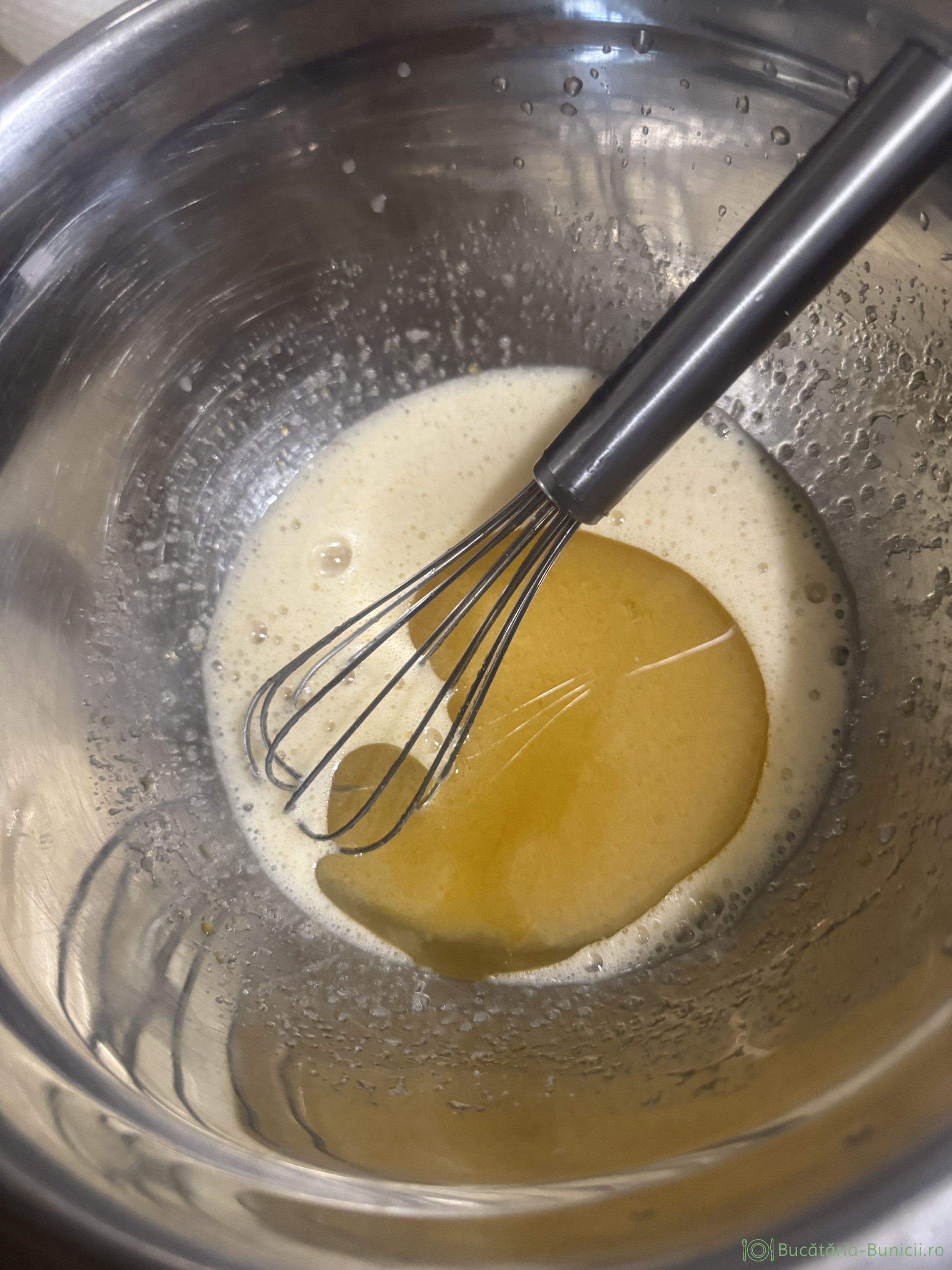 - Într-un bol se pun ouăle, un praf de sare și zahărul. Se amestecă cu telul 2-3 minute, apoi se încorporează uleiul.