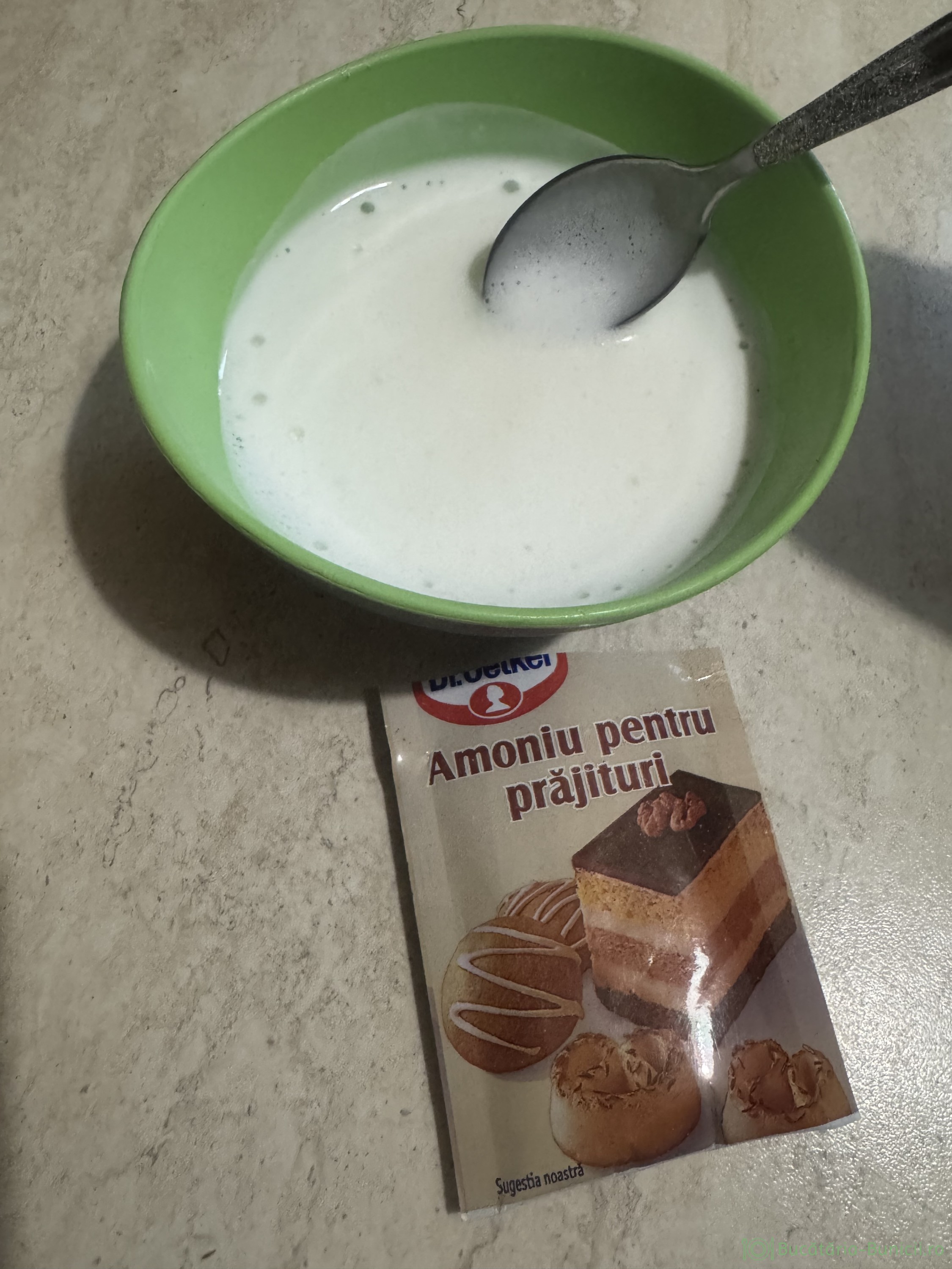 - În laptele călduț se dizolvă bicarbonatul de amoniu. Vom observa cum, laptele se umflă de la amoniu și va elibera mirosul înțepător specific.