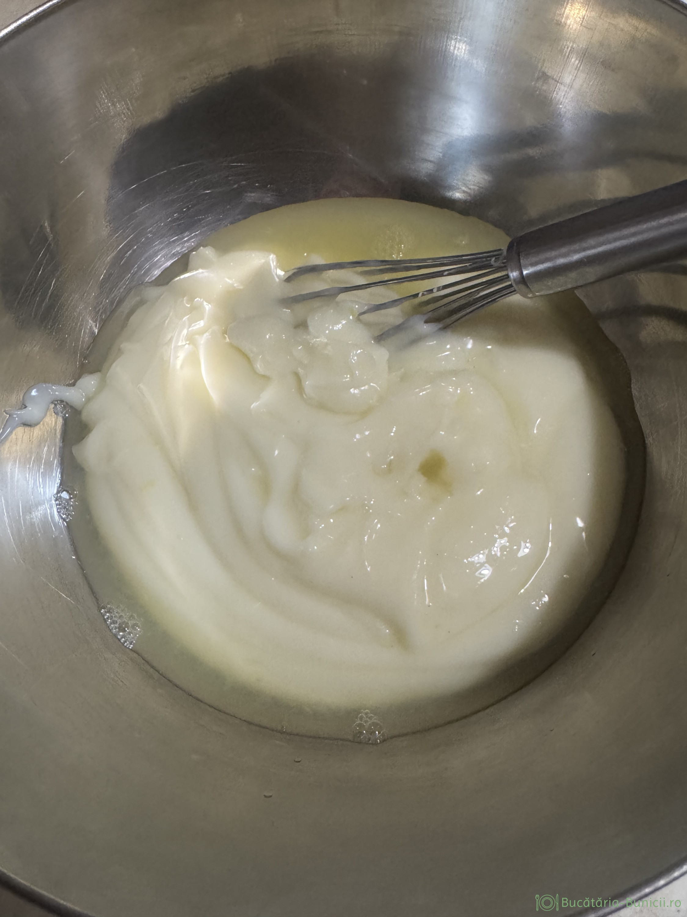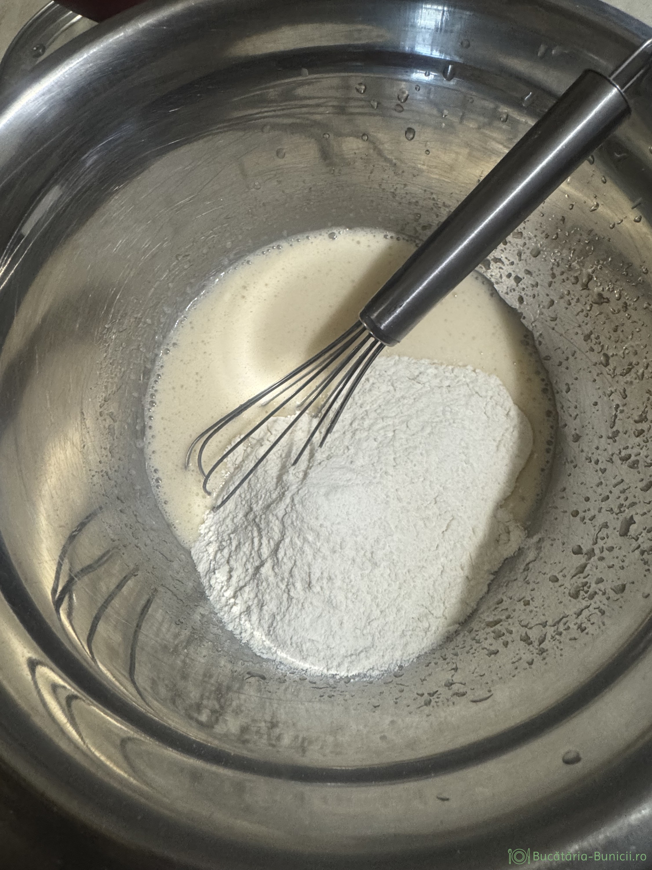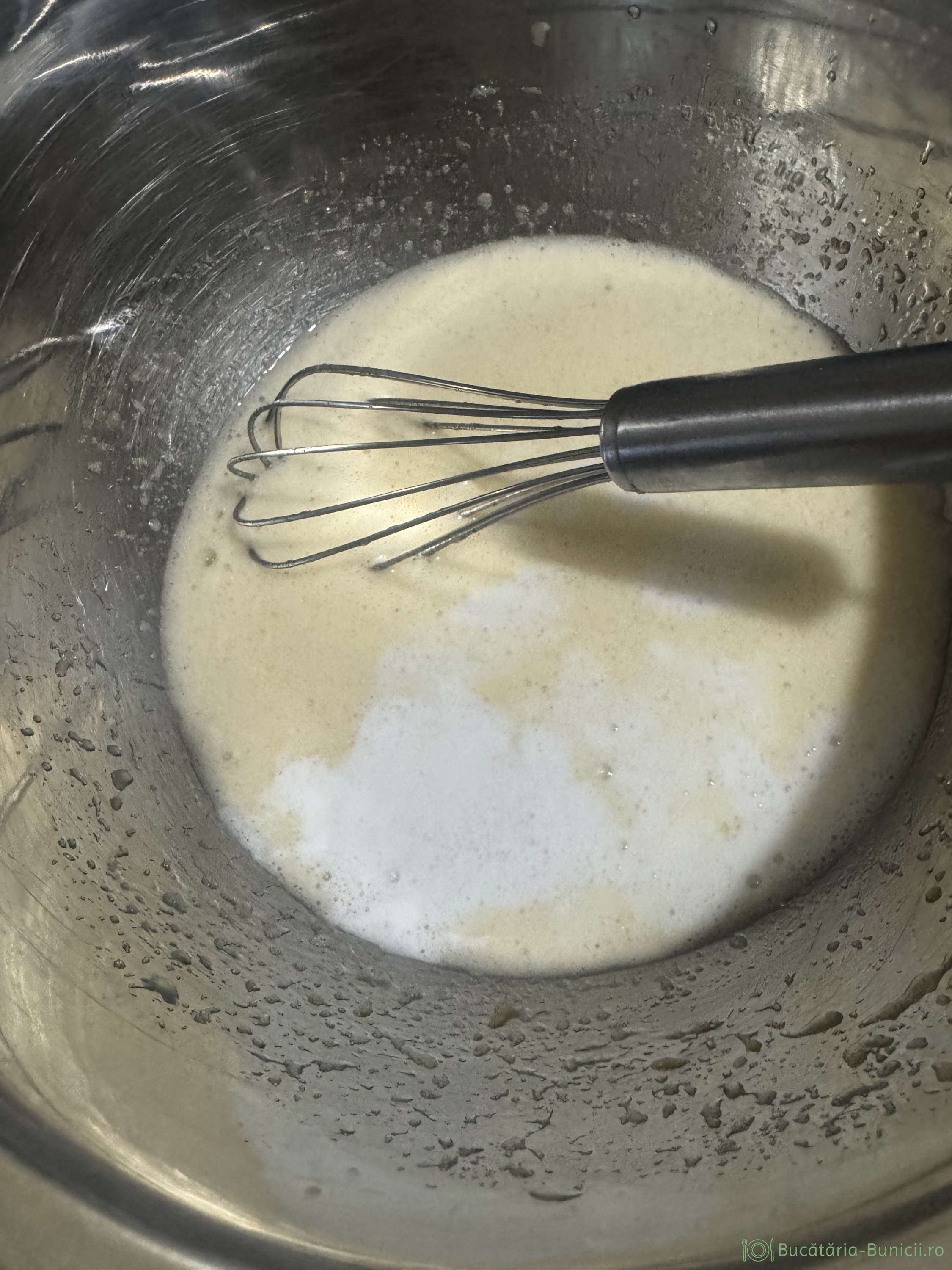 - Peste amestecul de ou se toarnă laptele călduț cu bicarbonatul dizolvat.