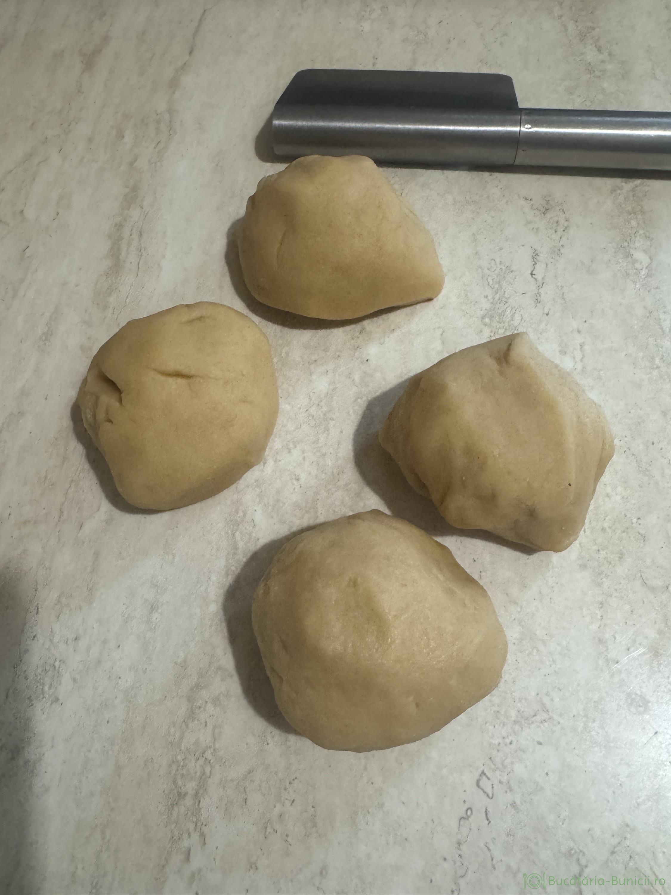 - Aluatul se împarte în patru bucăți egale.