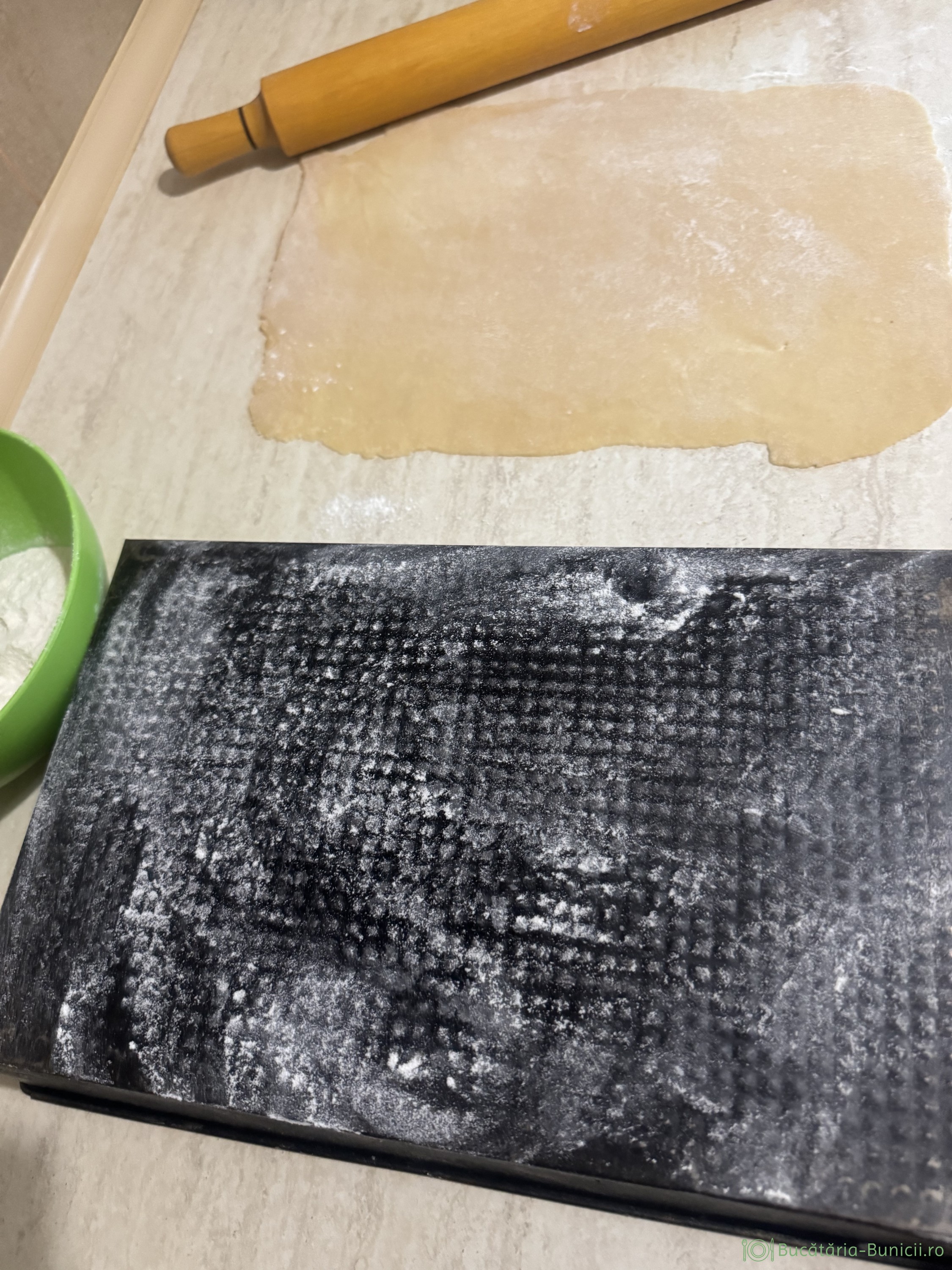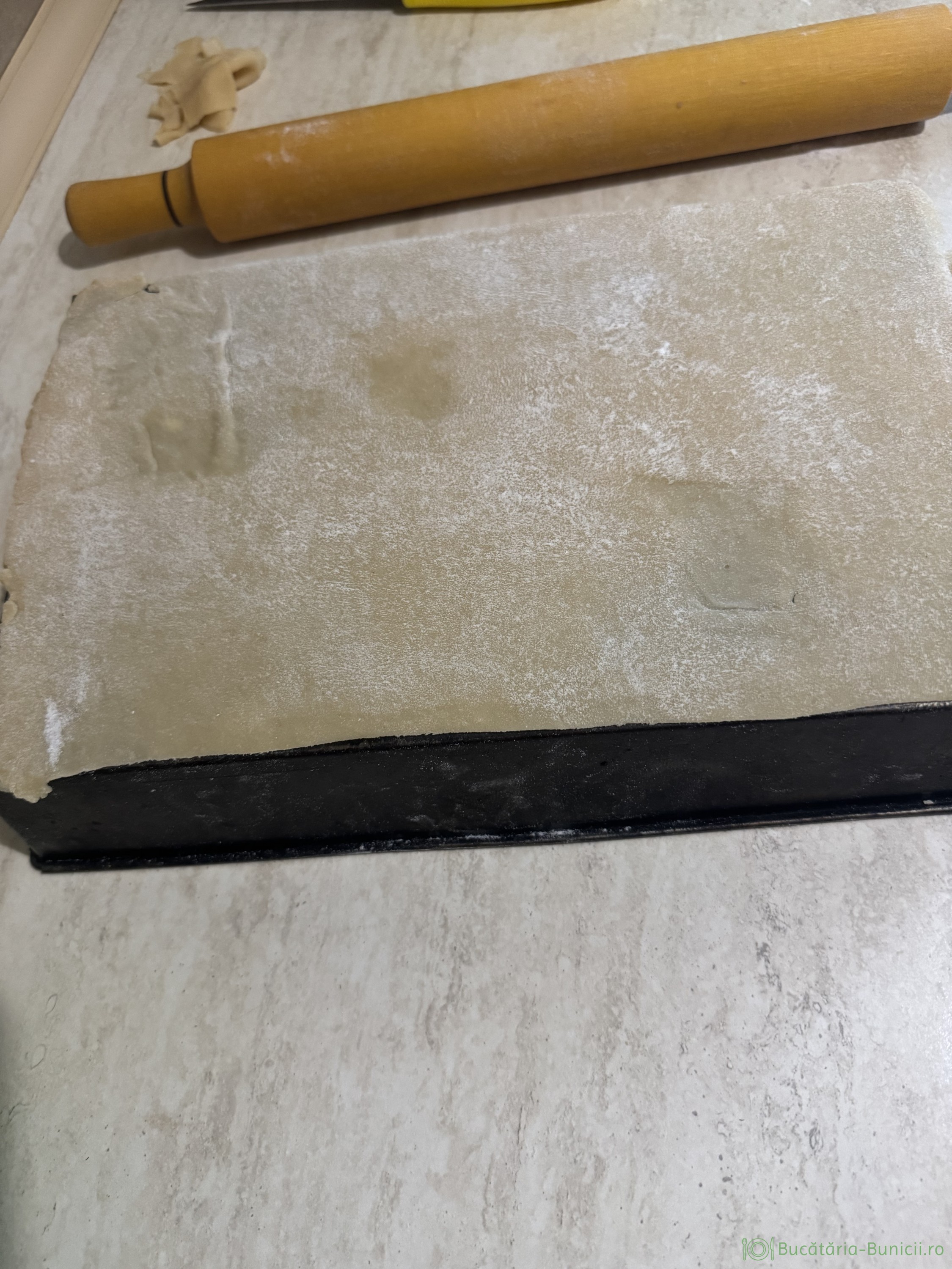 - Cu ajutorul sucitorului, pe blatul presărat cu făină se întinde o bucată de aluat într-o foaie subțire de 2-3 mm, având dimensiunea dosului tavii, adică 21/33 cm. Se poate folosi și o tavă de 20/30 cm.