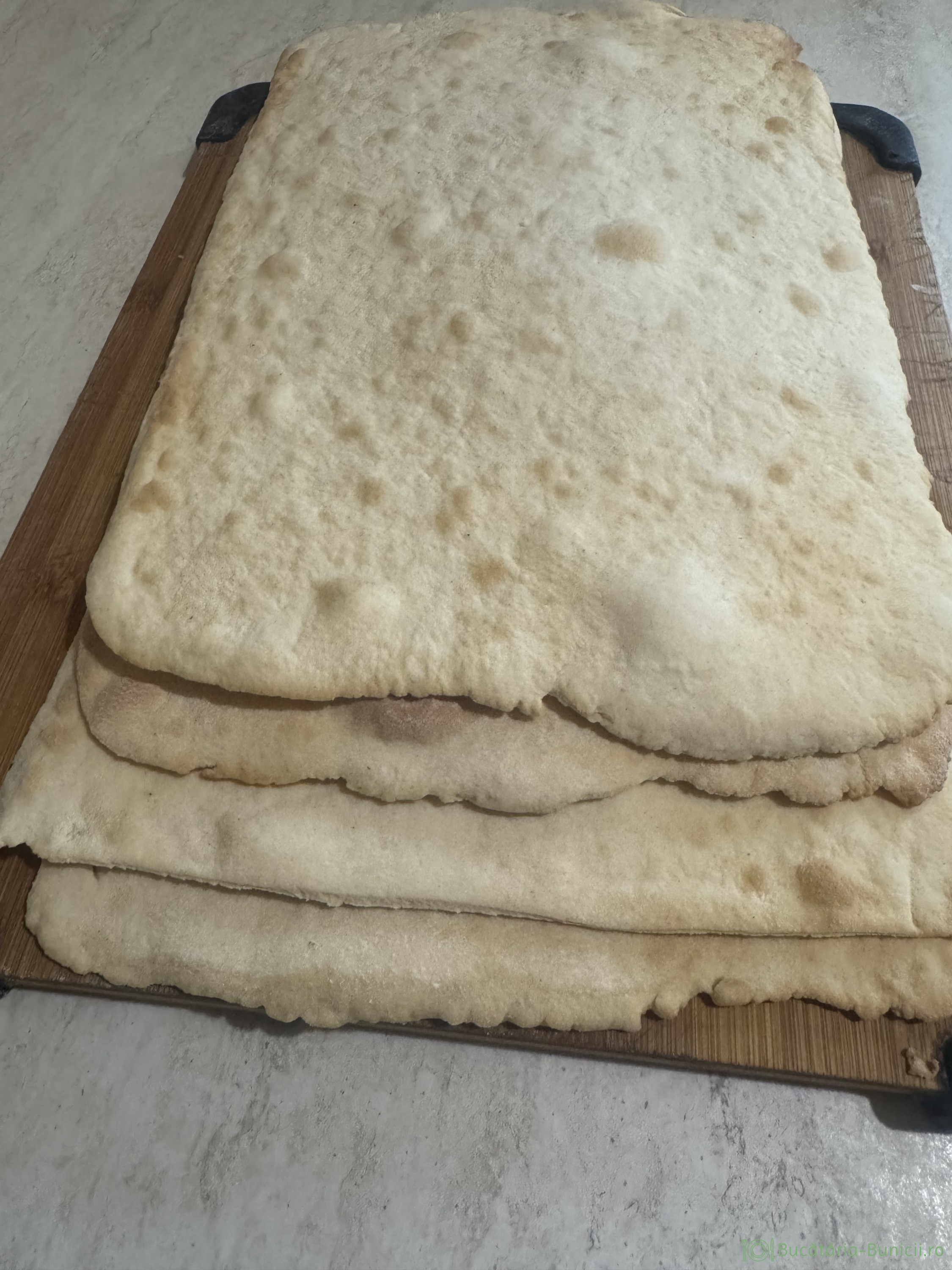 - Se scoate tava din cuptor și foaia se lasă, să alunece pe un blat de lemn.