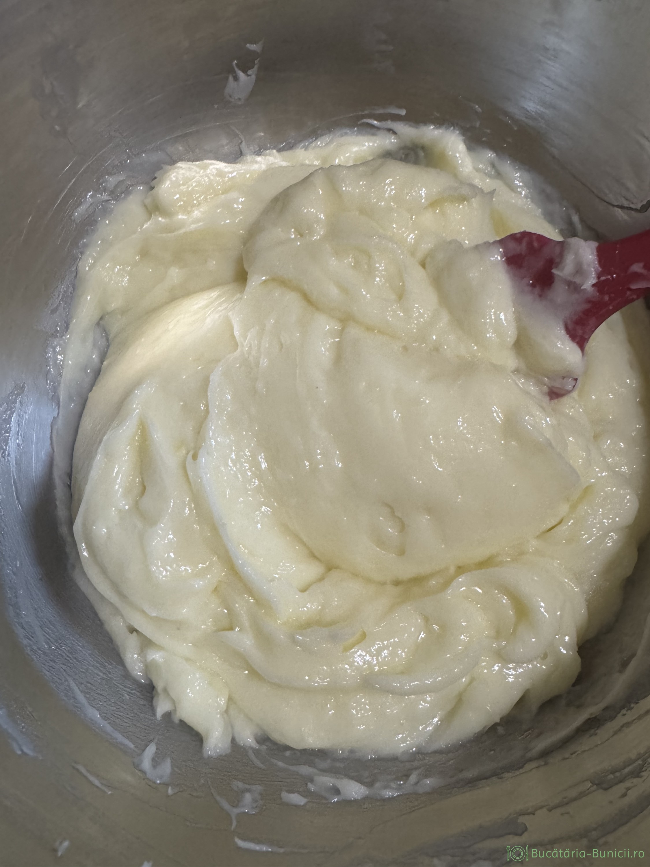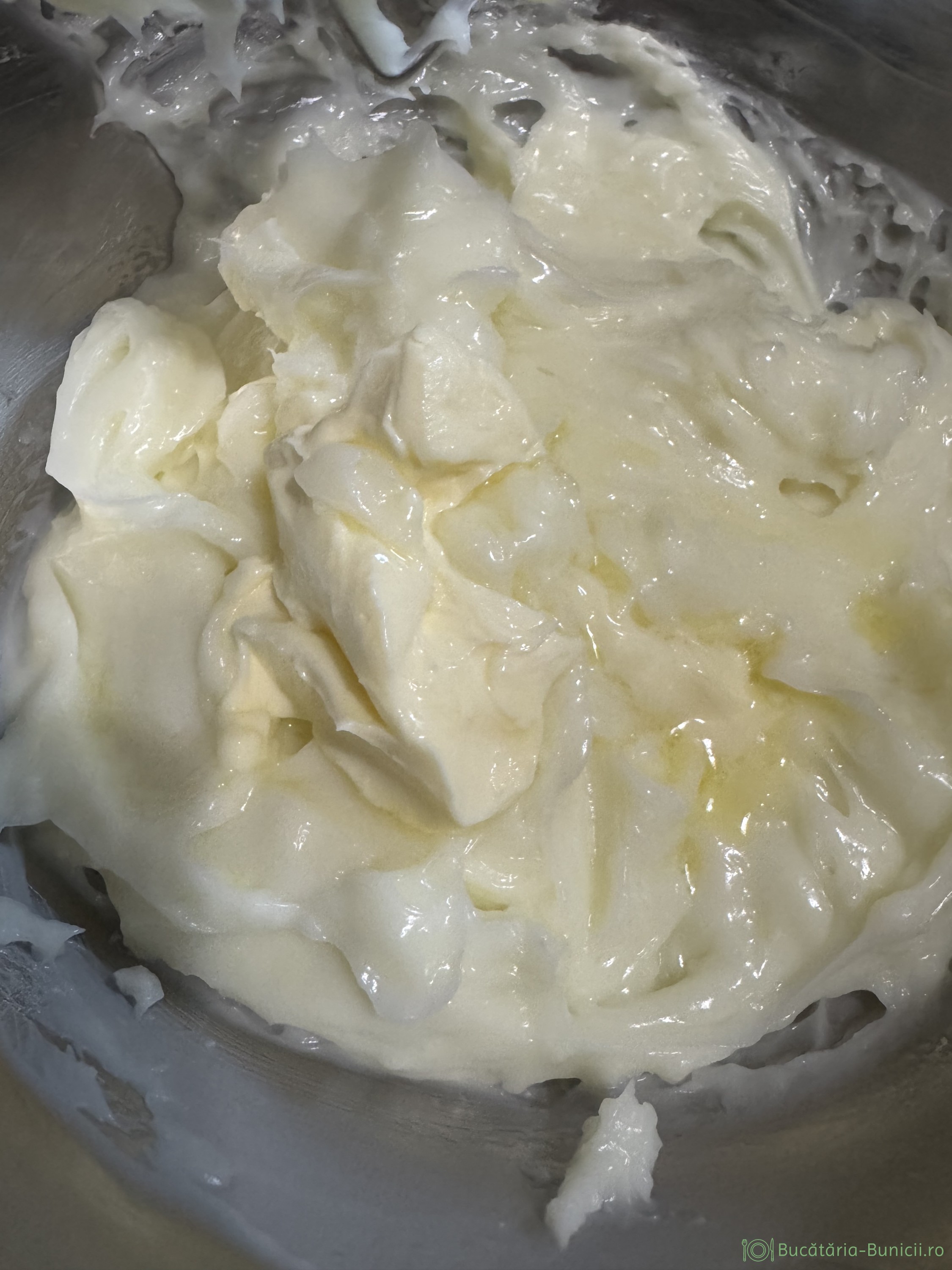 - Când crema s-a răcit și a ajuns la consistența unei budinci, se mixează 1-2 minute, apoi se adaugă treptat untul moale, mixând mereu. La final vom avea o cremă fină, ferma și pufoasă.