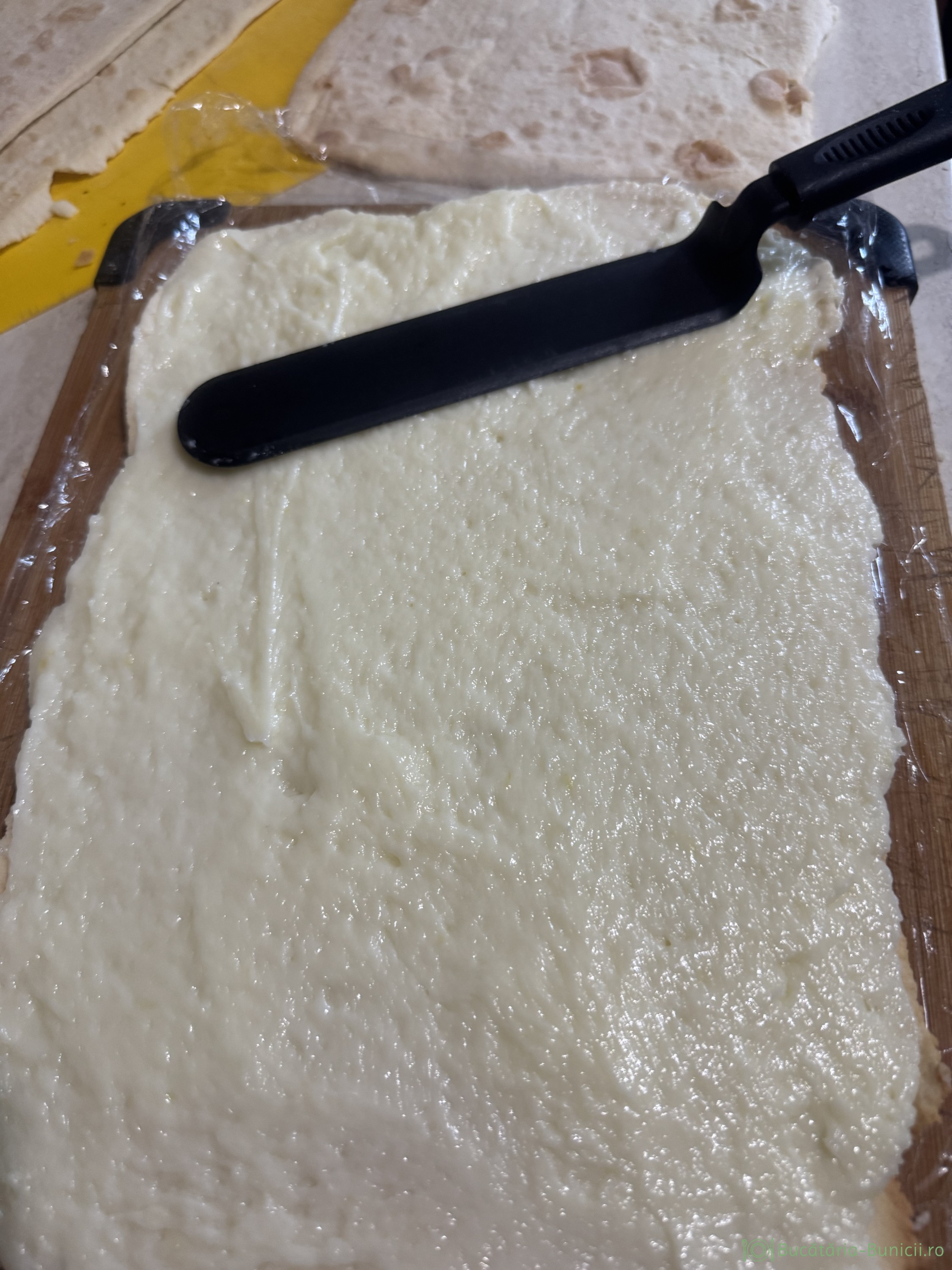 - Pe un blat de lemn se pune folie alimentară, lăsând capetele mai lungi.