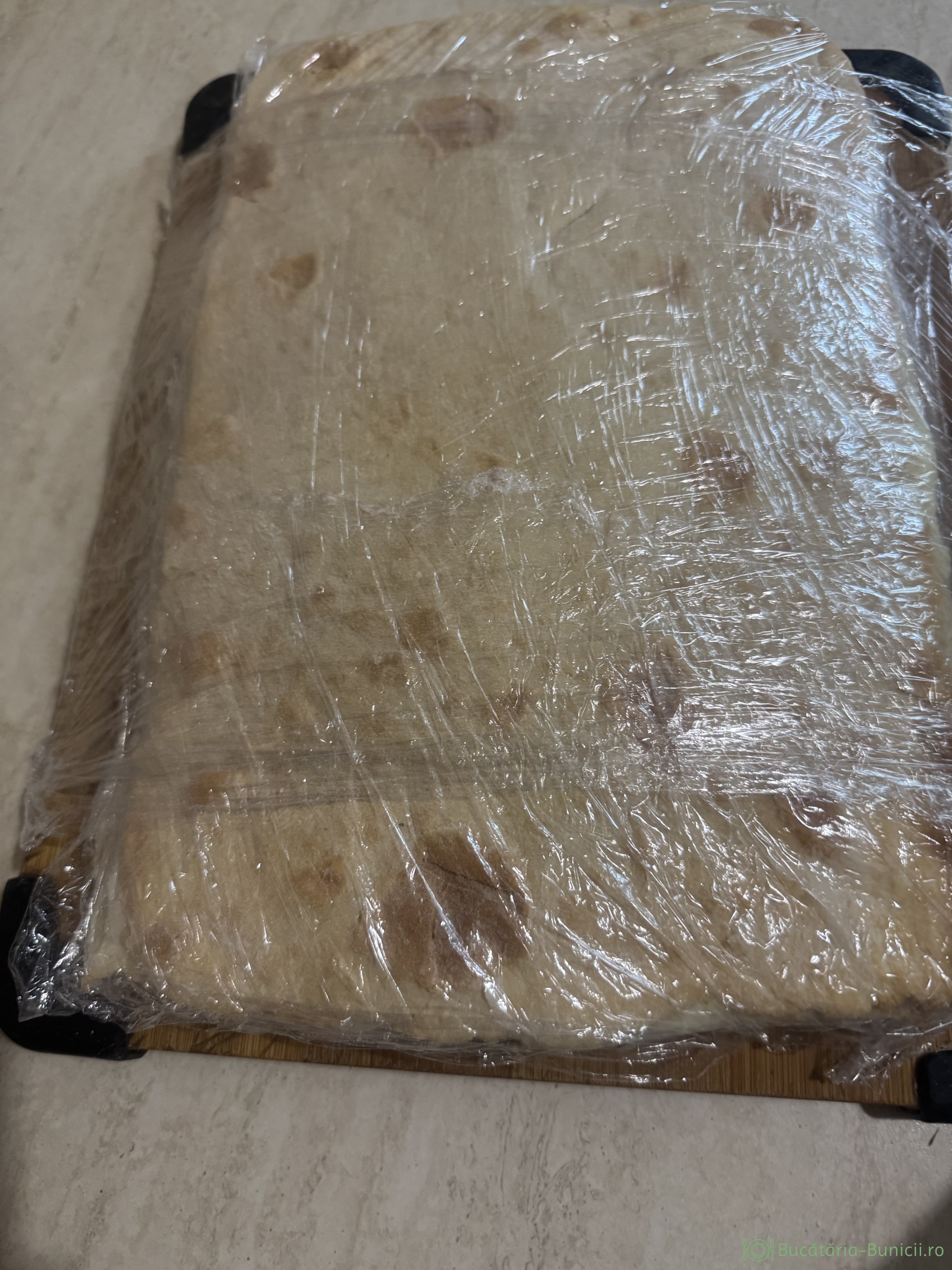 - Cu capetele foliei alimentele se învelește prăjitura, deasupra se pun greutăți (eu am folosit două pungi cu făină), pentru a ține foile presate și se dă prăjitura într-o cameră răcoroasă, pe timpul iernii, măcar 24 ore. Vara, în lipsa camerei răcoroase, vom pune prăjitura la frigider. În acest timp foile se vor înmuia.