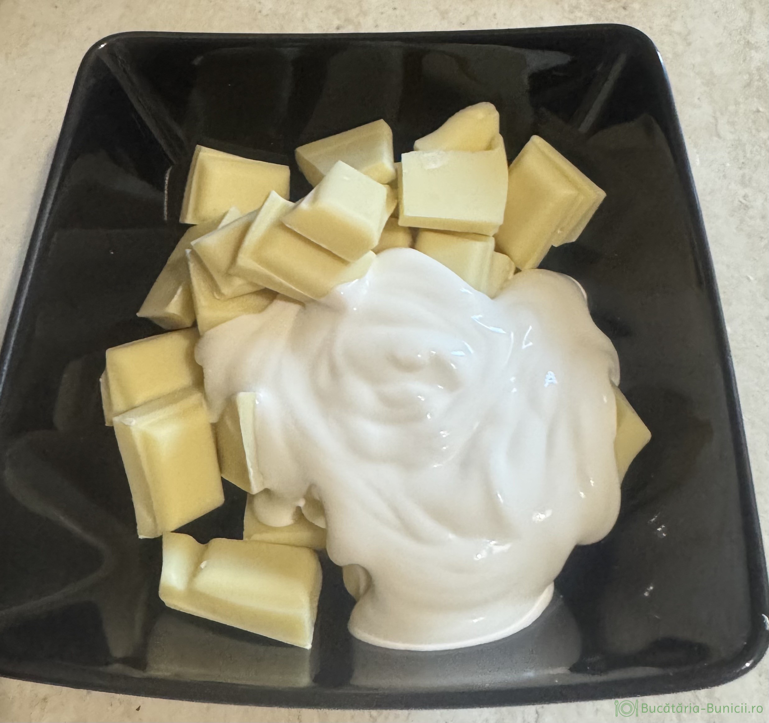 - Într-un bol se pune ciocolata ruptă bucăți și frișca lichidă, apoi se pune bolul în cuptorul cu microunde în reprize scurte de 30 secunde, până se înfierbântă frișca. În lipsa cuptorului, bolul se pune pe baia de abur.