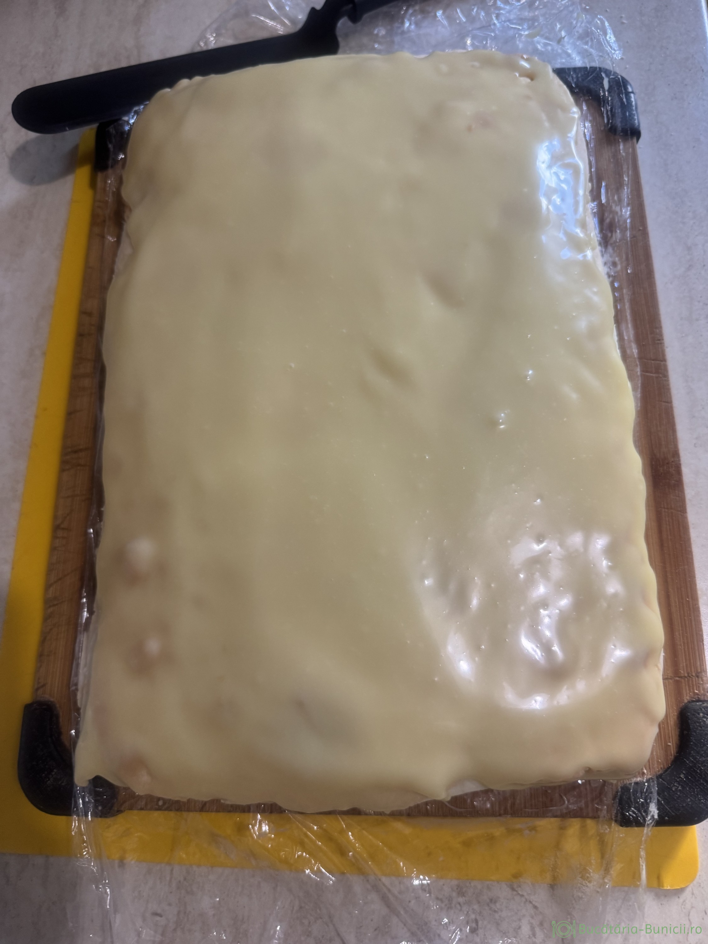 - Se pune folie alimentară direct pe cremă și se lasă la răcit.
