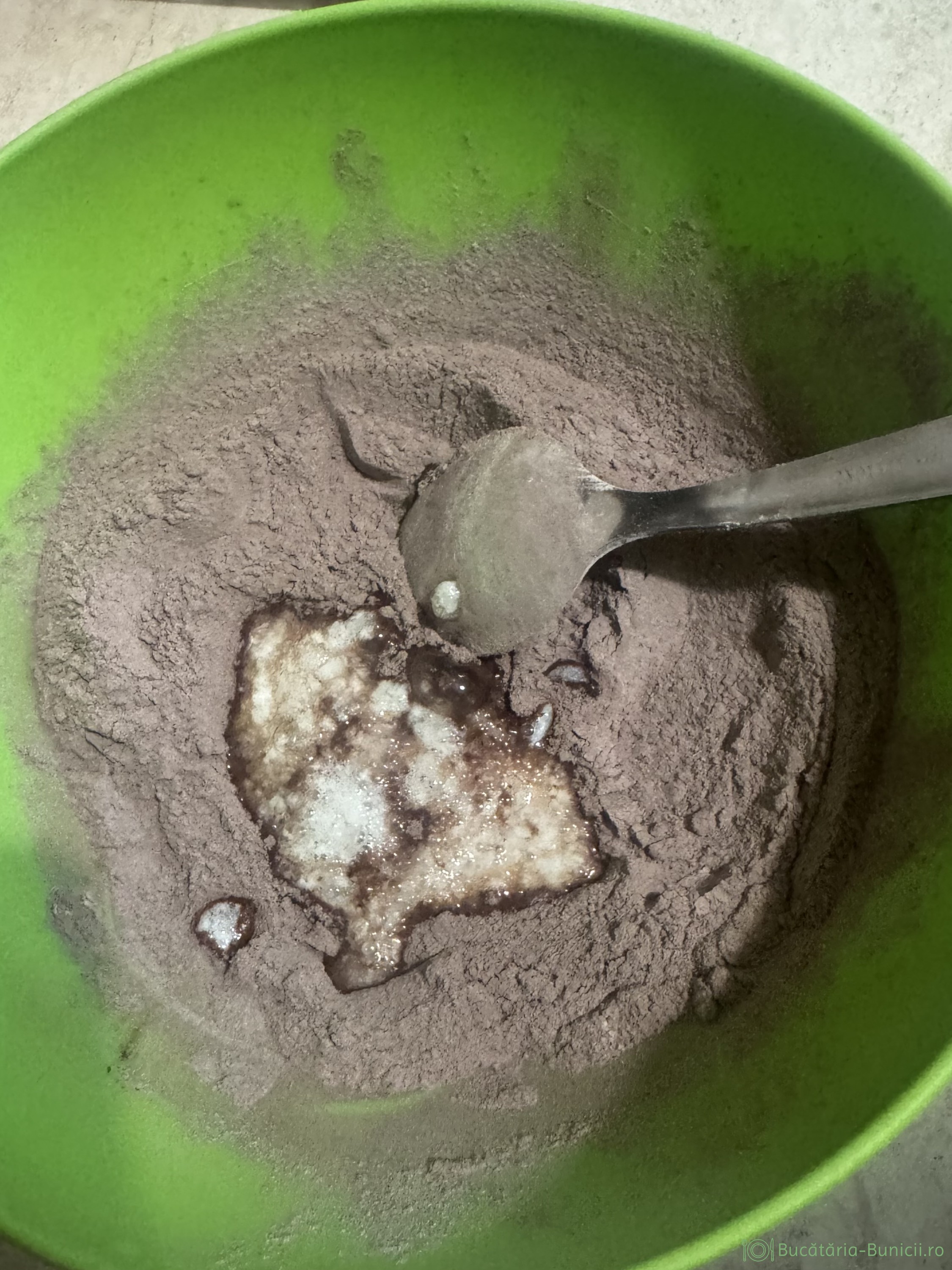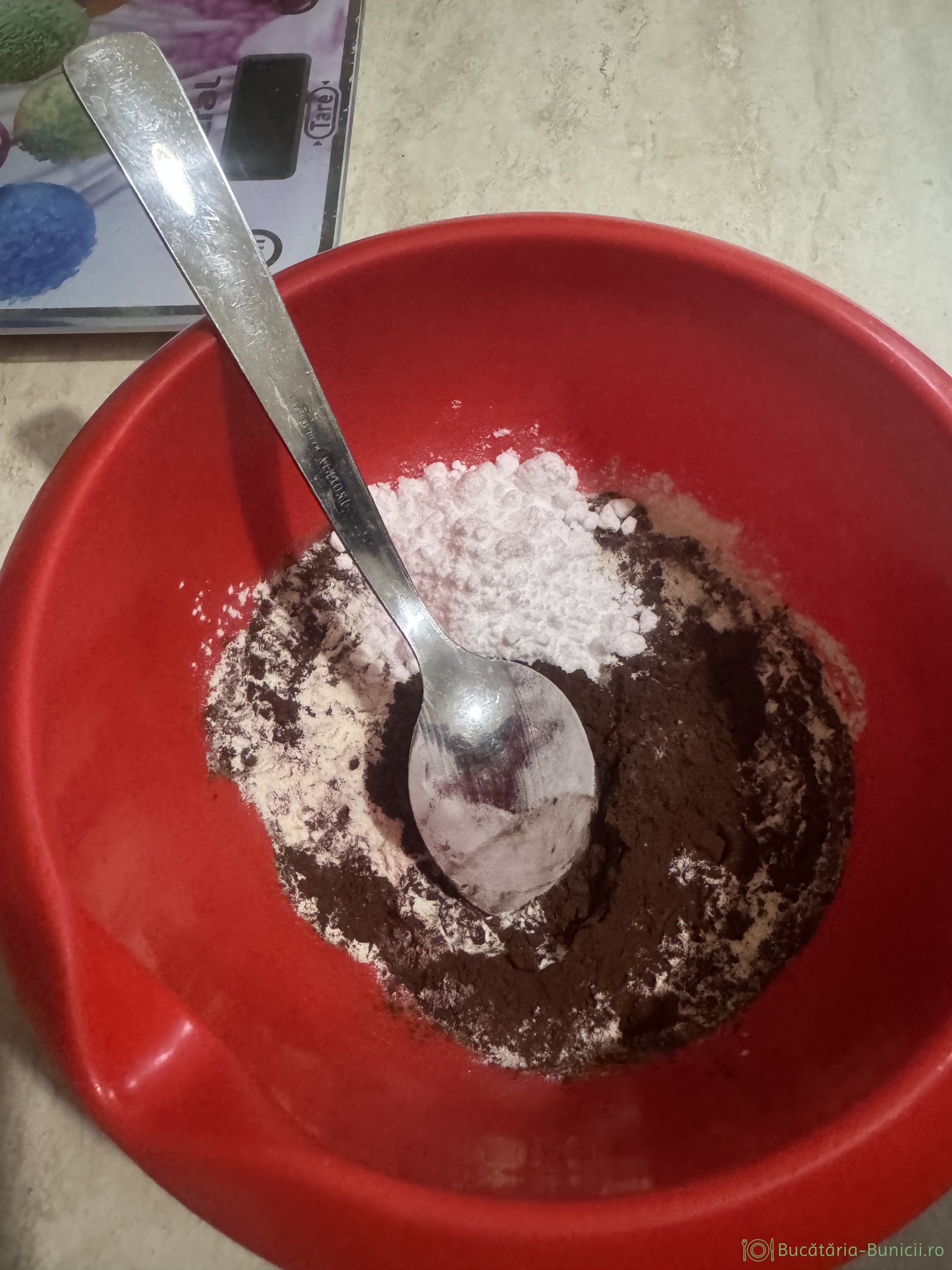 - Laptele praf, cacaua și pudra de îndulcitor se amestecă și se cern împreună.