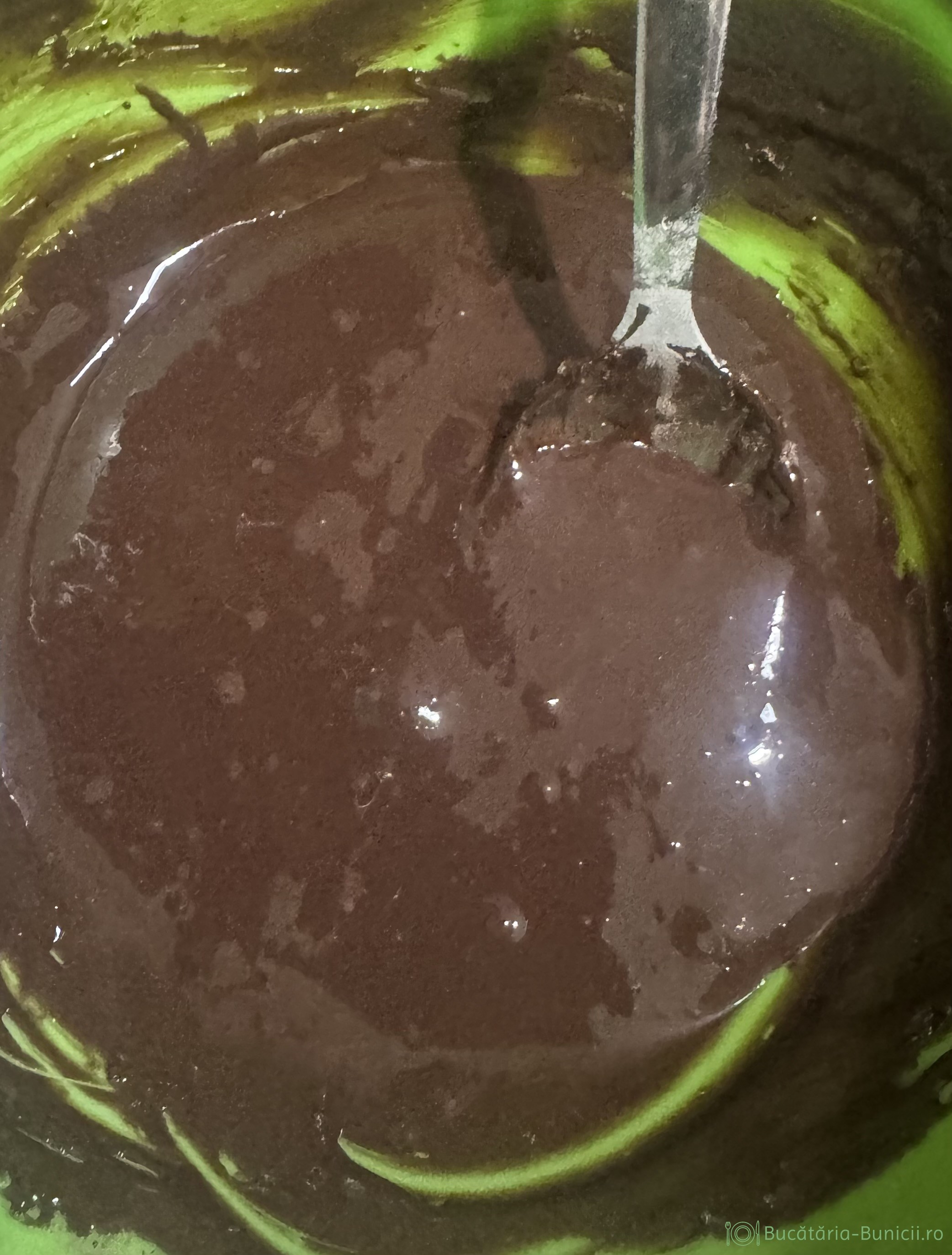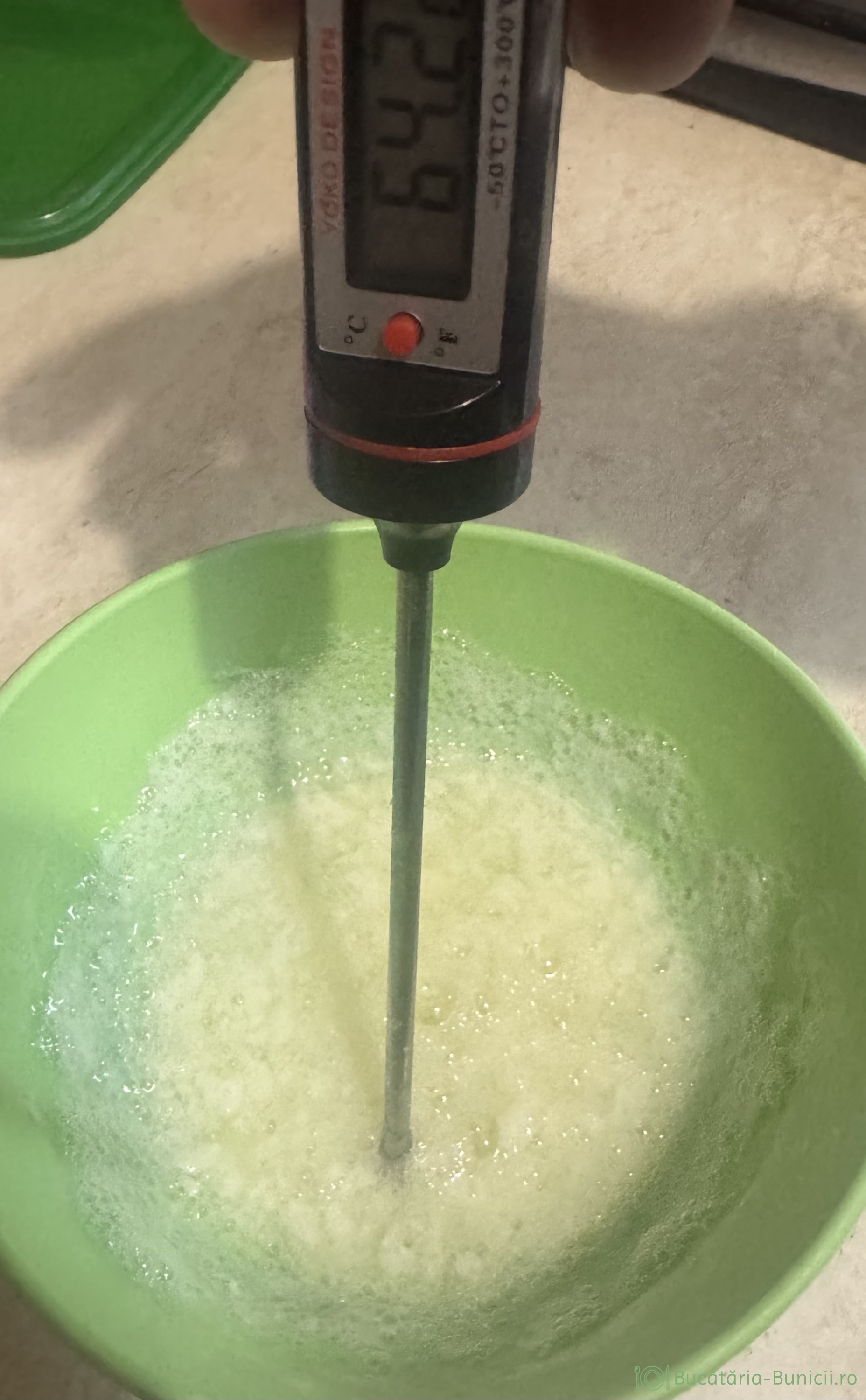 - La fel ca la ciocolată albă, unde am folosit albus de ou și aici tratăm termic albușul și anume: într-un vas punem albușurile și le batem puțin cu furculița. Așezăm vasul cu albus în alt vas mai mare în care punem apă. Punem vasul la foc mediu, să fiarbă apa, amestecând mereu în albuș. Când termometrul arată între 62-65 grade, temperatura la care albușul începe, să se coaguleze, scoatem vasul din apă clocotită și-l turnăm peste amestecul cernut.