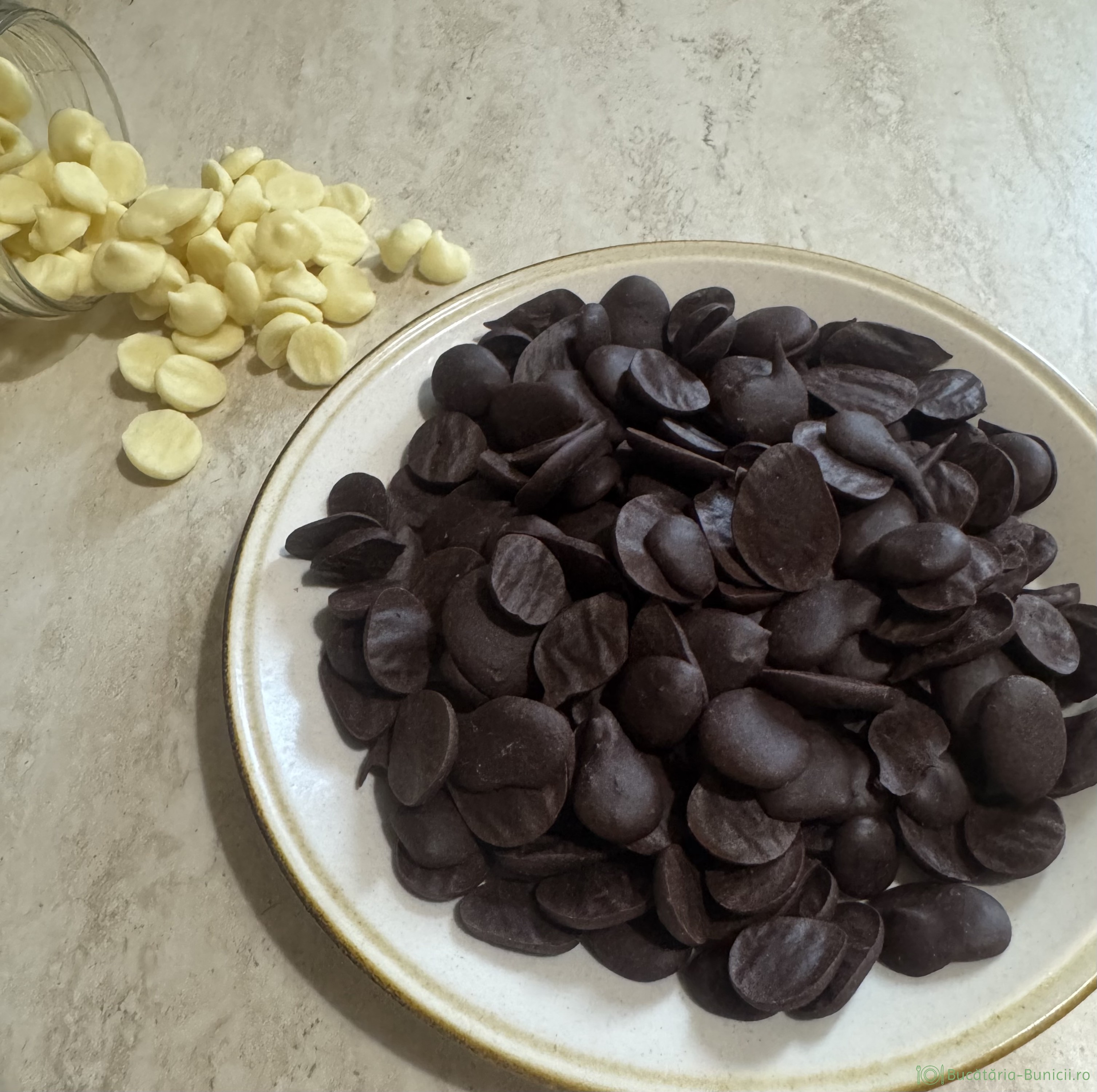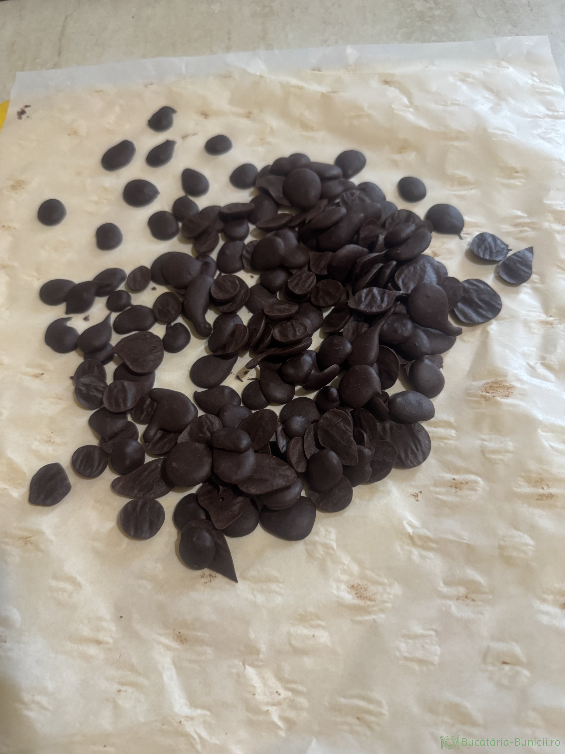 - Pe un blat se pune hârtie de copt, pe care se formează niste năsturei de ciocolată de 1-1,5 cm. Se lucrează mai greu decât crema de la ciocolată albă, dar cu atenție și răbdare, se rezolvă treaba.