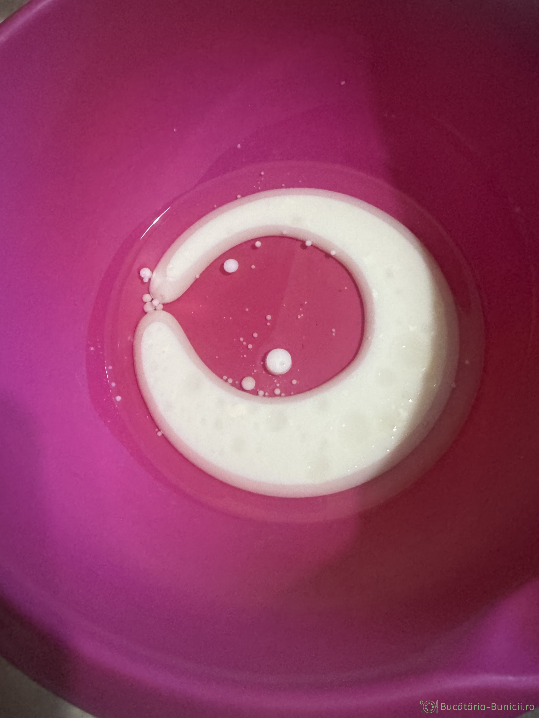 - Într-un bol se pune uleiul, laptele și un praf de sare. Se omogenizează, folosind un tel.