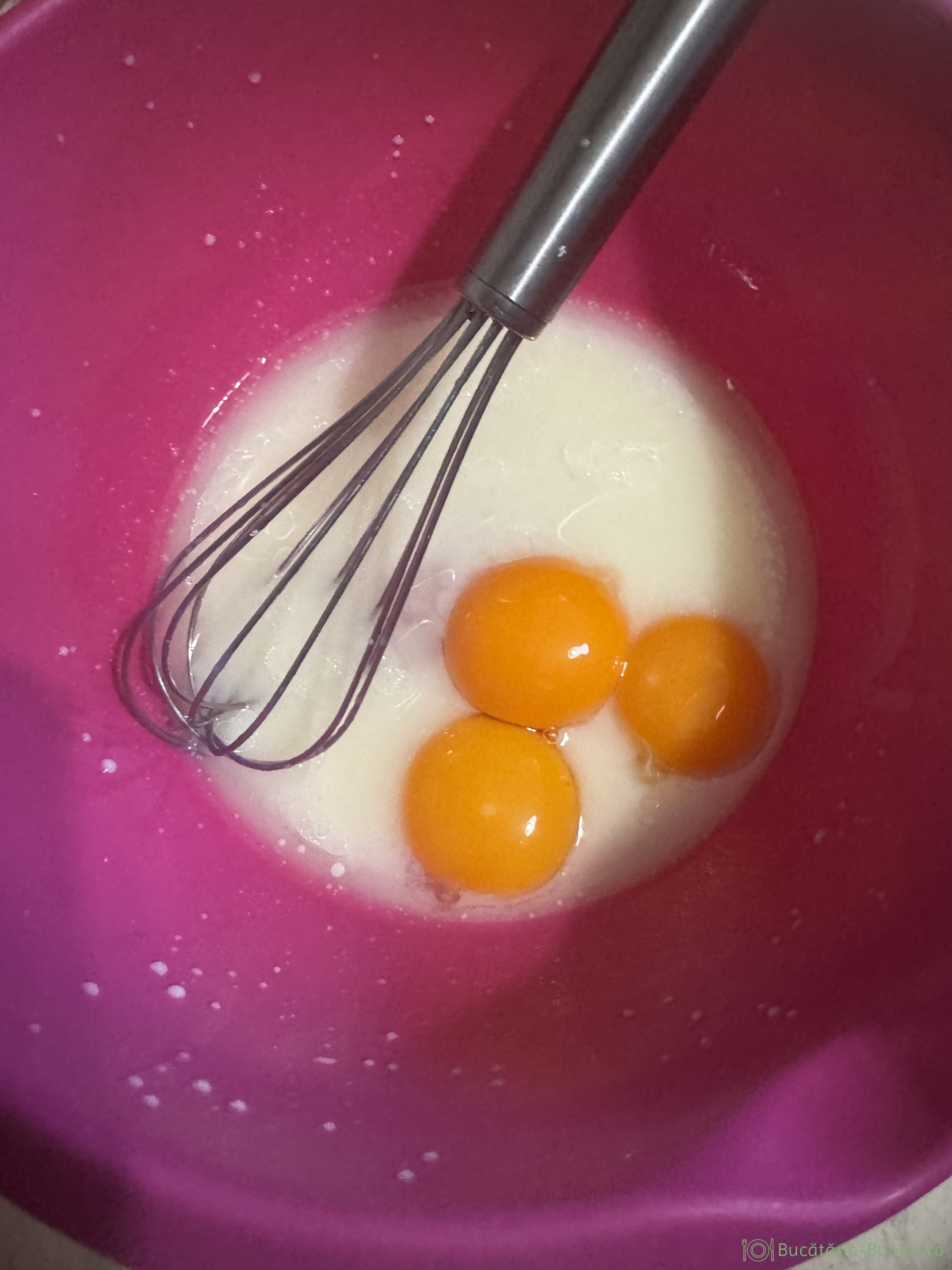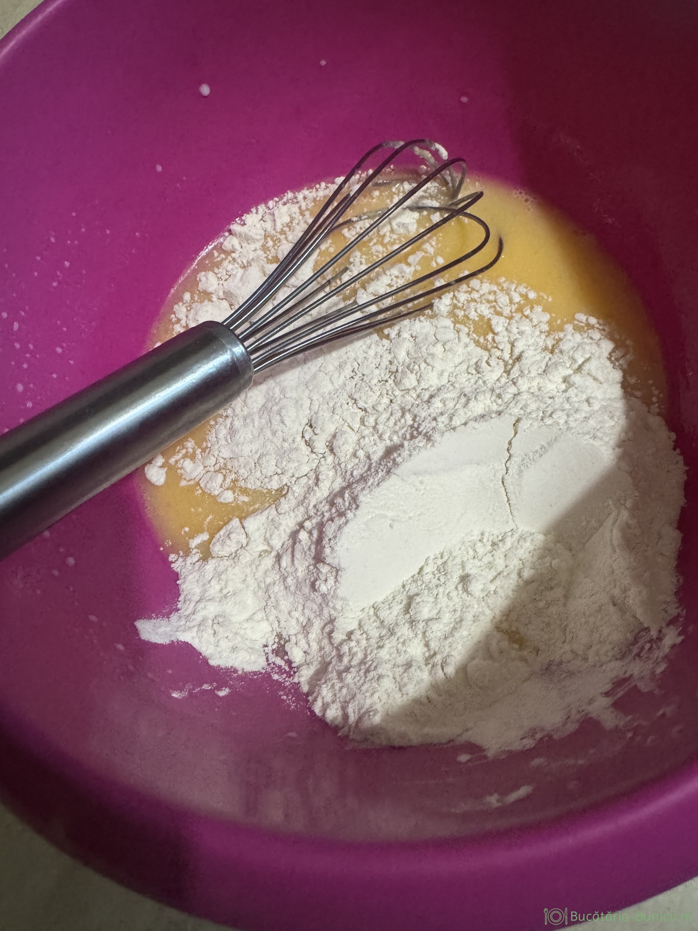 - Se separă ouăle, gălbenușurile se adaugă peste emulsia de ulei și lapte, iar albușurile se pun într-un bol. Se amesteca bine, apoi se încorporează făina și se dă compoziția deoparte.