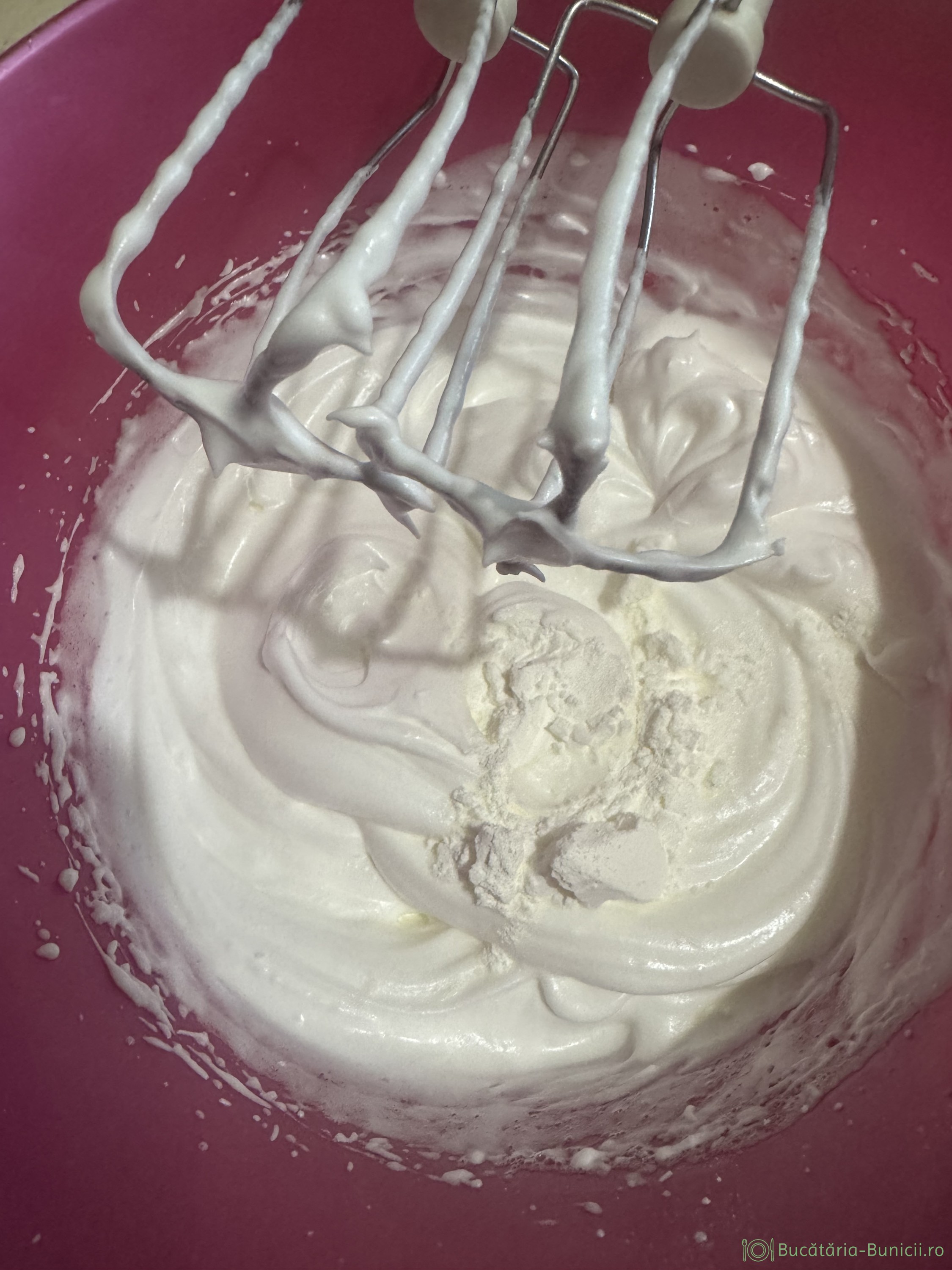 - Peste albușuri se pune zeama de lămâie și zahărul. Se mixează, până se formează o bezea fermă, apoi se adaugă cele 5 g de amidon de porumb, mixând, până se încorporează în bezea.