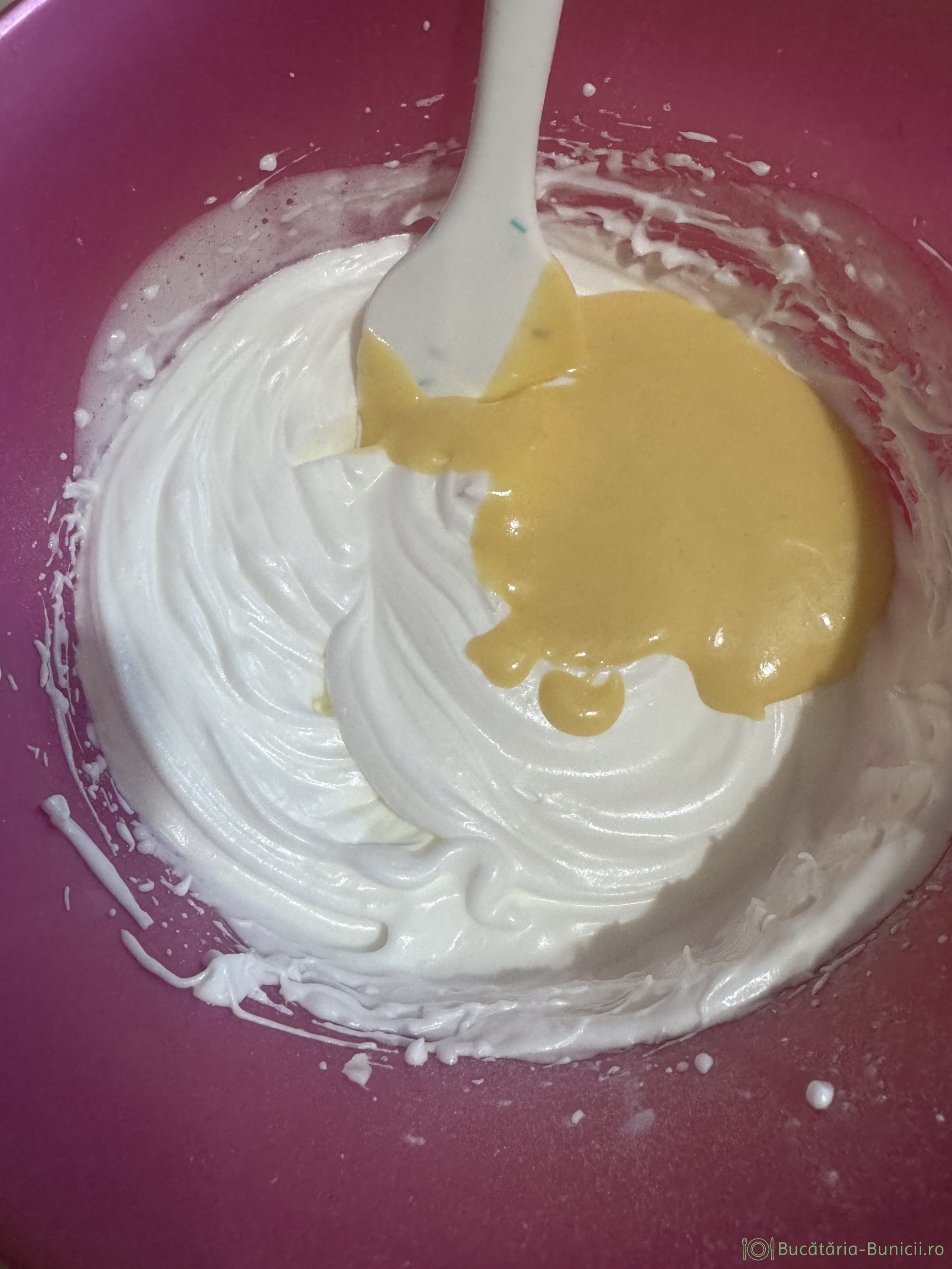 - Se lasă mixerul deoparte, iar peste bezea se adaugă în trei tranșe crema de gălbenușuri, amestecând ușor cu spatula.