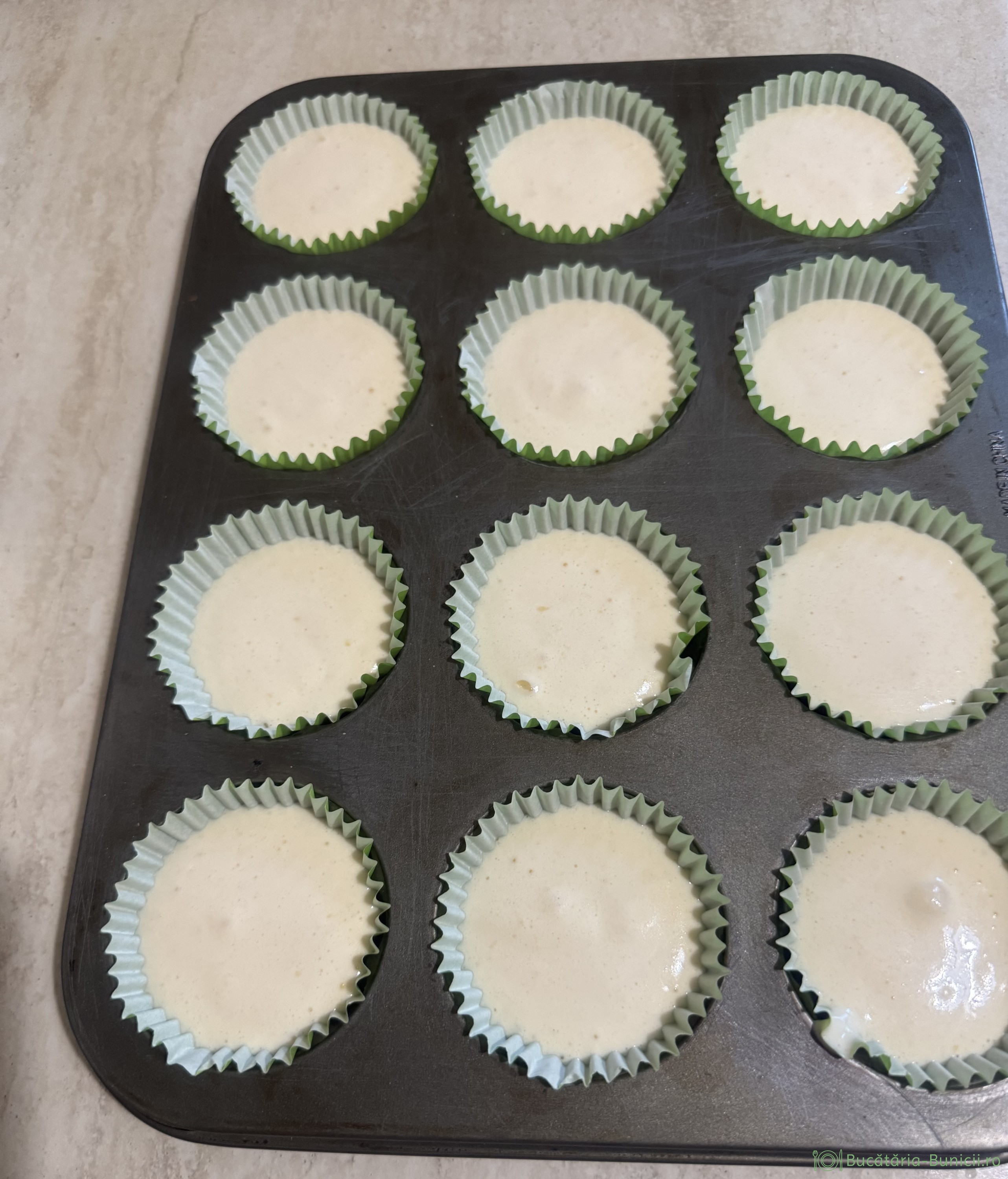 - Compoziția obținută se pune într-un posh, sau o pungă mai groasă, care se taie la un colț. Se umplu formele de brioșe pe 3/4, folosind poshul, care se va strânge la vârf, de fiecare dată, când mutam poshul de la o formă la alta, să nu curgă compoziția pe alături, pentru ca este foarte fluidă și curge repede.