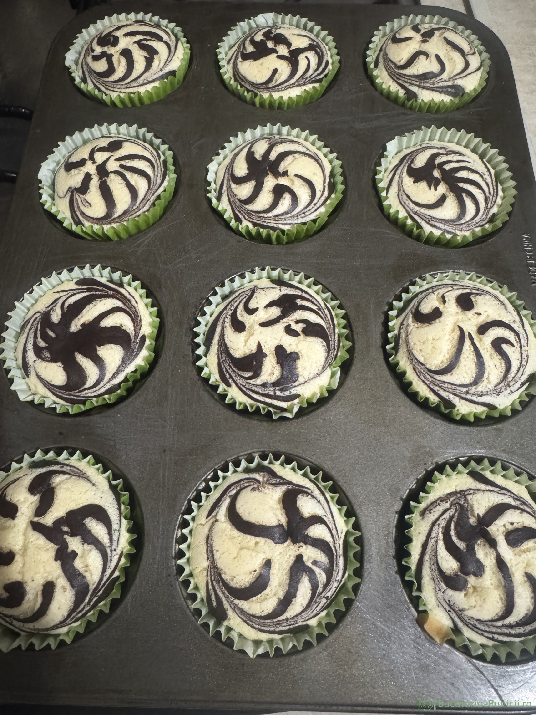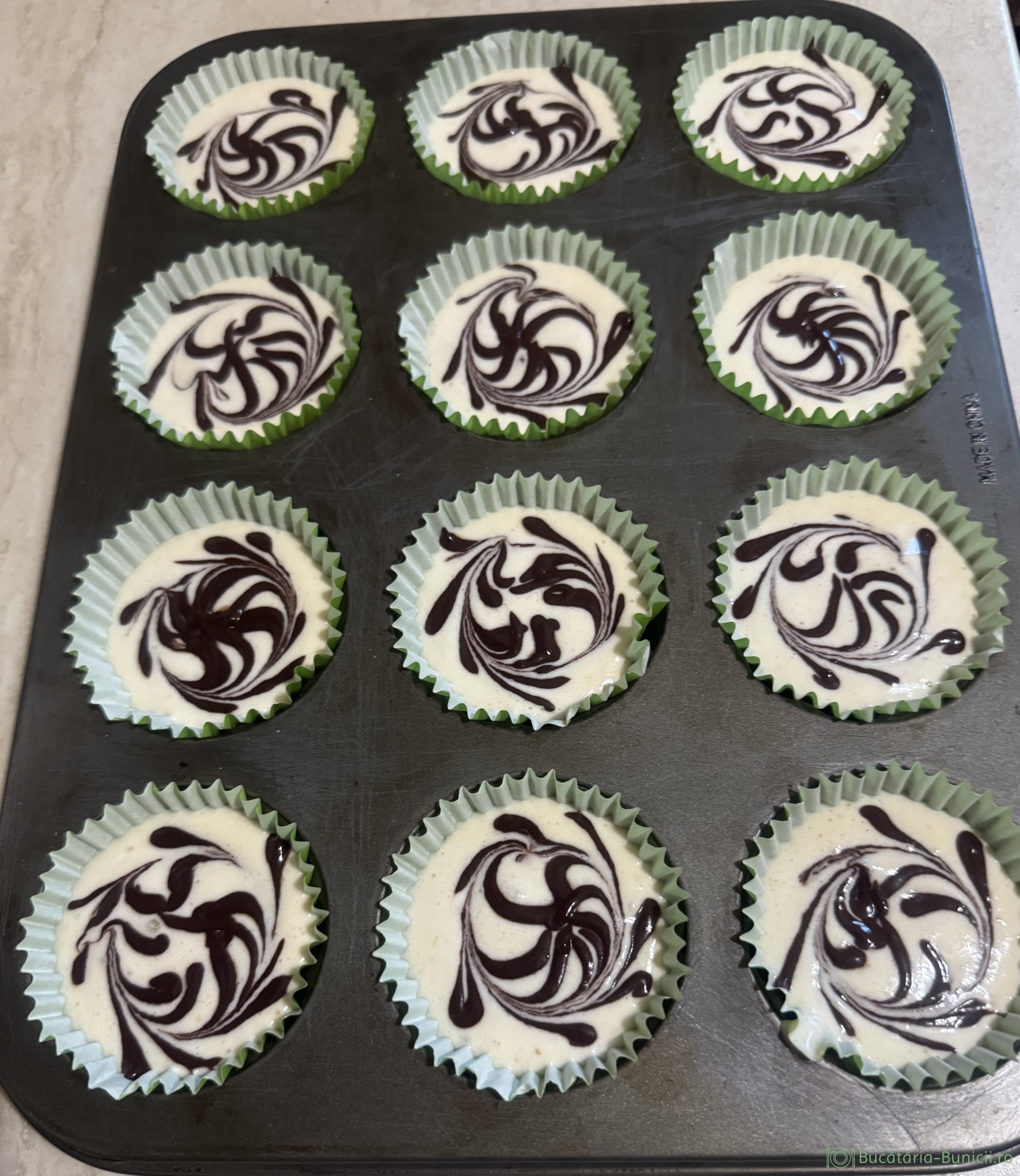 - Compoziția maro se pune într-o pungă, se strânge bine și se înțeapă într-o parte, cu o scobitoare, să formăm o gaură micuță, prin care va curge compoziția cu cacao. Vom face pe fiecare brioșă, câte 5-6 linii maro, pornind din centrul briosei spre margine (vezi galeria foto), apoi cu scobitoarea se trasează un cerc de la o linie maro la alta. Vom forma un model deasupra fiecărei brioșe.