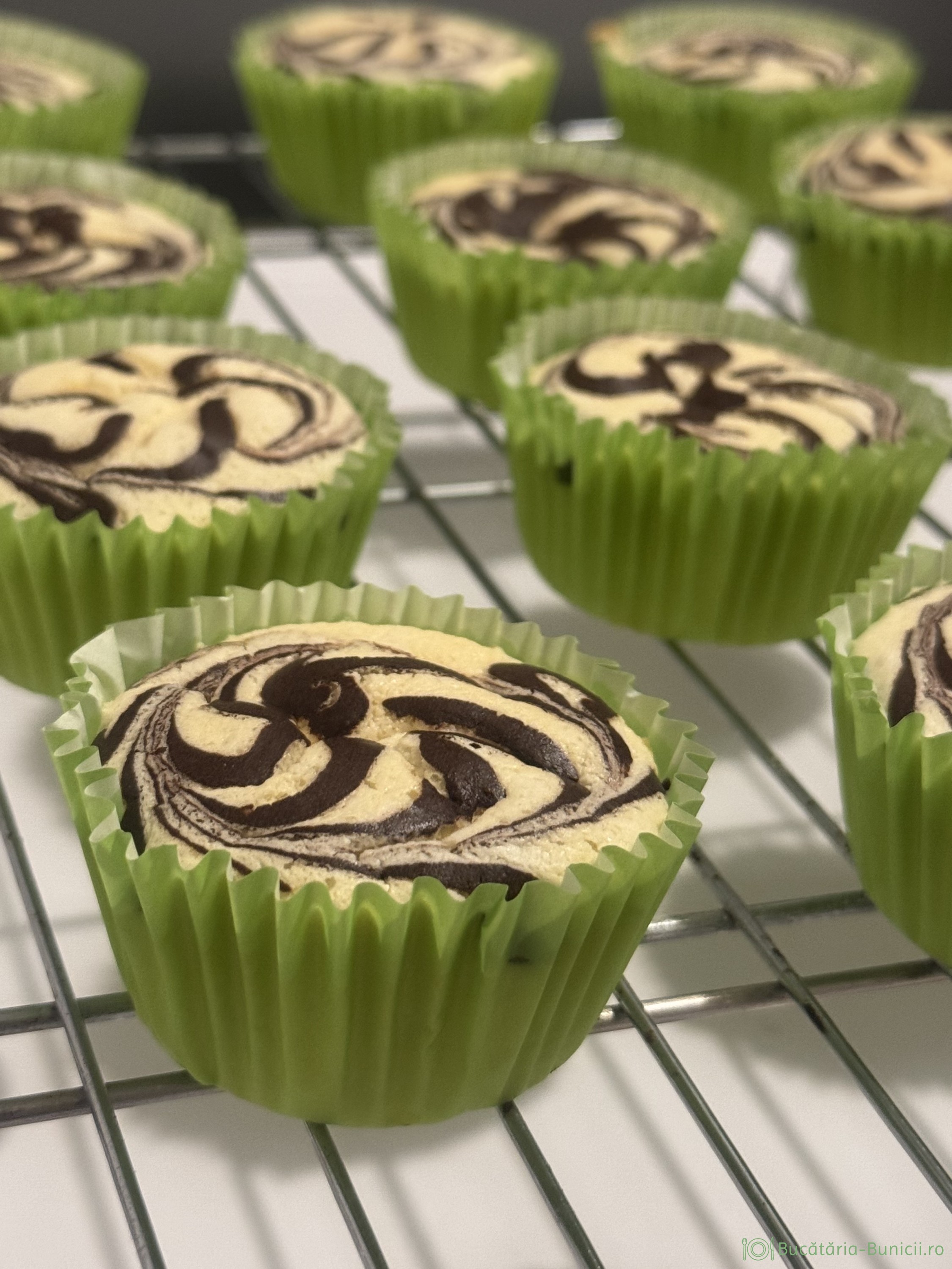 - Se dă tava în cuptorul preîncălzit deja la 110 grade, dar ridicăm temperatura la 140 grade, fără ventilație și coacem brioșele 20 minute. Ele trebuie, să rămână deschise la culoare.