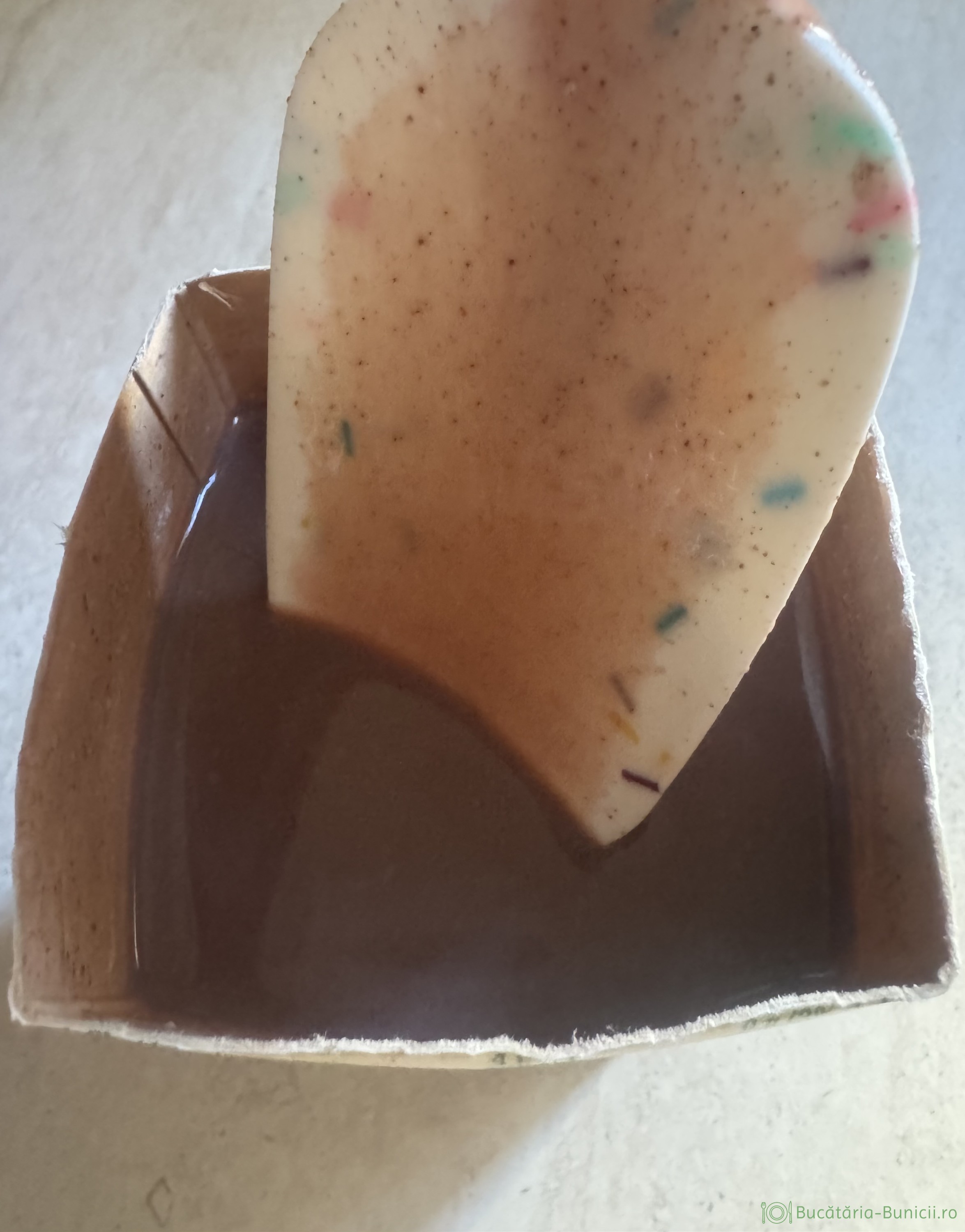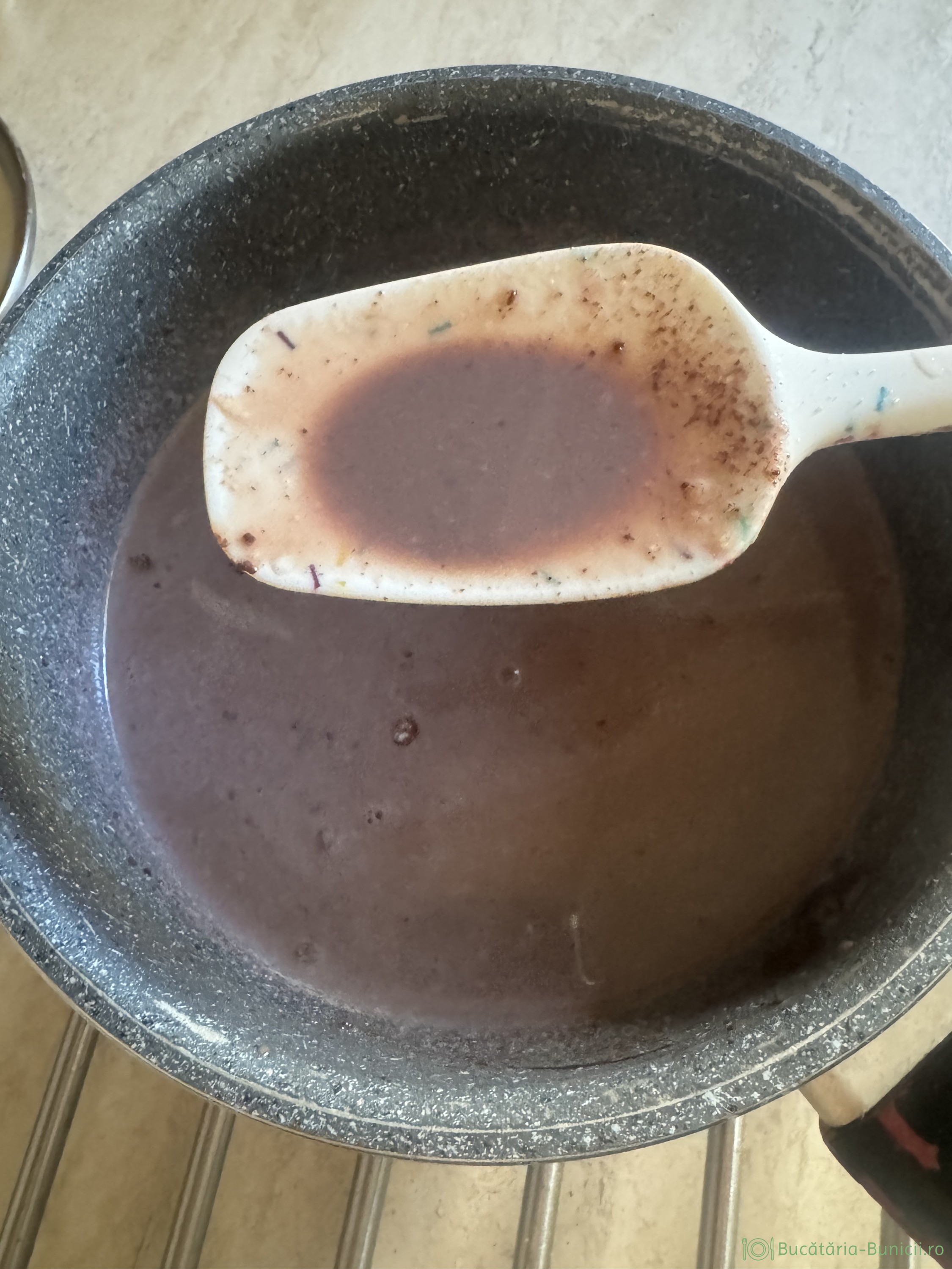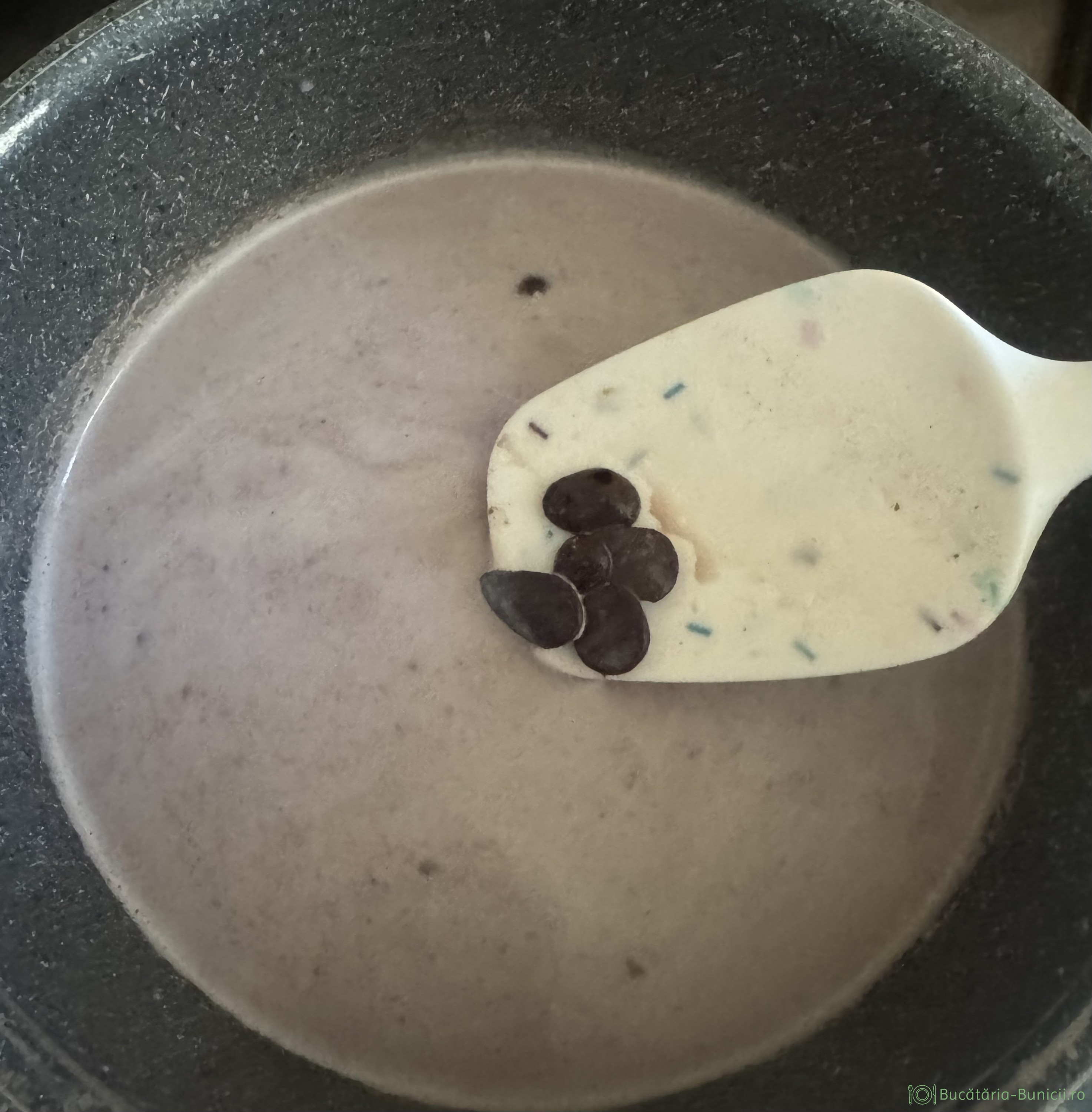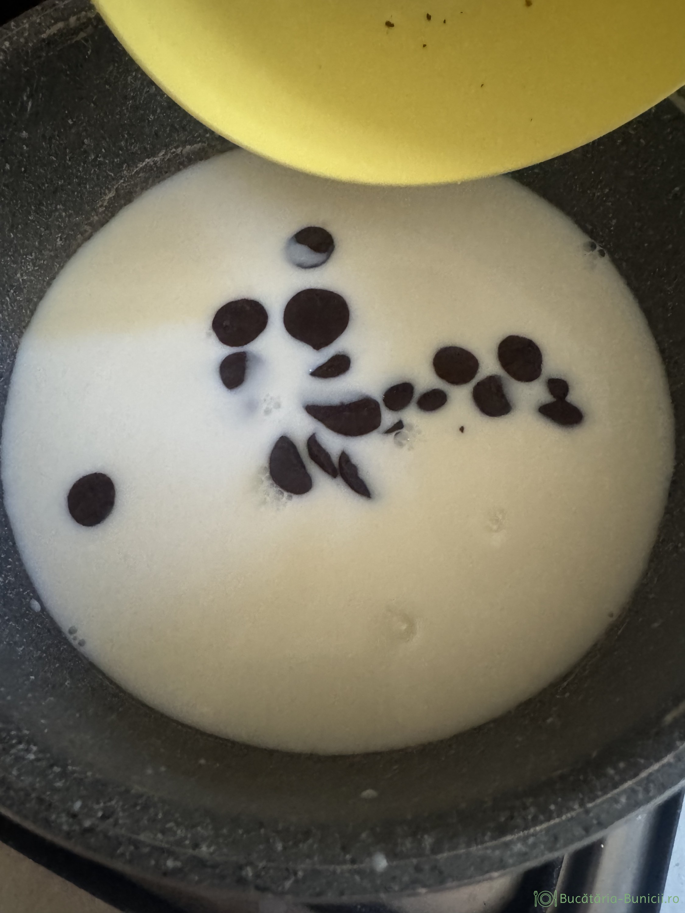 - Când laptele este fierbinte, se oprește focul și se pun bănuții de ciocolată neagra.