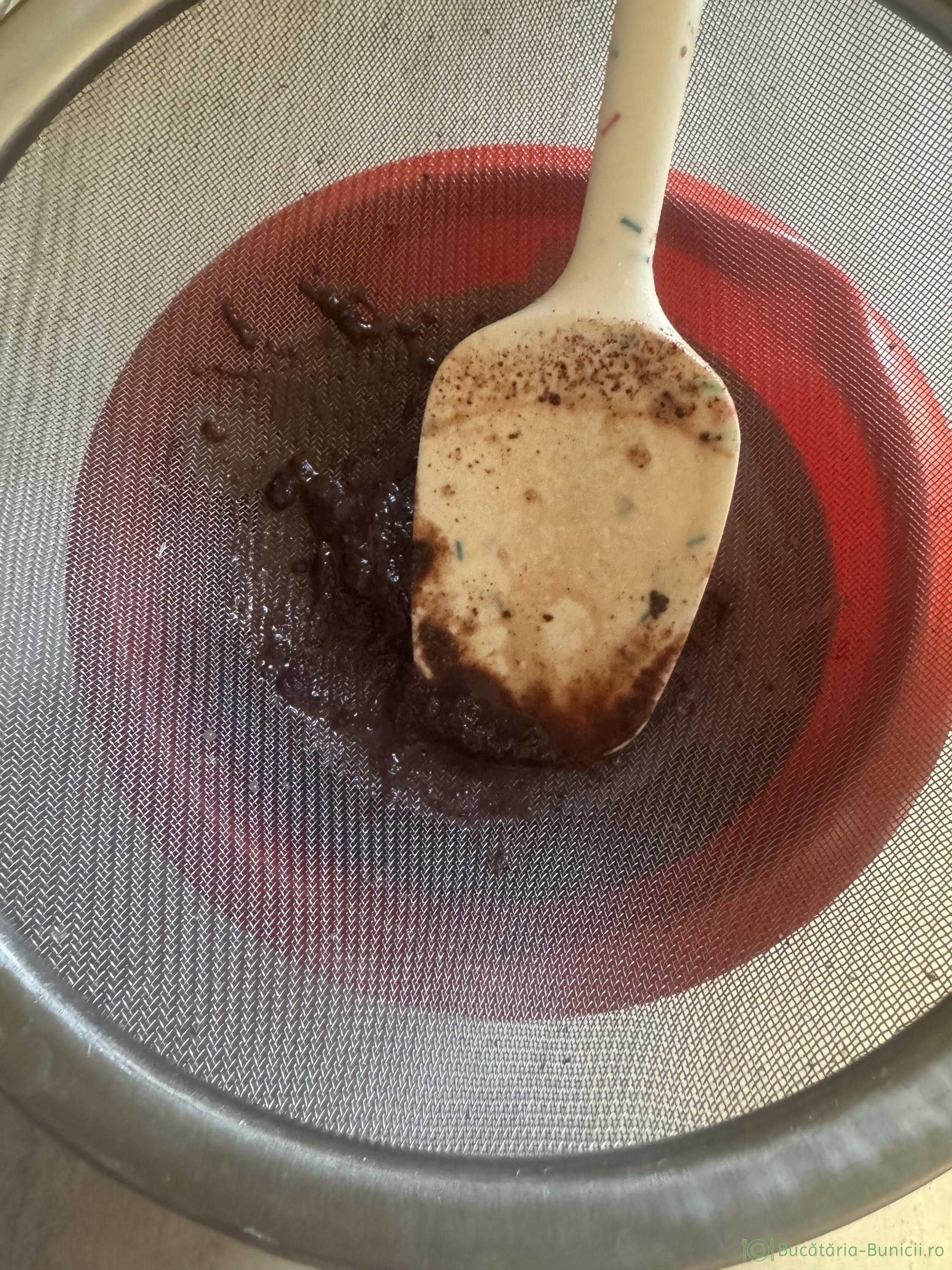 - La final vom trece laptele prin sita de două ori, iar granulele de ciocolată rămase, dar care sunt moi, le vom pasa cu dosul lingurii, să treacă prin sita (vezi galeria foto).