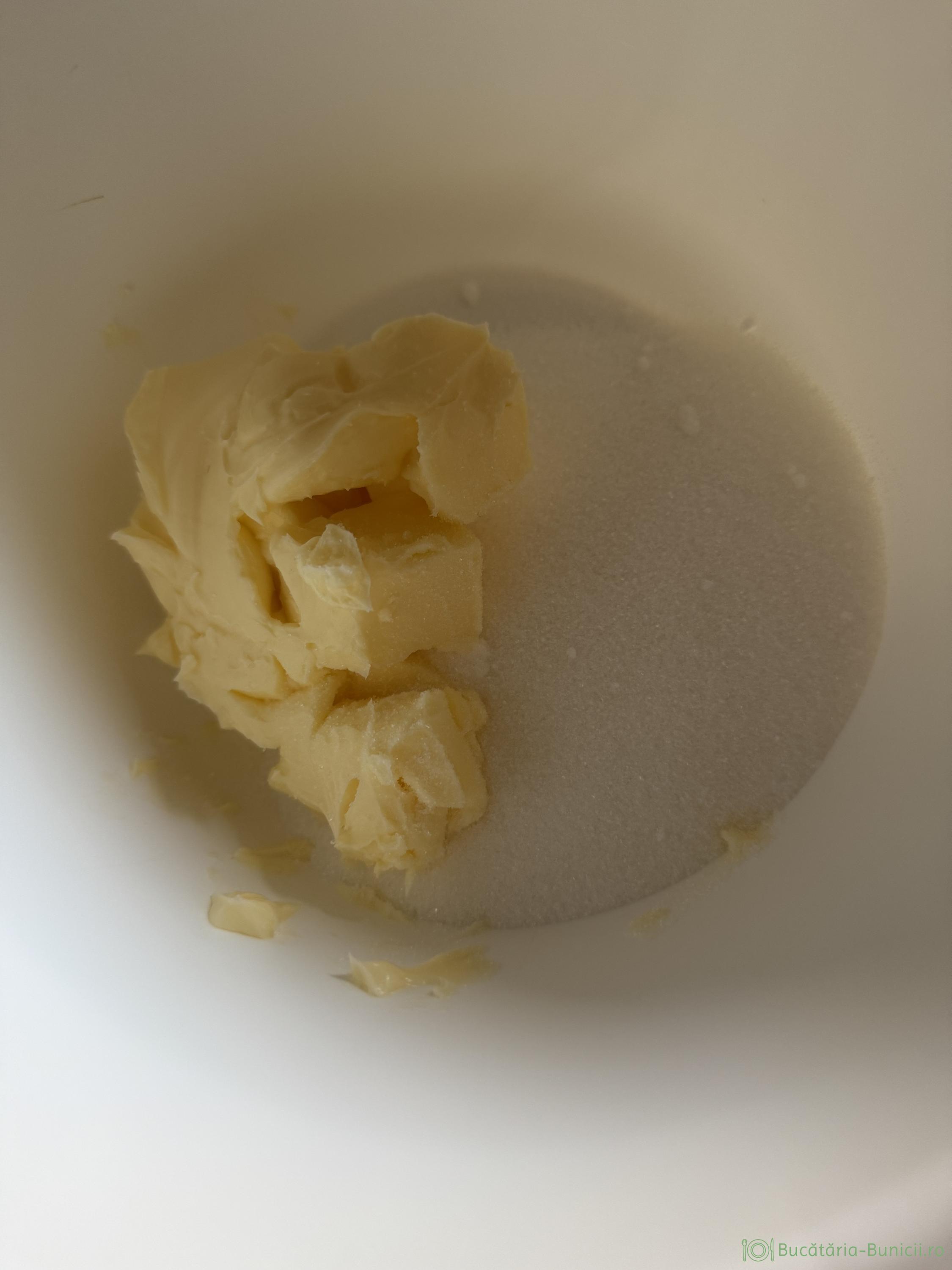 - Untul moale, dar încă solid, se mixează cu zahărul, timp de 5-6 minute, până se deschide la culoare și devine spumos.