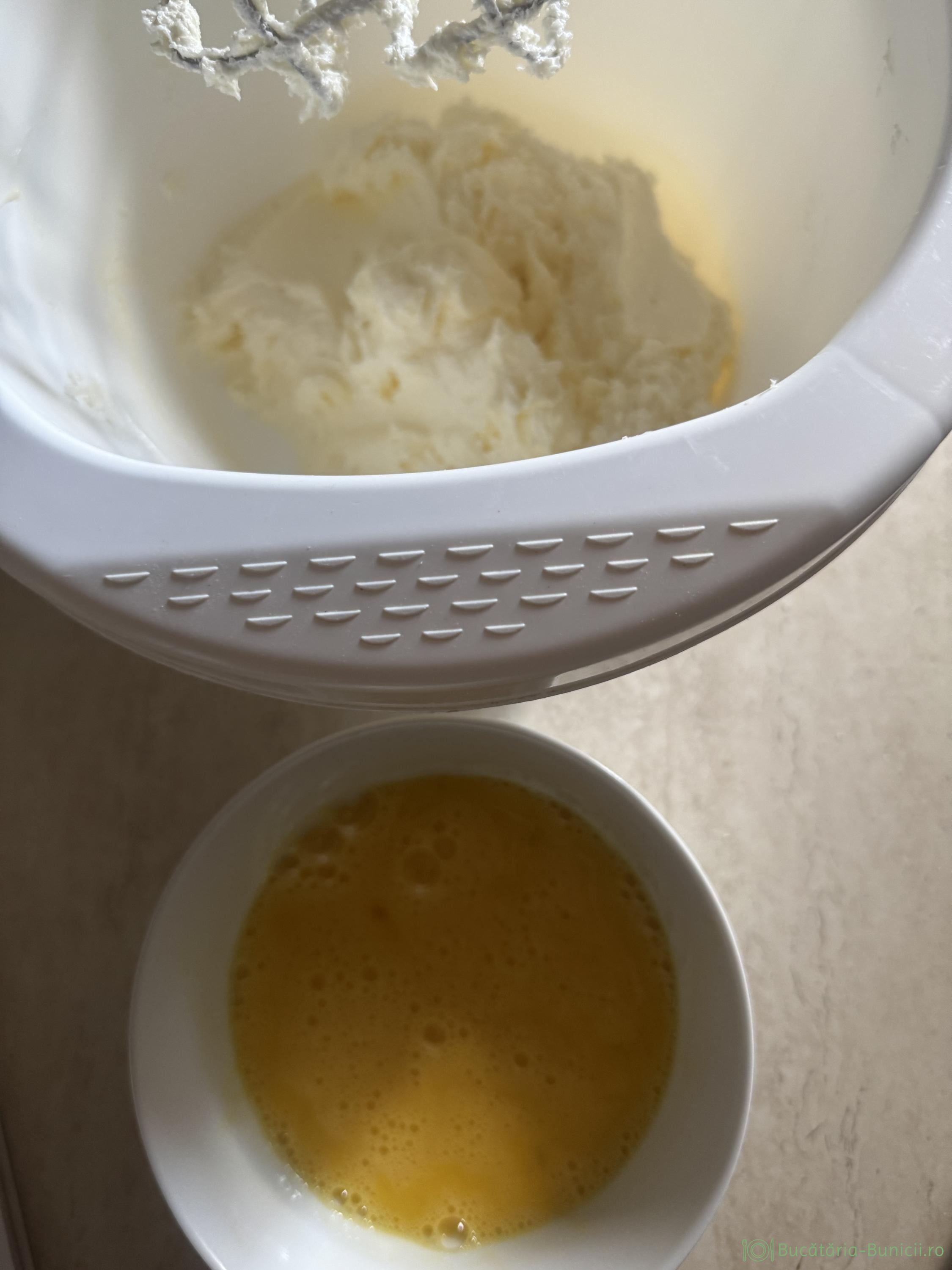 - Se adaugă în patru tranșe ouăle bătute, mixând, după fiecare tranșă, până se încorporează perfect cantitatea de ou, în crema de unt.