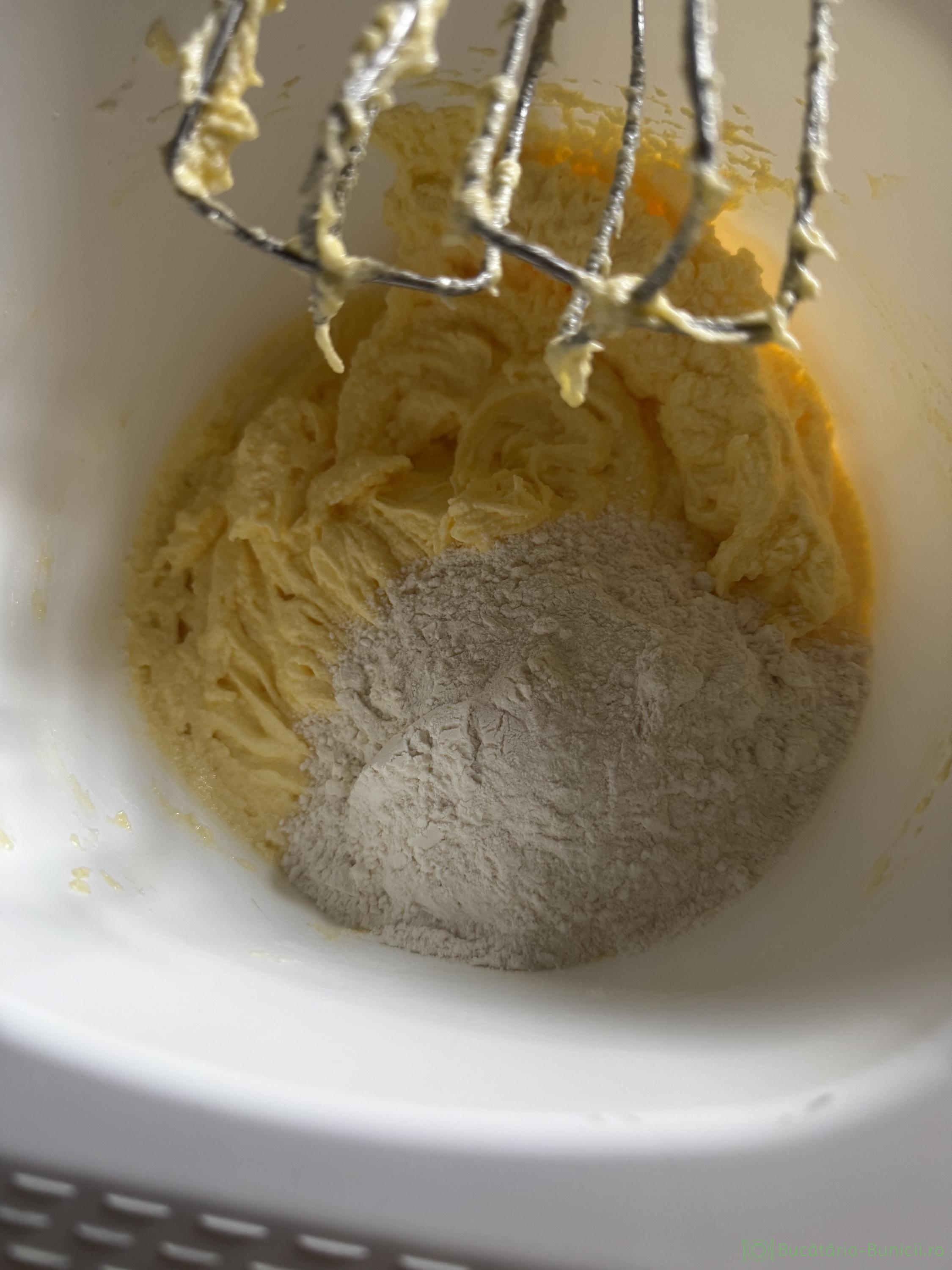 - La final se adaugă în trei tranșe făina și laptele, adăugând intercalat făină, lapte, făină, lapte etc…, mixând scurt după fiecare tranșă de făină și lapte.
