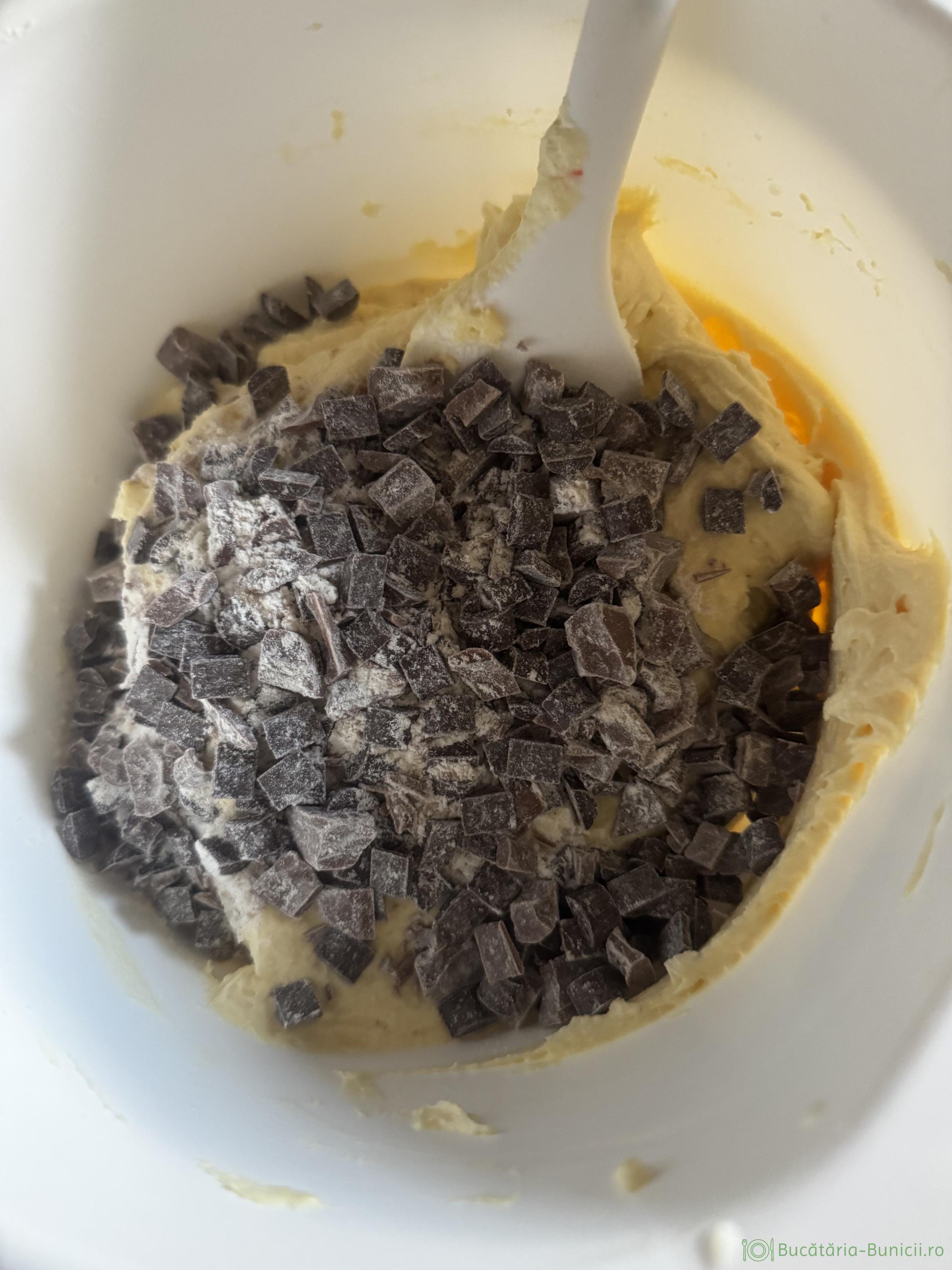 - Se lasă mixerul deoparte, se adaugă ciocolata trecută prin făină, iar cu paleta de silicon se amestecă ușor.