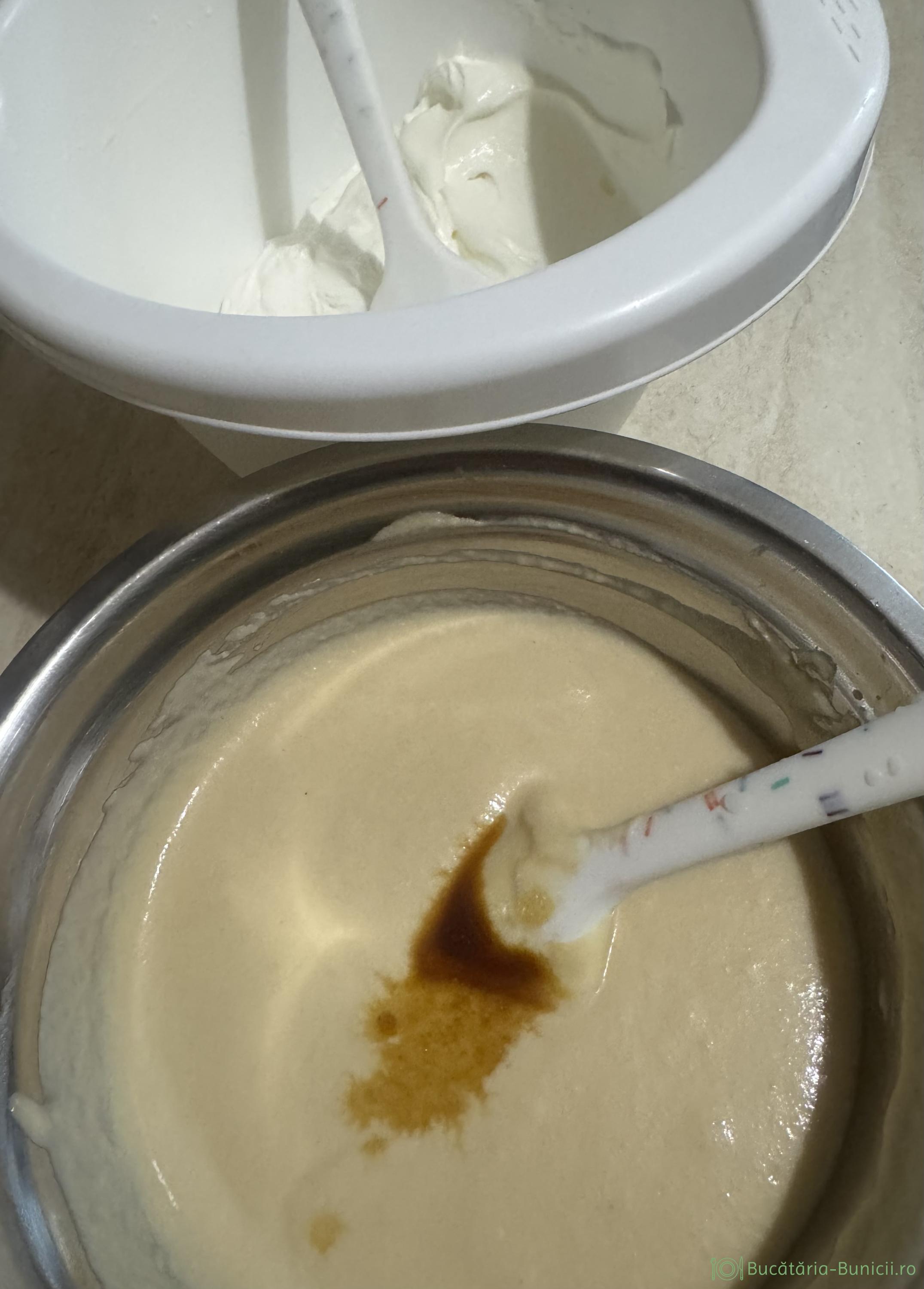 - Se mixează smântâna pentru frișcă, împreună cu zahărul pudră, până începe, să prindă forma, fără să aibe consistență de frișcă fermă.