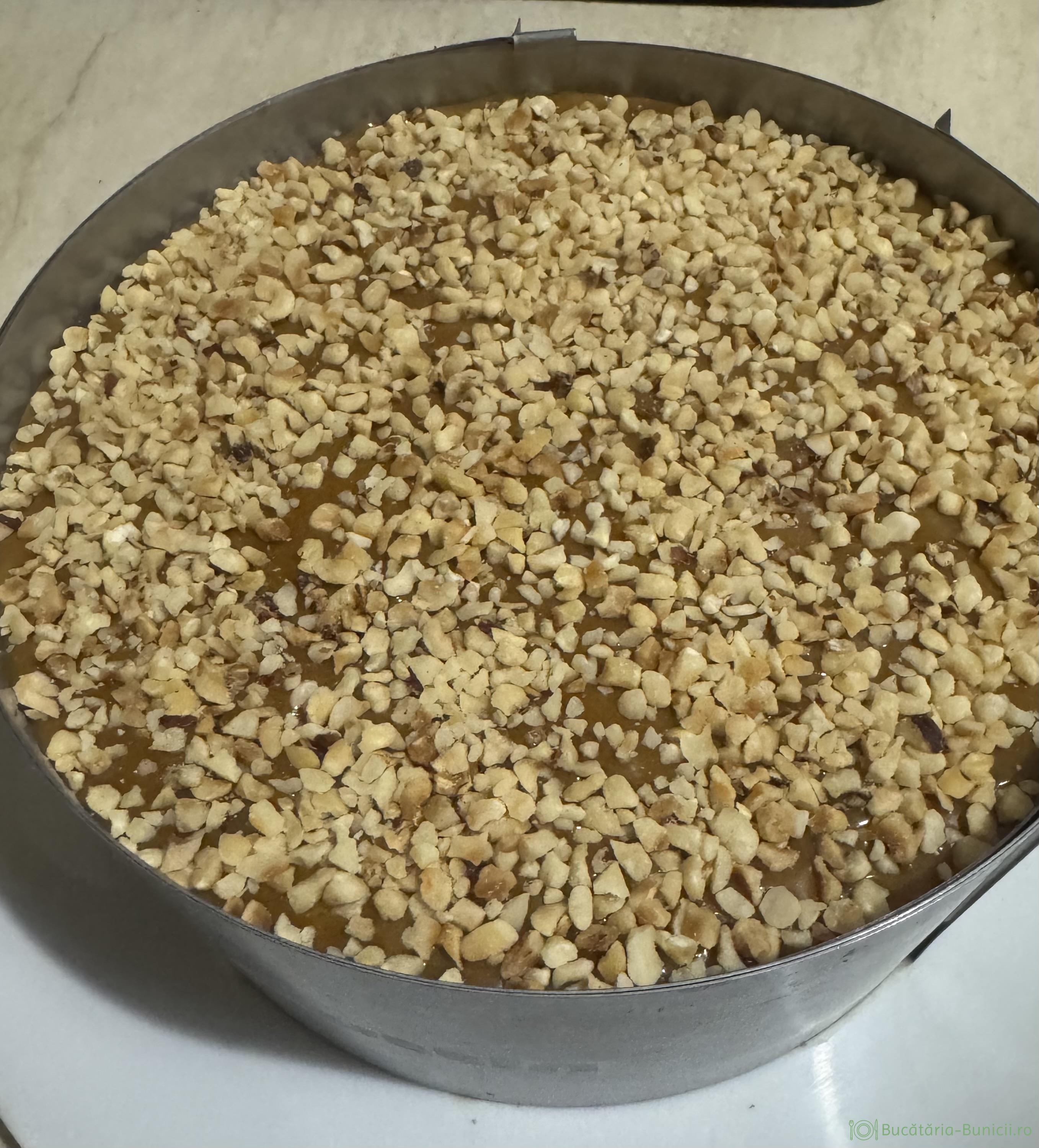 - Peste glazură presărăm alune, sau nuci tocate, iar cu dosul lingurii apăsăm peste alune, să intre ușor în glazură.