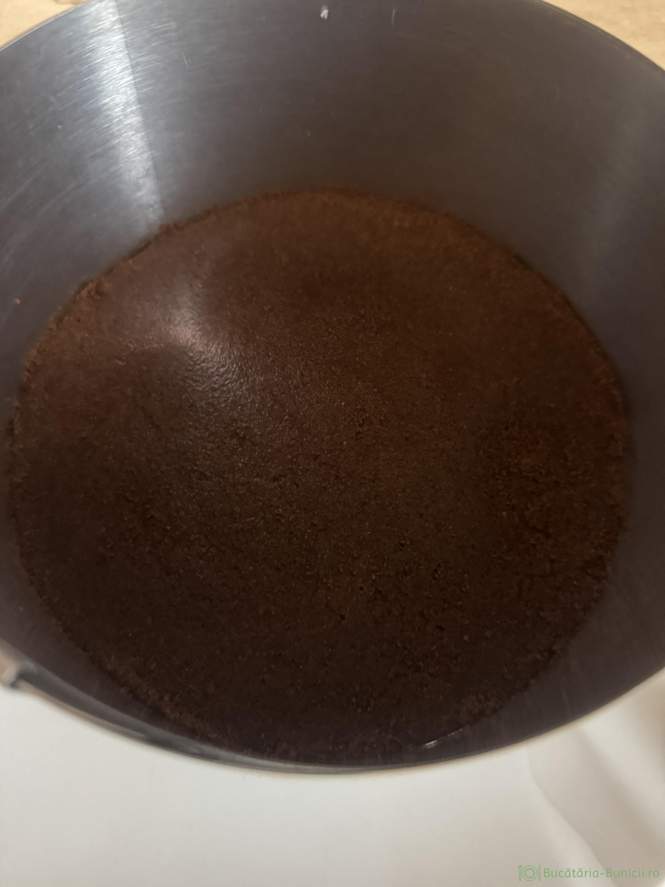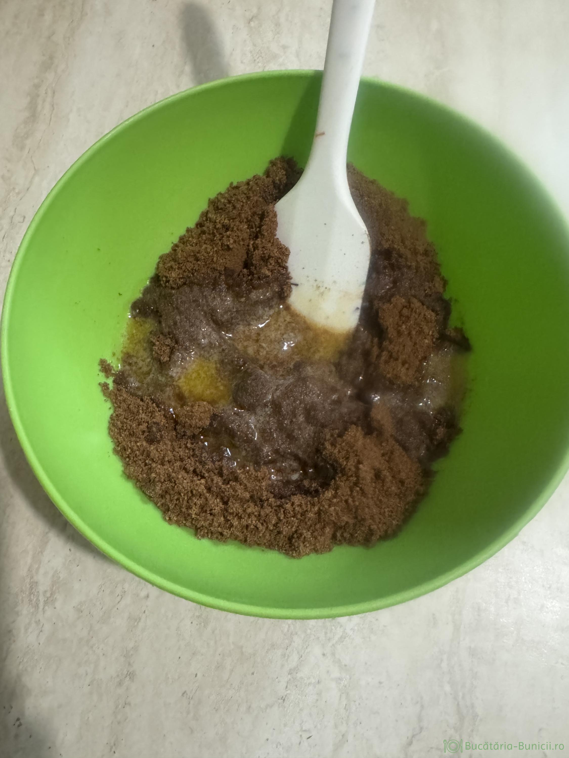 - Se răstoarnă într-un vas, iar peste biscuiții măcinați se toarnă unt topit. Se amestecă și obținem o compoziție nisipoasă.