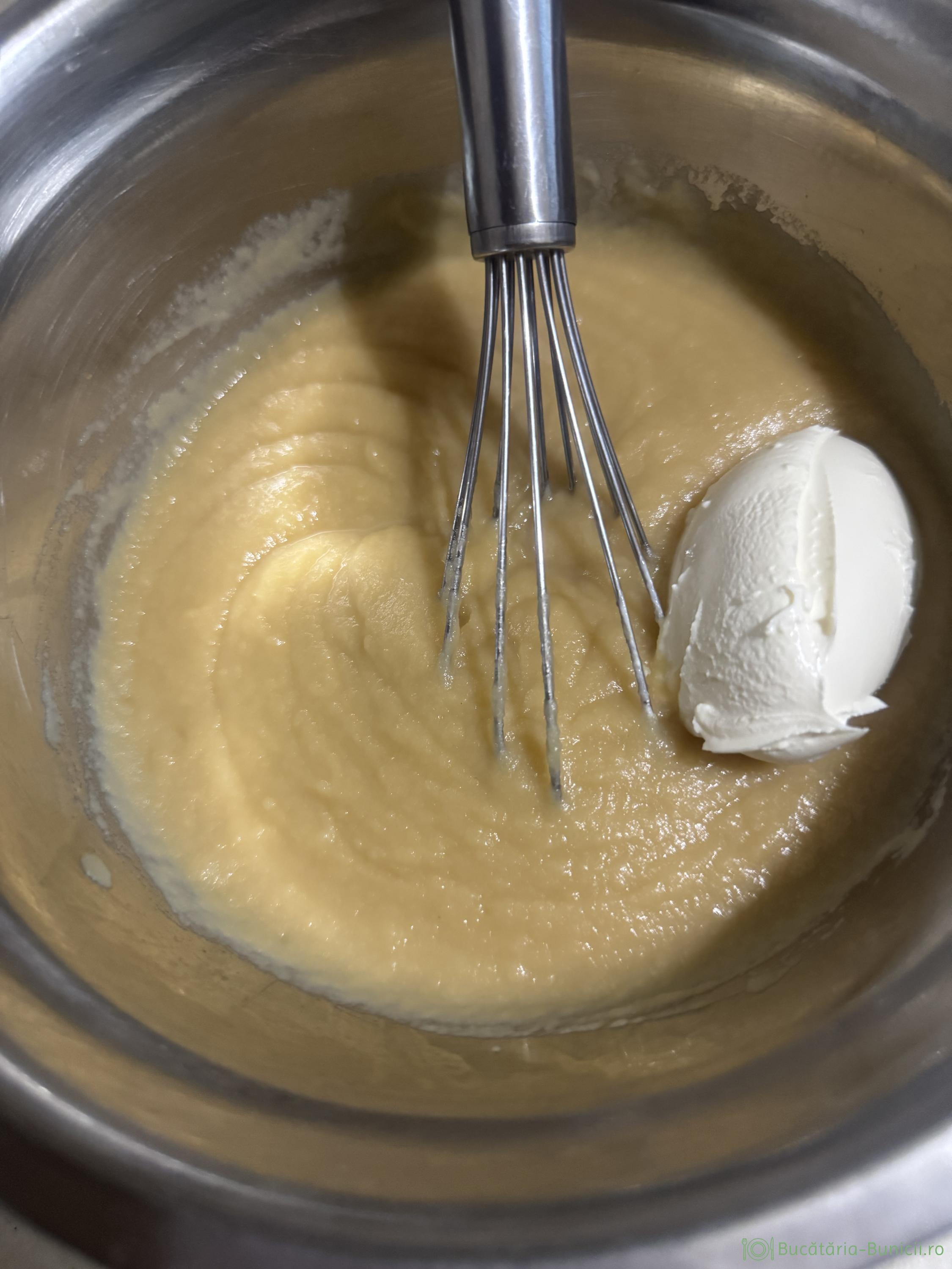 - Peste piureul care a ajuns la temperatura camerei, se încorporează treptat mascarpone, amestecând cu un tel. Mascarponele se scoate de la frigider din timp, să nu fie rece.