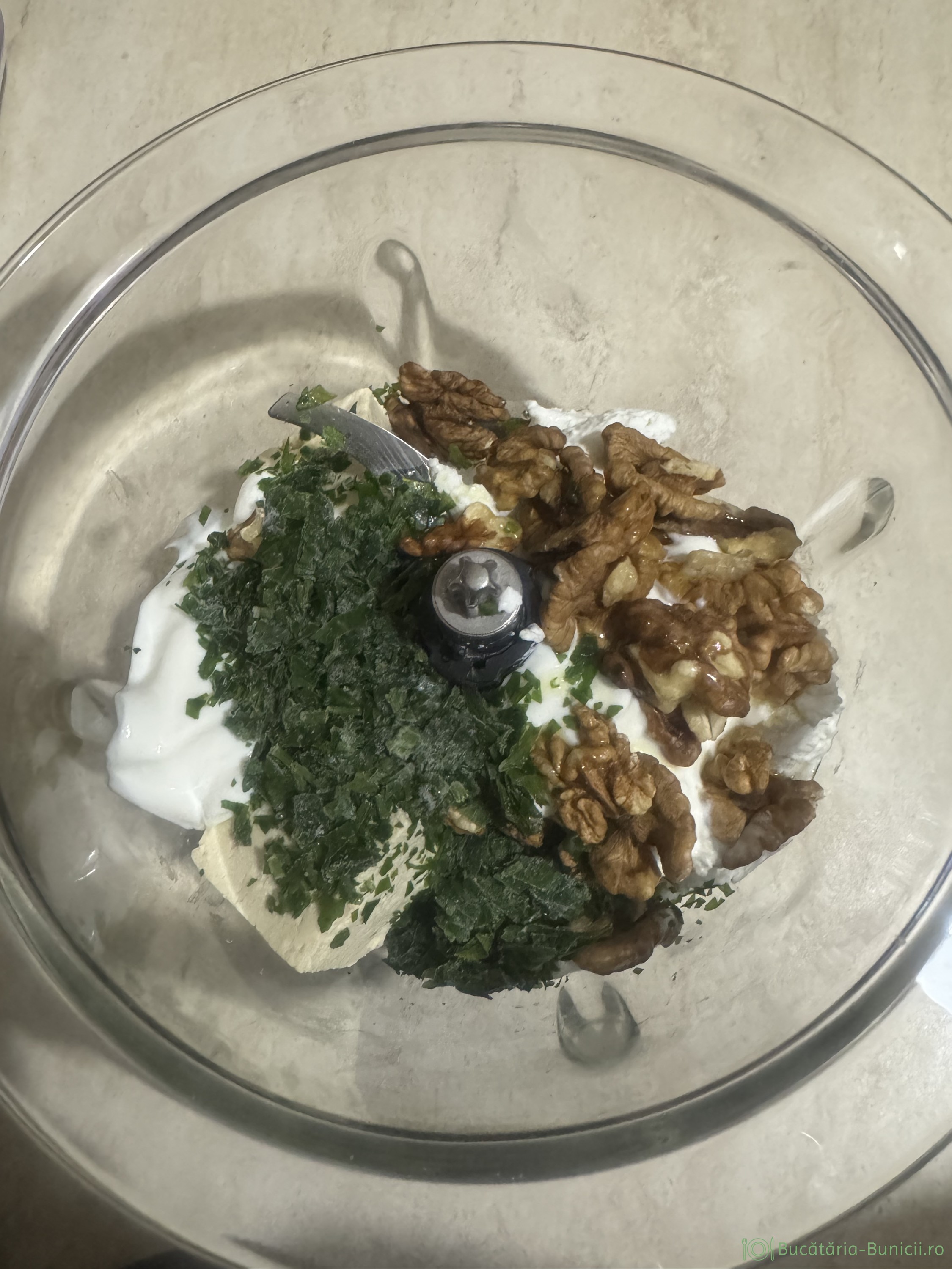 - Toate ingredientele se pun într-un procesor și se amestecă, până obținem o cremă uniformă. La final se gustă, dacă e nevoie de sare, tofu fiind sărat, nu am pus sare până acum.