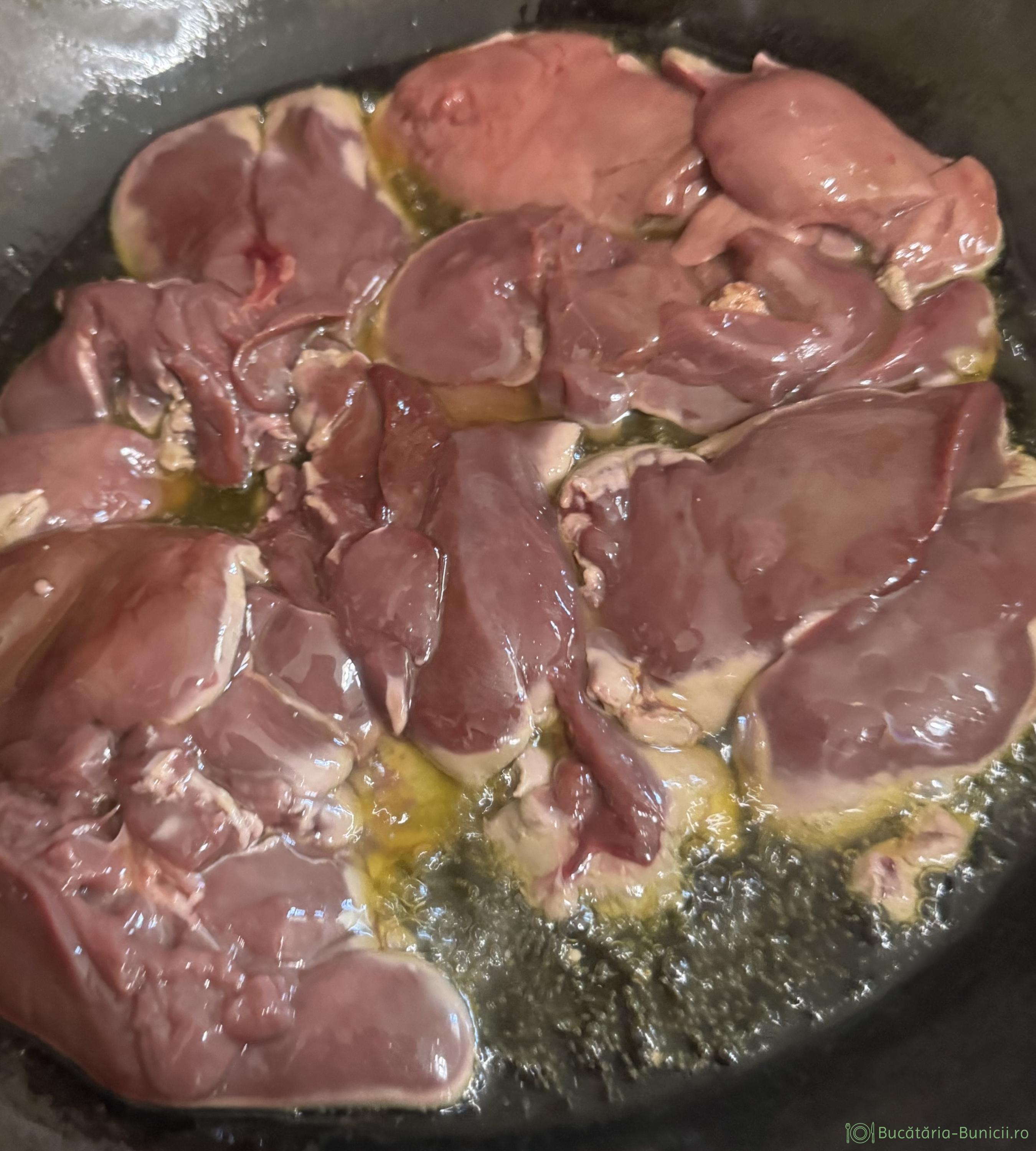 - Într-o tigaie antiaderenta se pune uleiul de măsline și se înfierbântă, la foc mediu. Se adaugă ficatul șters bine de surplusul de apă și se găteste timp de 10-12 minute maxim, întorcându-l pe ambele părți.