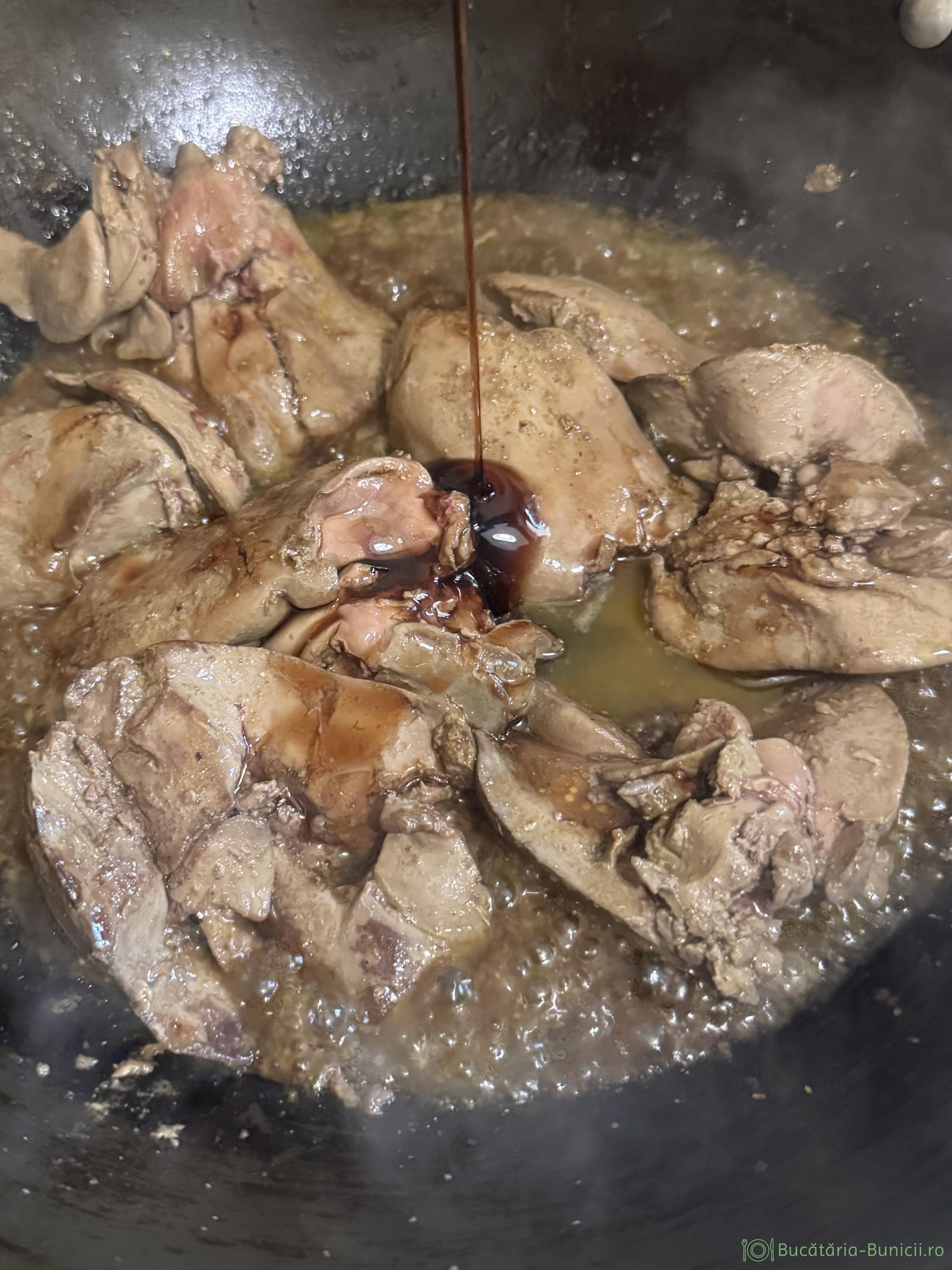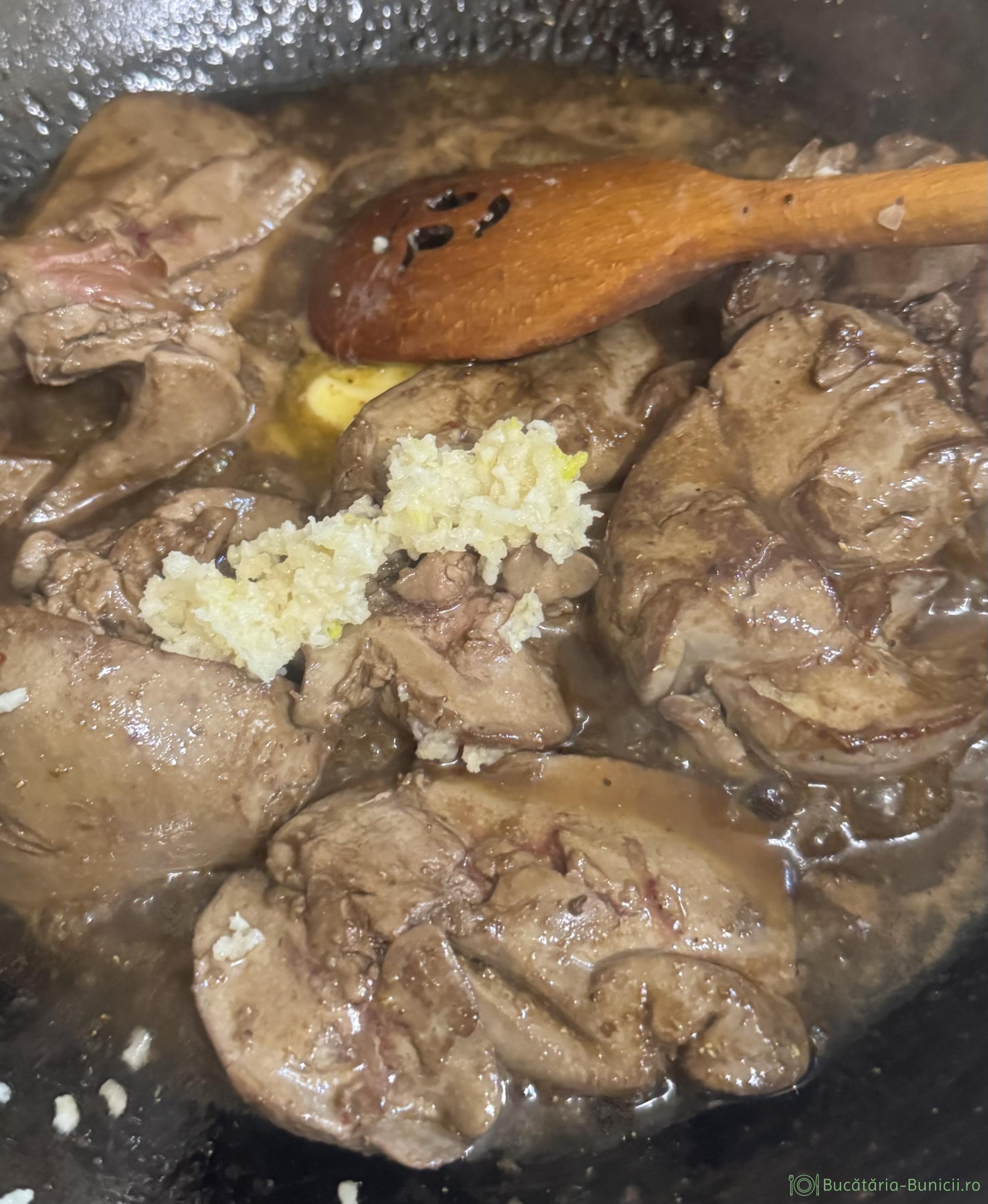 - În acest timp se adaugă zeama de lămâie peste ficatul din tigaie. La final se pune siropul de rodie, apoi untul și cățeii de usturoi trecuți prin presa. Se încorporează toate în ficatul gătit, se condimentează cu sare, piper și cimbrișor, se oprește focul și se lasă tigaia acoperită câteva minute.