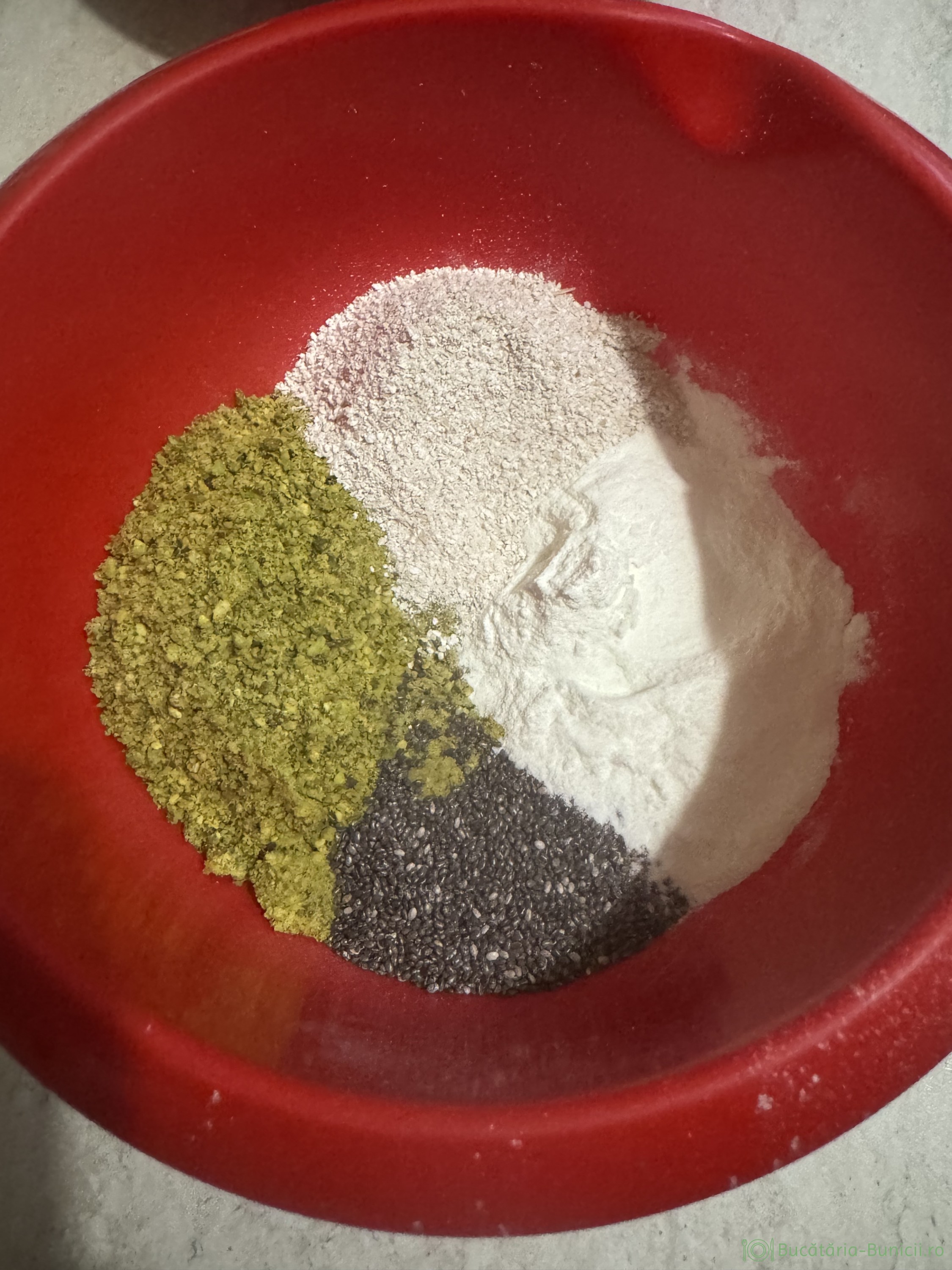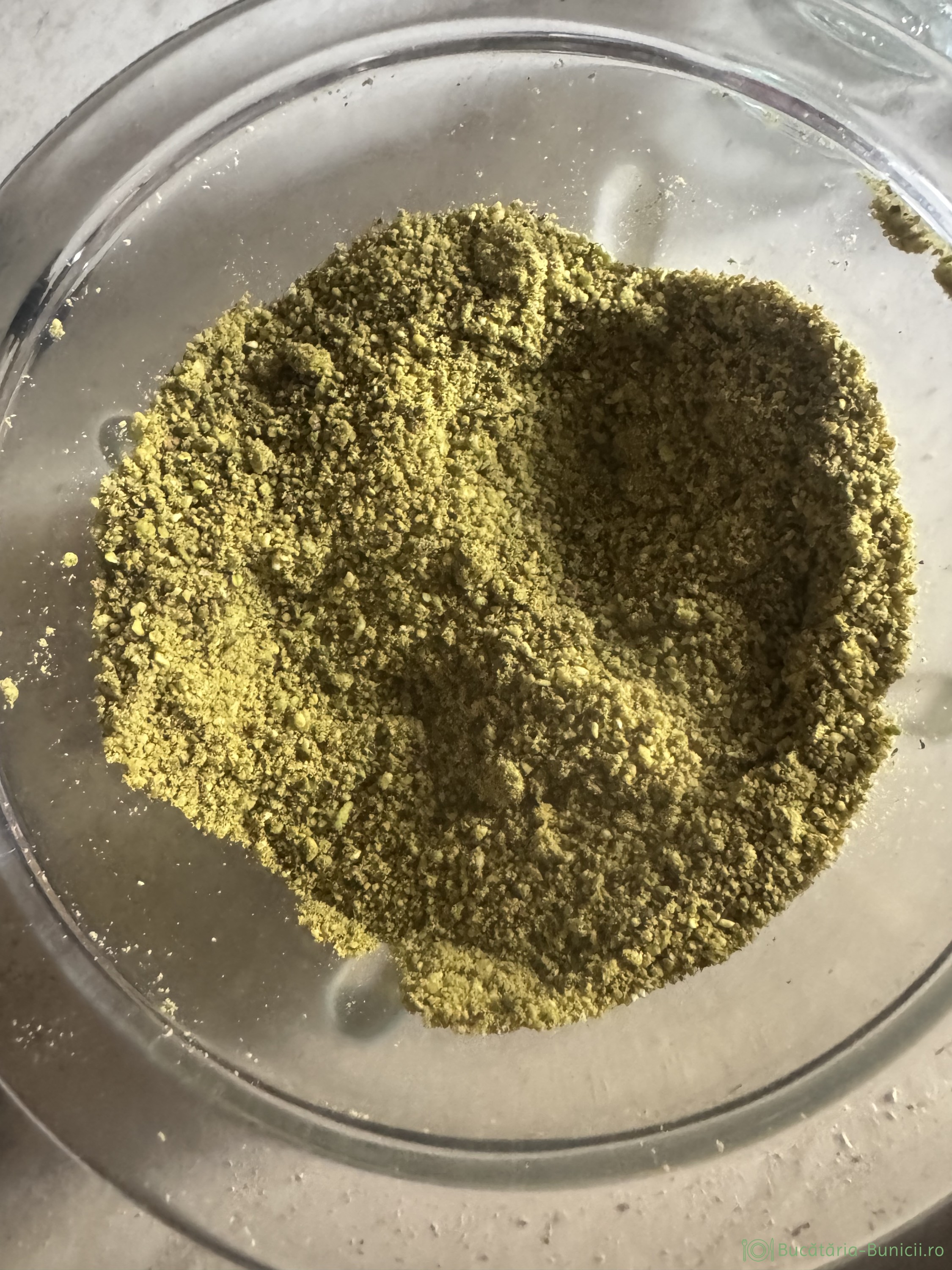 - Ingredientele uscate se amestecă împreună (tarate, fistic, lapte praf, chia).