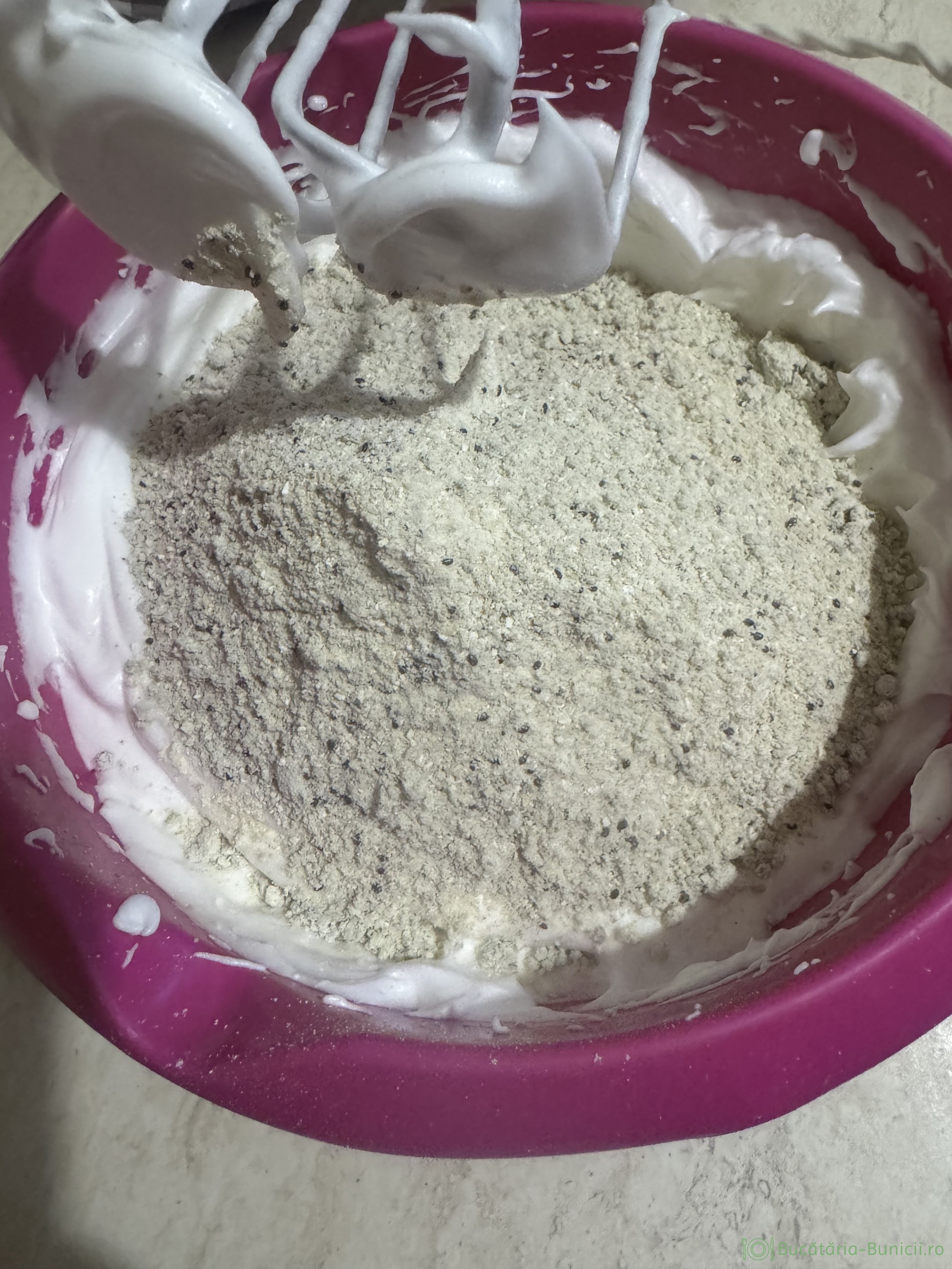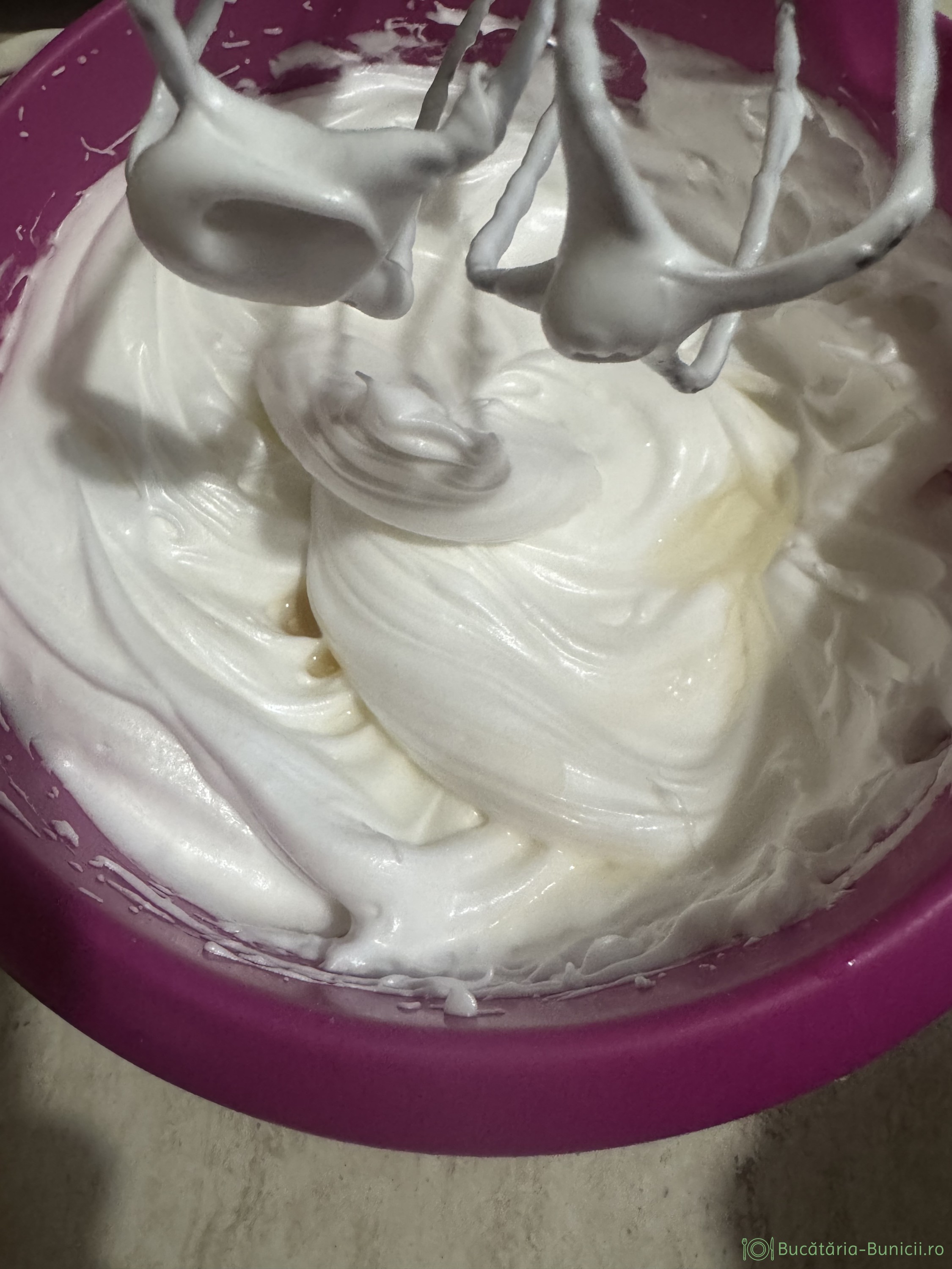 - Se bat albușurile cu un praf de sare, iar când devin ferme se adaugă îndulcitorul, mixând, până obținem o bezea tare.
