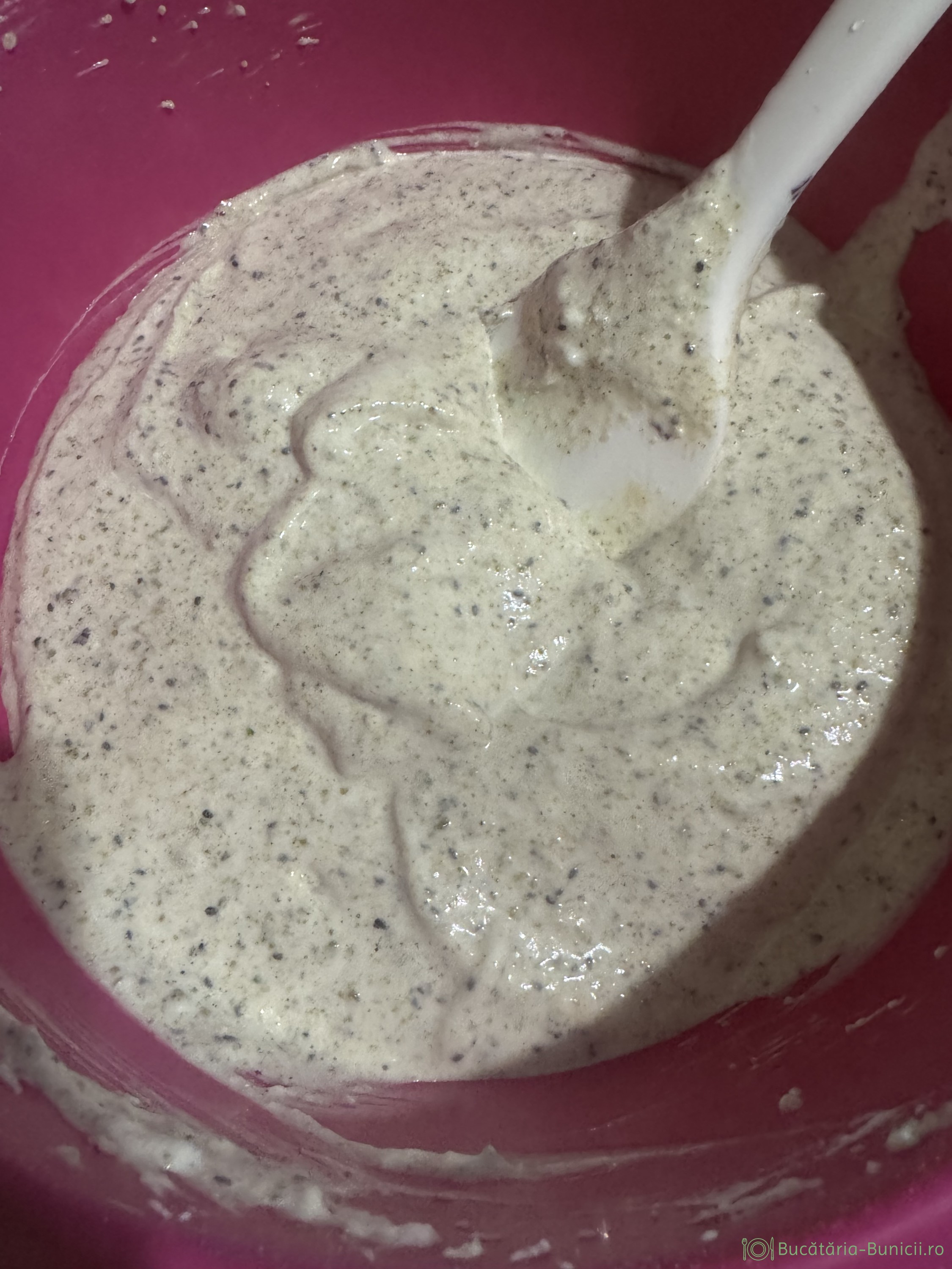 - Se încorporează cu spatula, pe rând: oțetul, esența, iar la final ingredientele uscate.