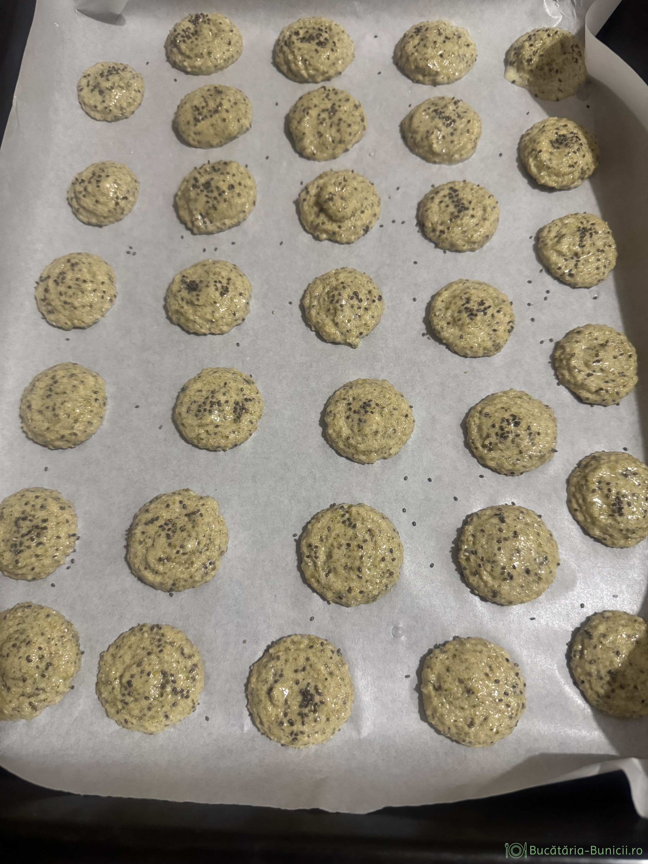 - Compoziția obținută se pune în posh cu dui rotund de 1 cm și se formează fursecuri, cu distanța între ele, direct pe foaia de copt din tavă. În lipsa poshului, se folosește o linguriță, luând din compoziție și așezând mici grămăjoare pe hârtie.