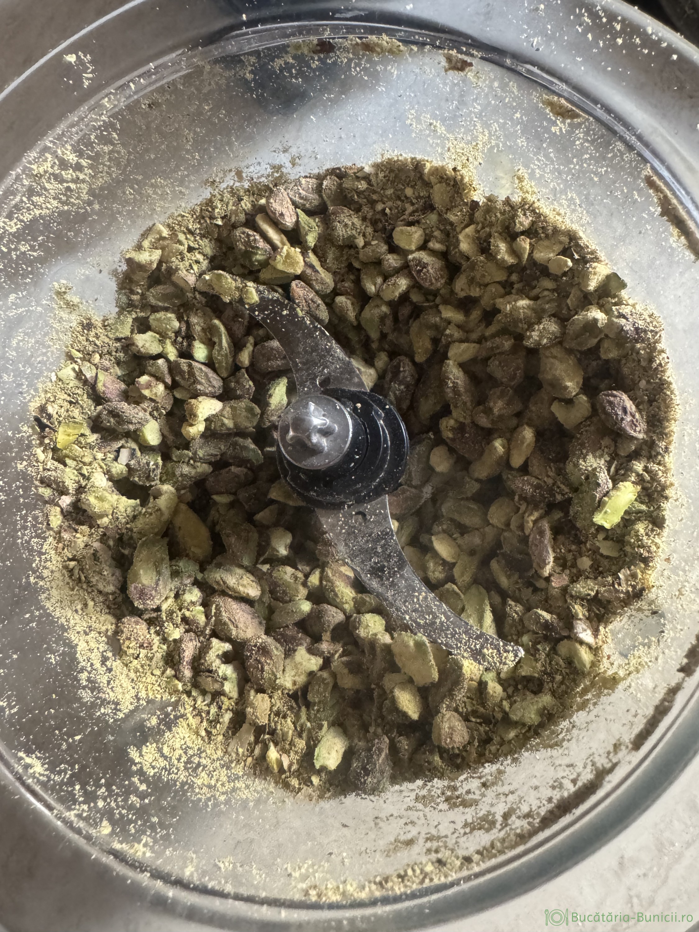 - În râșnița de cafea, sau alt aparat se macină separat fisticul crud și taratele de ovăz.