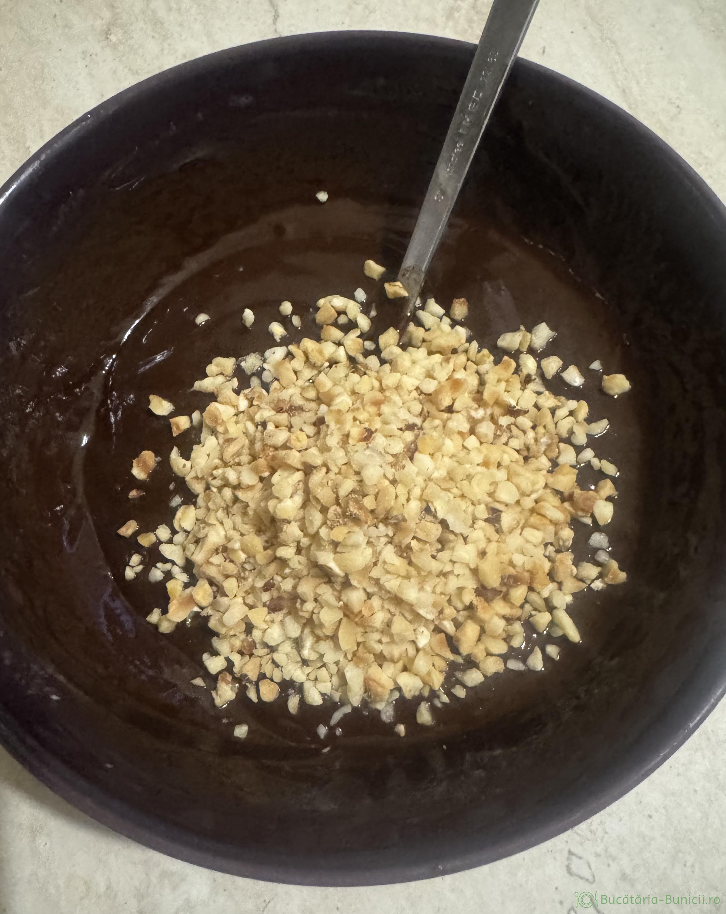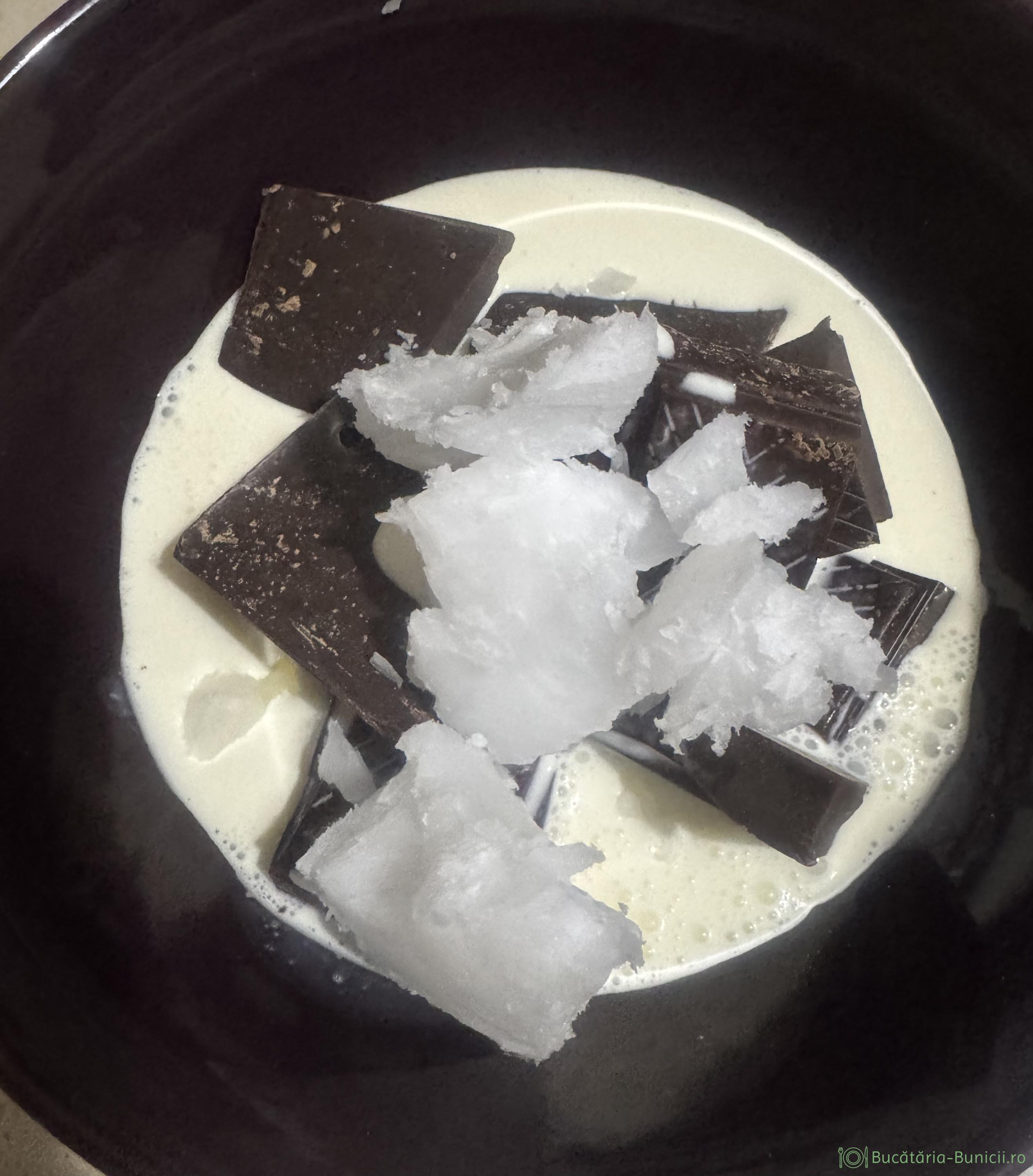 - Într-un vas se pune ciocolata ruptă bucăți, frișca lichidă și uleiul de cocos. Se pune vasul pe baia de abur, sau se dă în cuptorul cu microunde în reprize scurte, până se înfierbântă smântână. Se lasă 3-4 minute, apoi se amestecă energic, până obținem un sos fin și catifelat. Se încorporează alunele tocate.