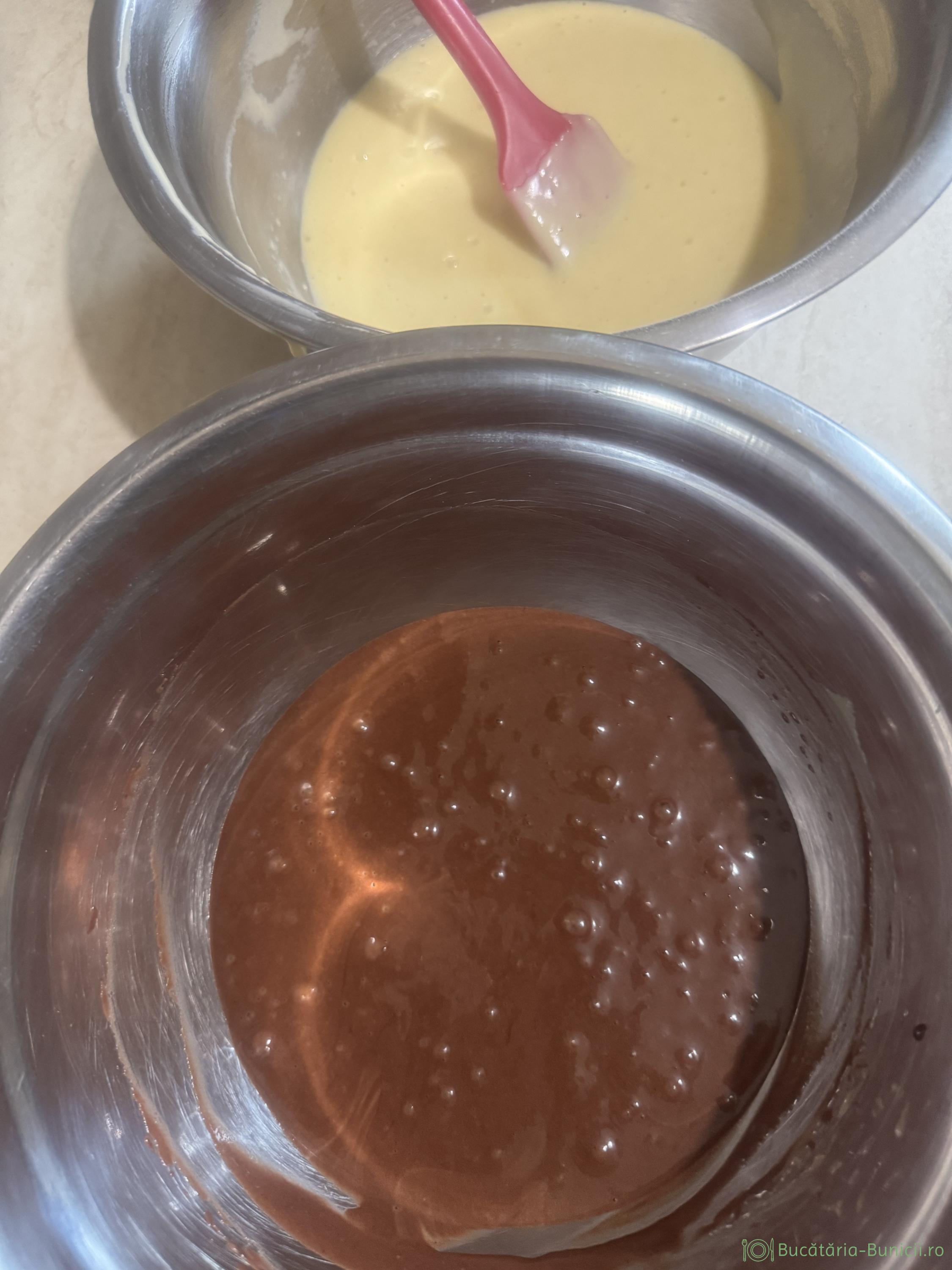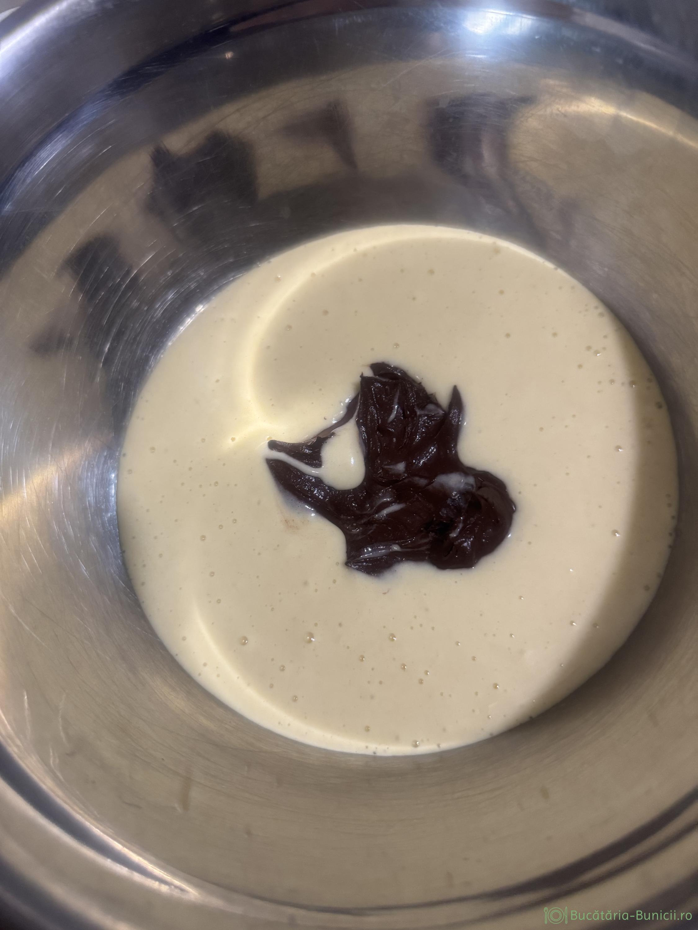 - Compoziția obținută se împarte în două. În 1/2 de compoziție se pune extract de vanilie, iar în cealaltă jumătate se încorporează sosul de cacao și esență de rom.