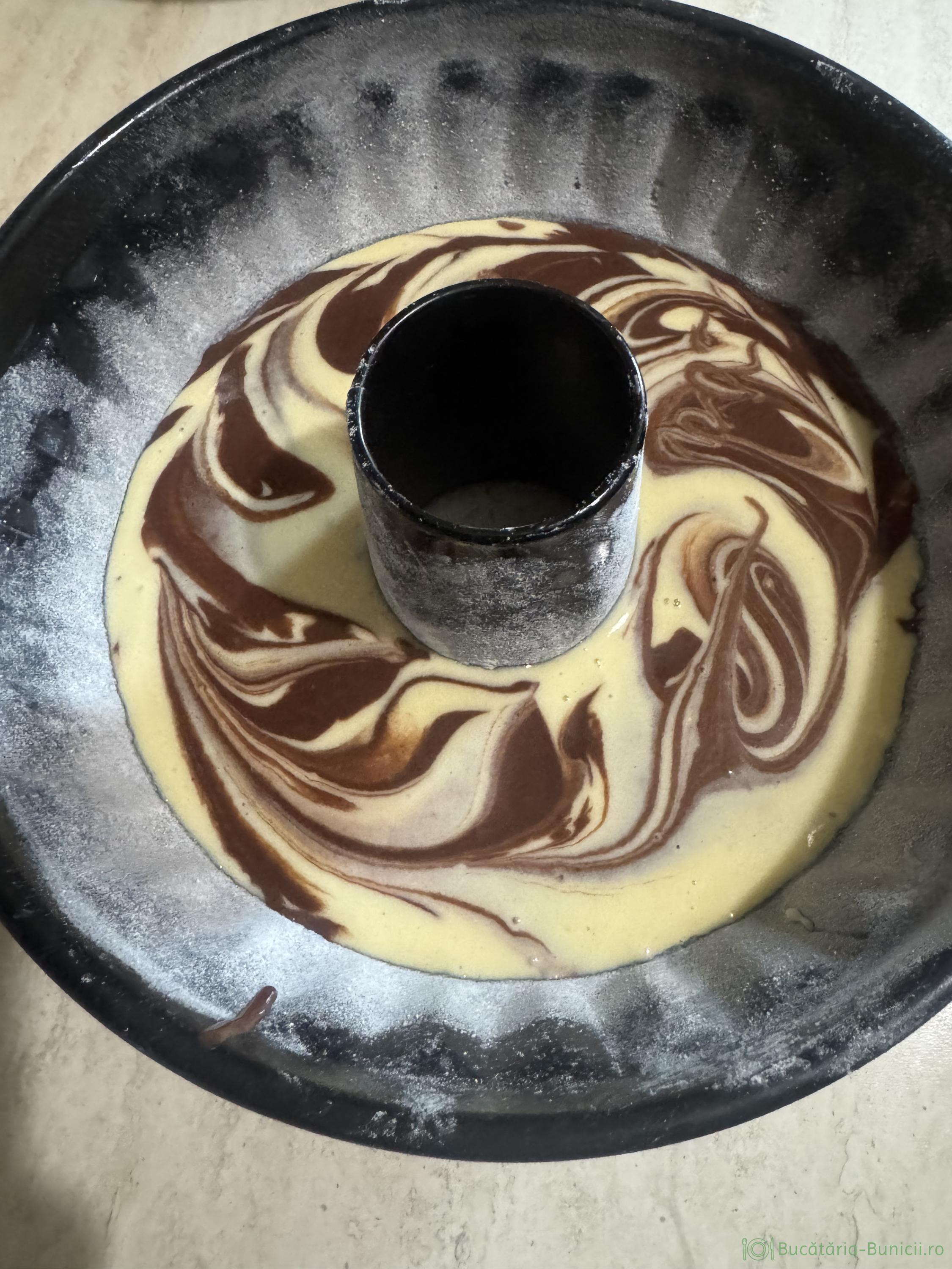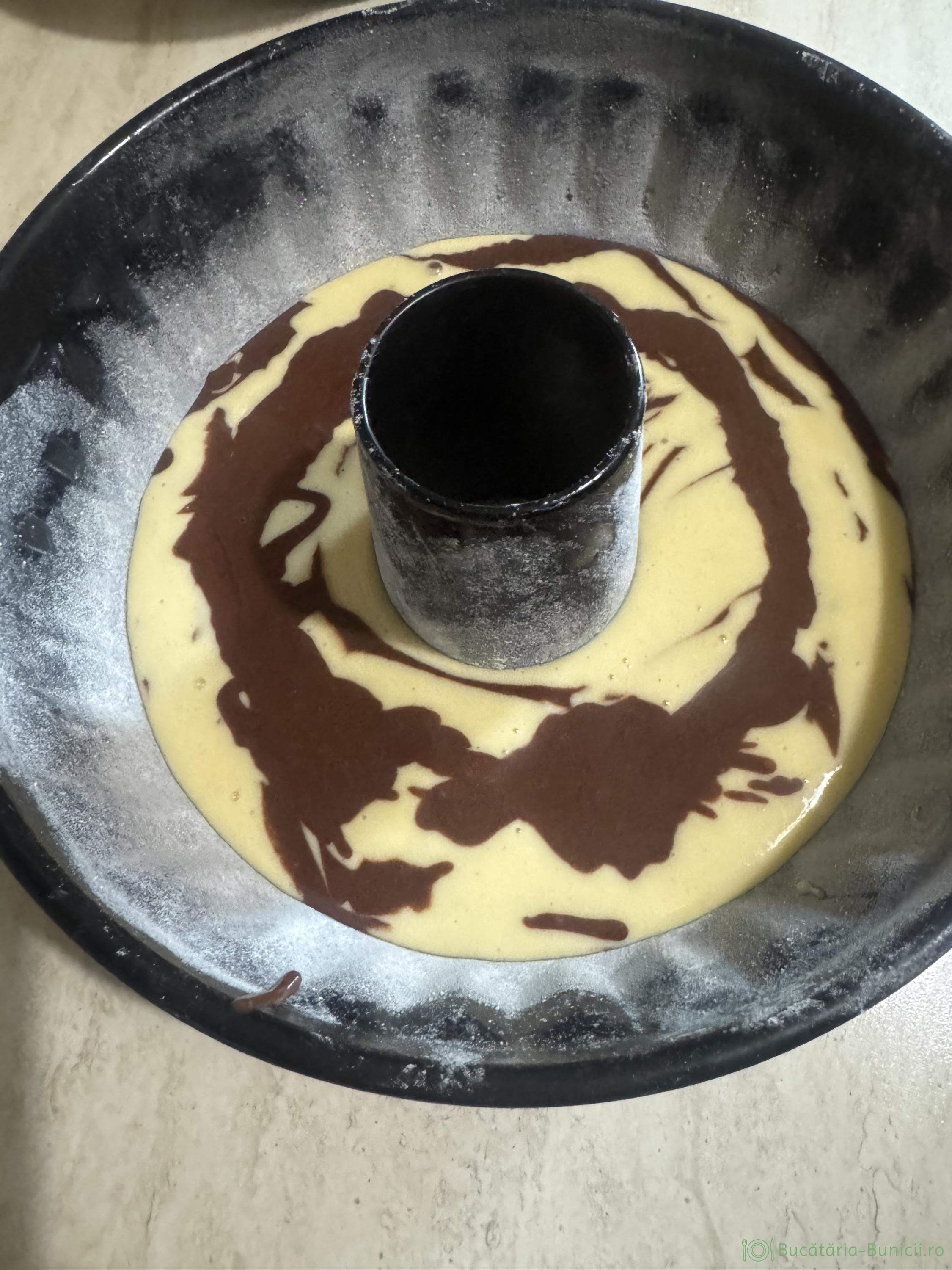 - Se toarnă compozițiile în forma pregătită, alternând un rând compoziție galbenă, un rând compoziție maro… până terminăm ambele compoziții. La final cu coada unei linguri, amestecăm cele două compoziții, pentru efect marmorat.