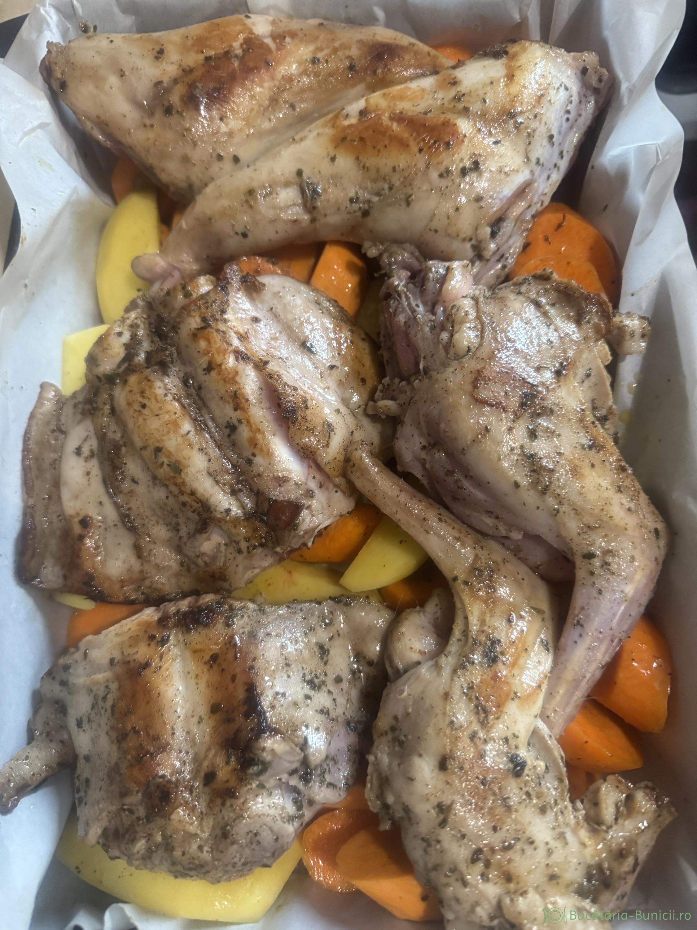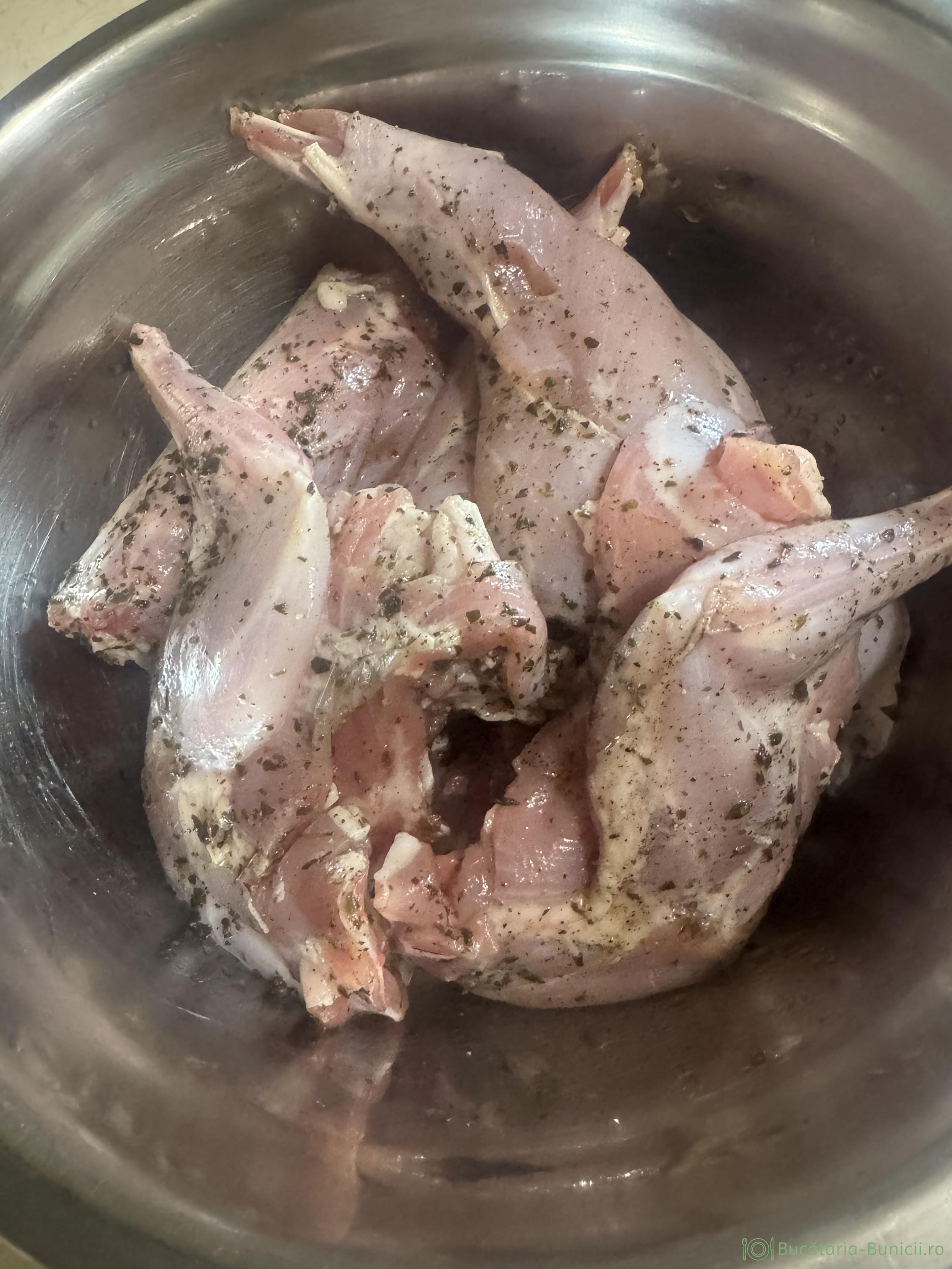 - Iepurele curățat și spălat bine, se tranșează în șase bucăți. Se ung bucățile de carne cu ulei de măsline, sare grunjoasă, piper și maghiran uscat. Se acoperă și se dă la frigider peste noapte.