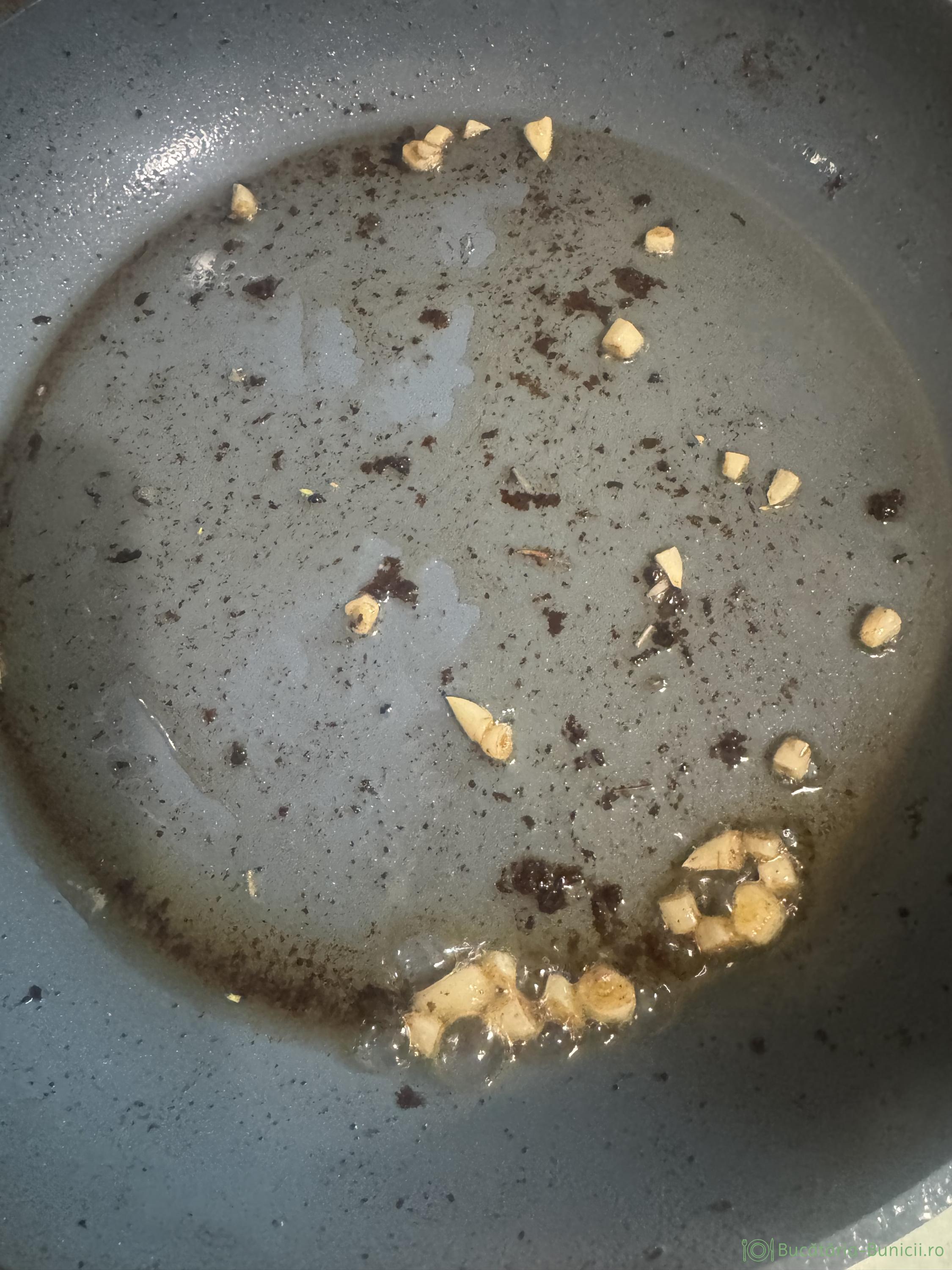 - După ce se scoate carnea din tigaie, în uleiul încins se pune usturoiul și se dă de pe foc, să nu se ardă, ca devine amar, apoi grăsimea cu tot cu usturoi, se toarnă peste legumele pentru garnitură.