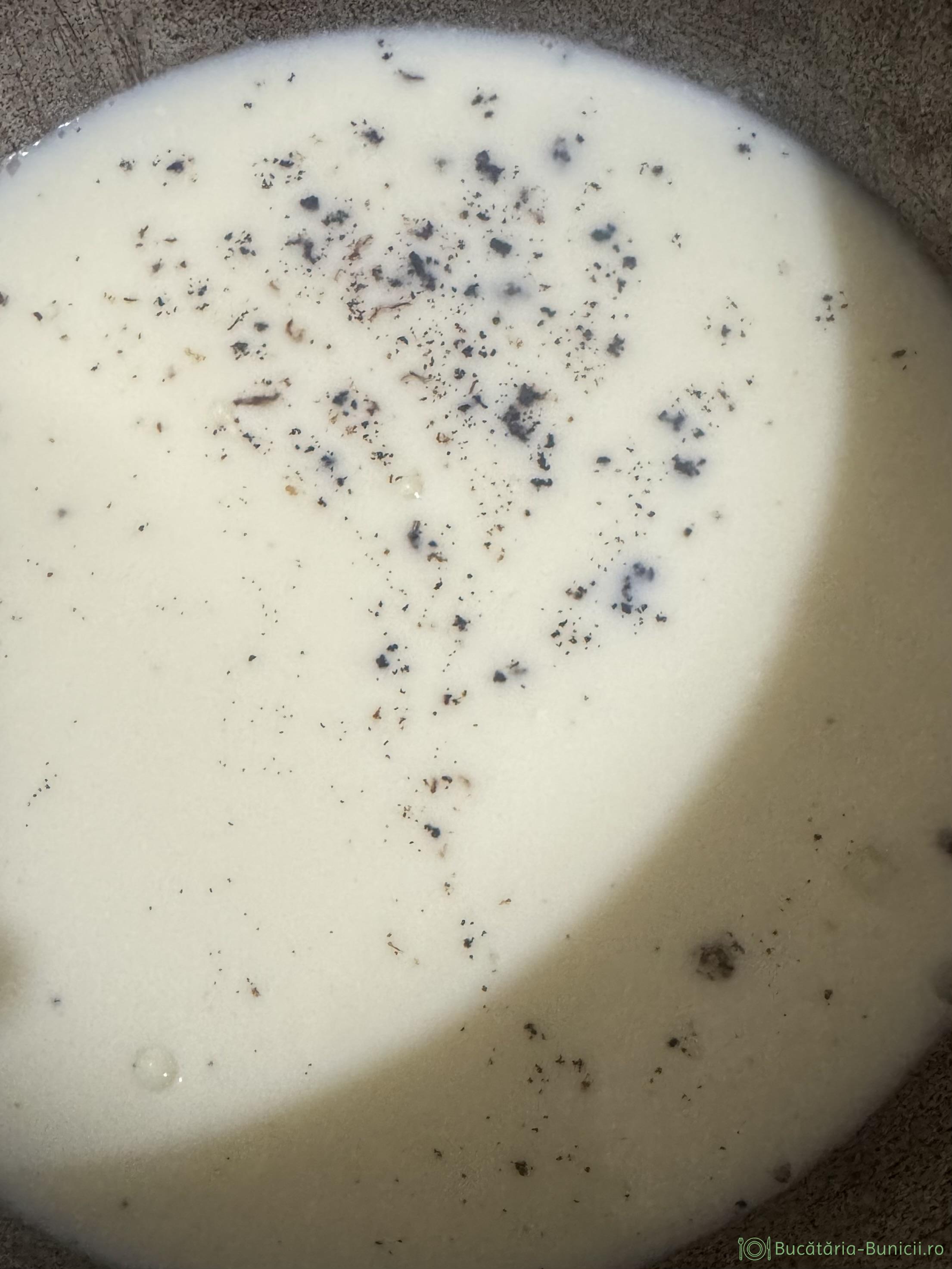 - Amestecăm energic, apoi toată compoziția o punem iar în vasul în care am încălzit laptele. Dăm vasul pe foc mediu, amestecând mereu, până obținem consistență unei budinci, după care o mai fierbem un minut.