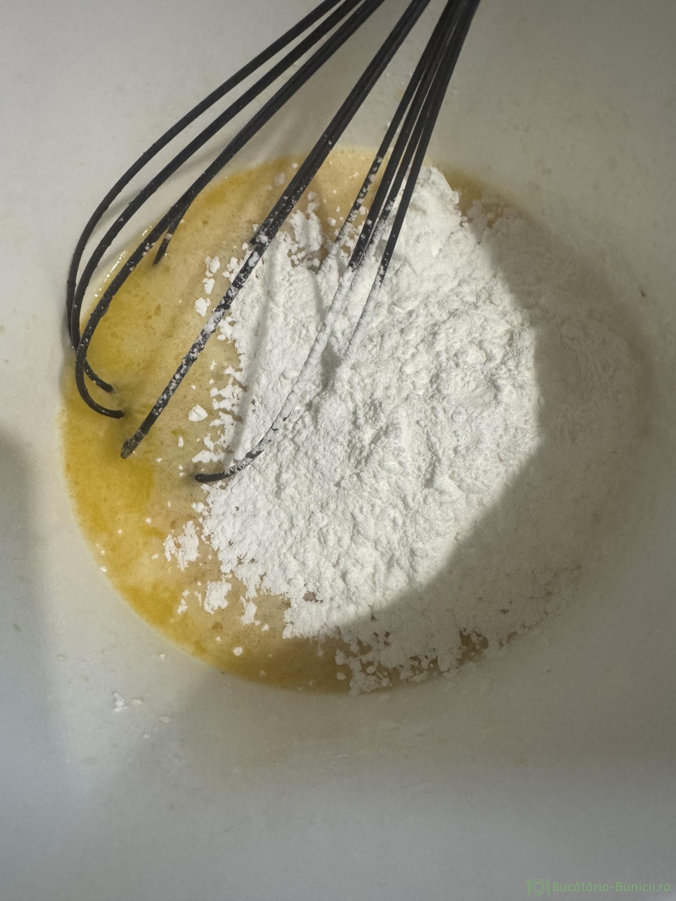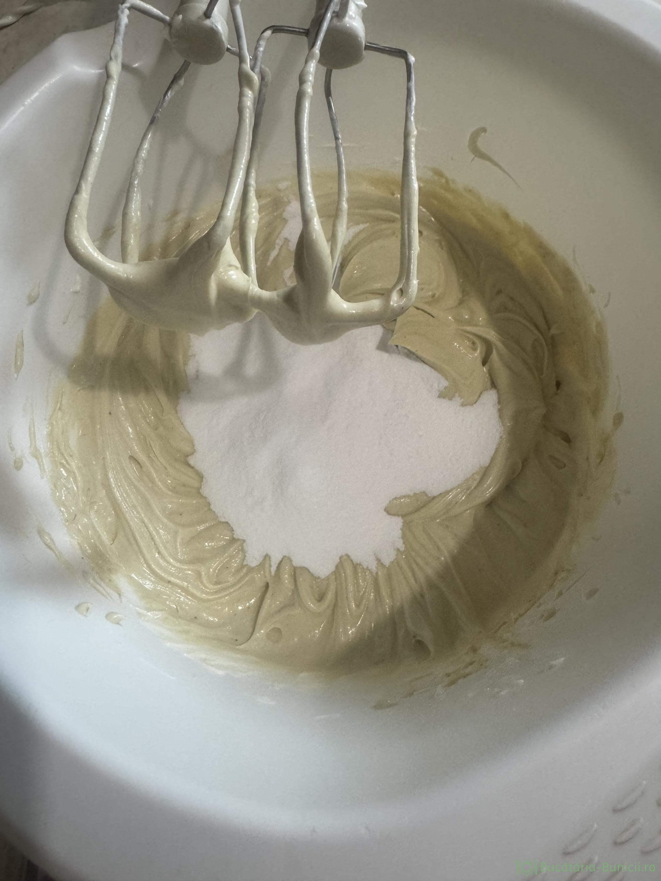 - Între timp se bat cu telul ouăle întregi, un praf de sare și zahărul, apoi se încorporează amidonul, amestecând, până se dizolvă complet.
