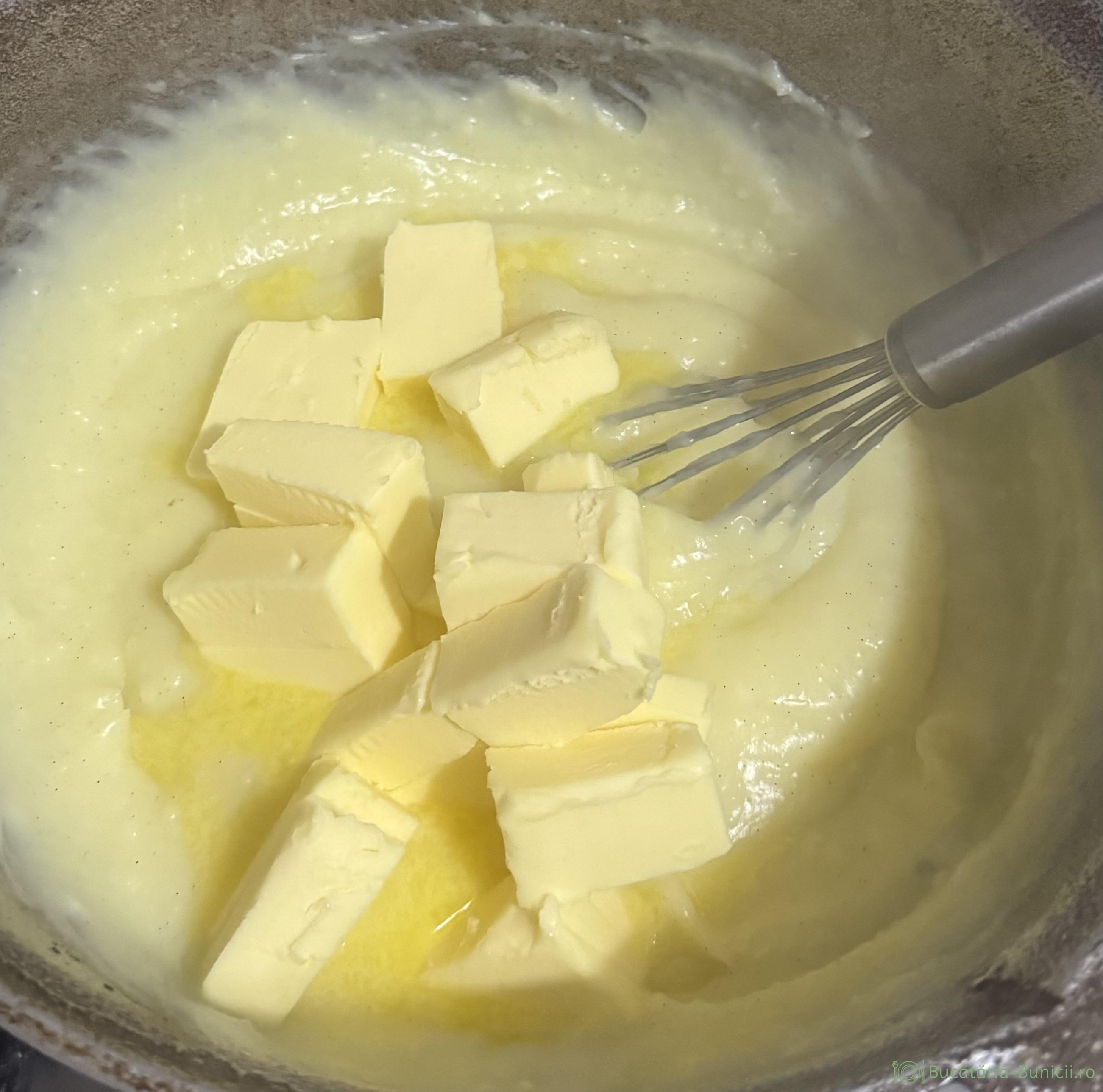 - Luam vasul de pe foc și încorporăm untul tăiat bucăți. Amestecăm bine, până tot untul este încorporat în cremă, după care transferăm într-un vas curat și punem folie alimentară direct pe cremă, să nu se usuce la suprafață. Crema se lasă la răcit.