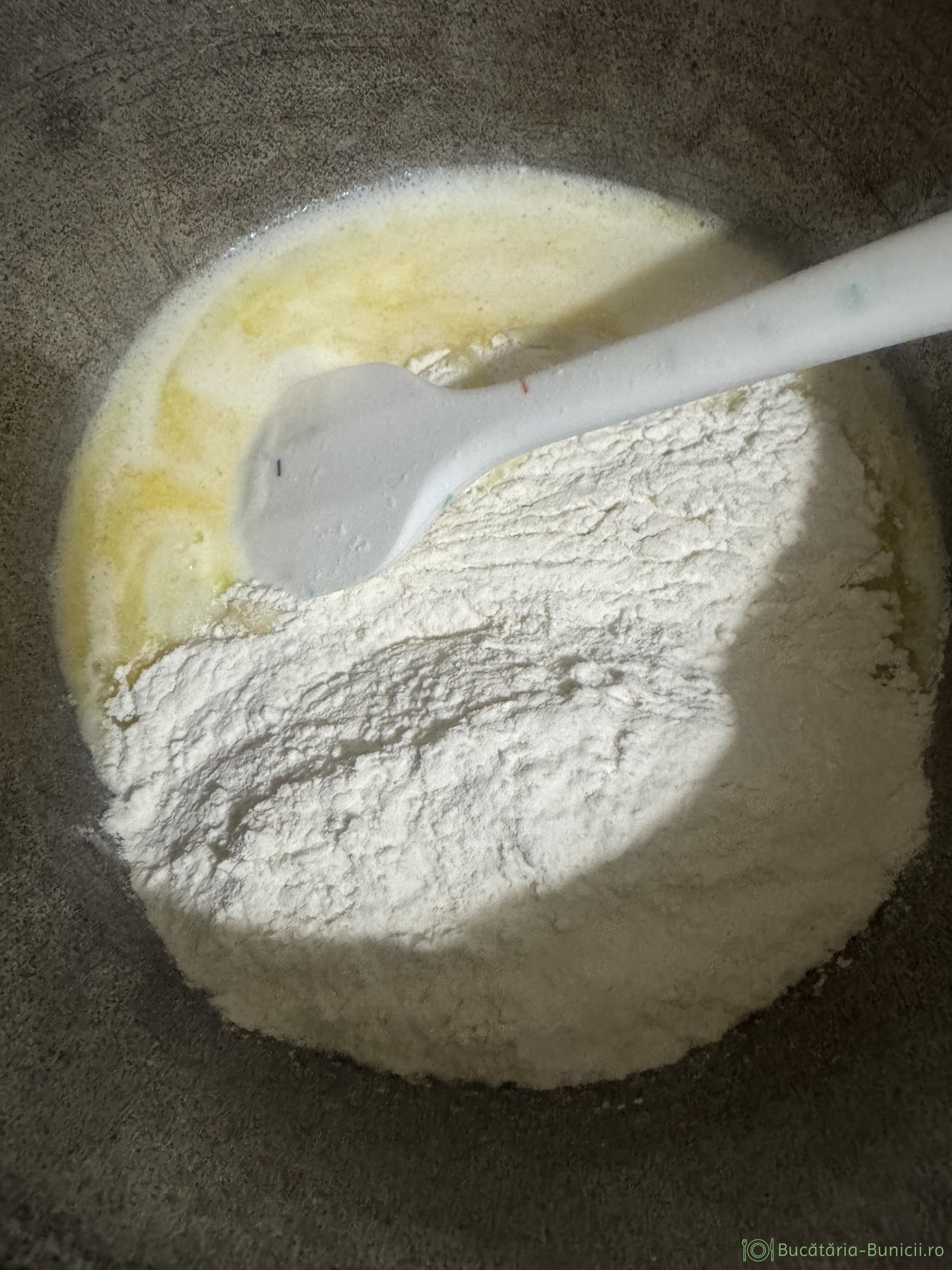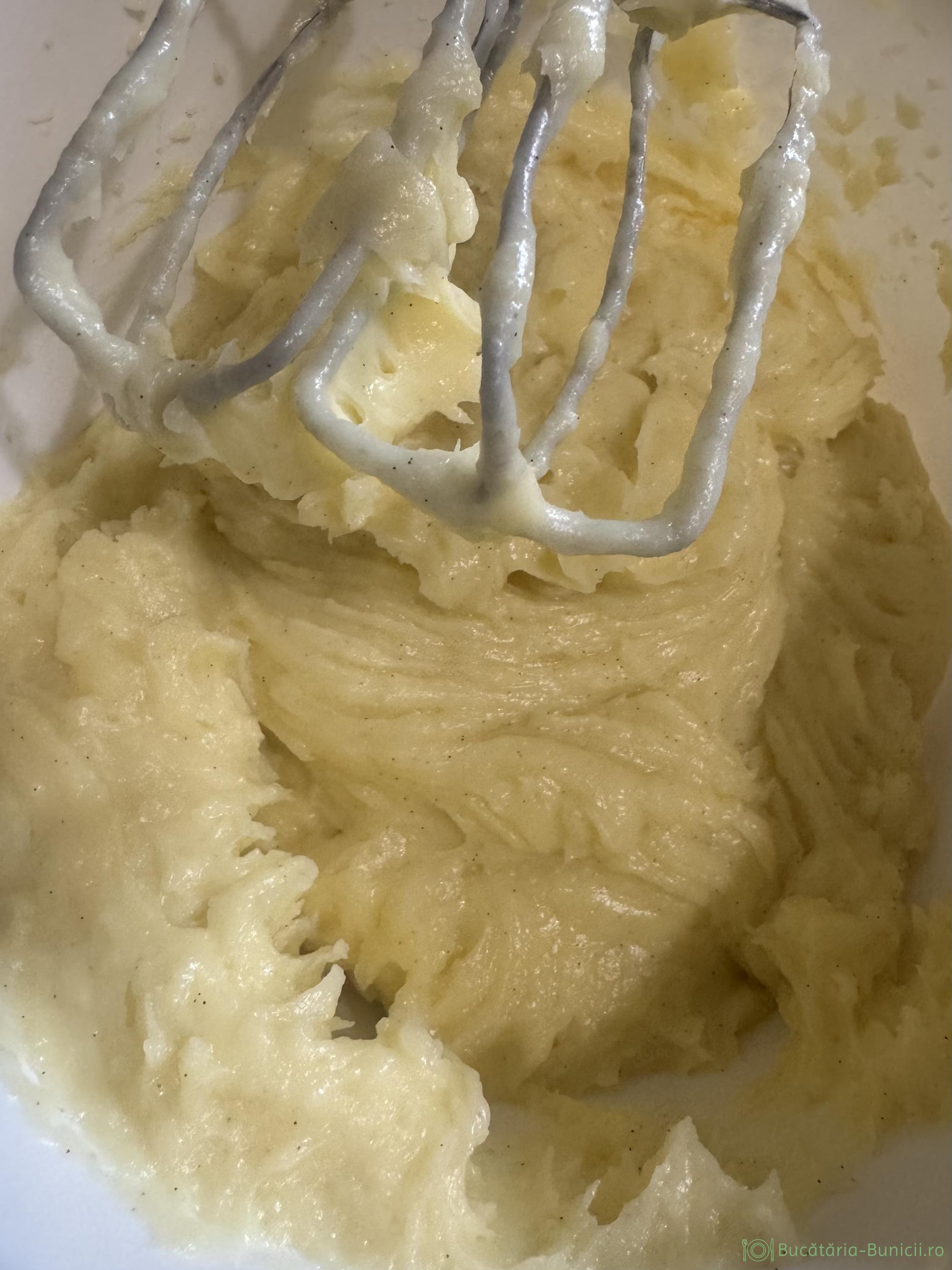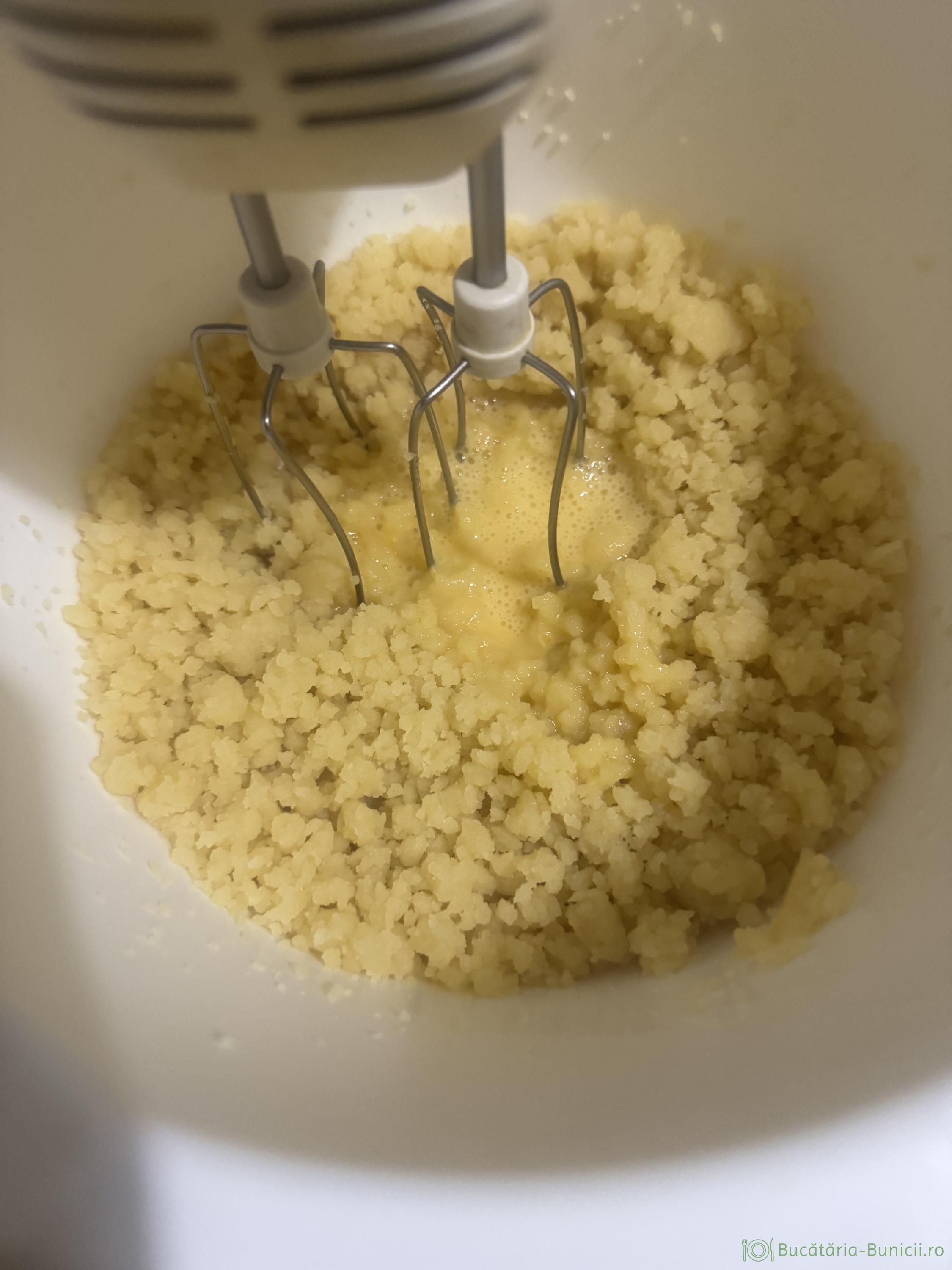 - Peste aluatul încă fierbinte, dar nu opărit, se pun treptat din ouăle bătute, mixând aluatul, până se încorporează cantitatea de ou.