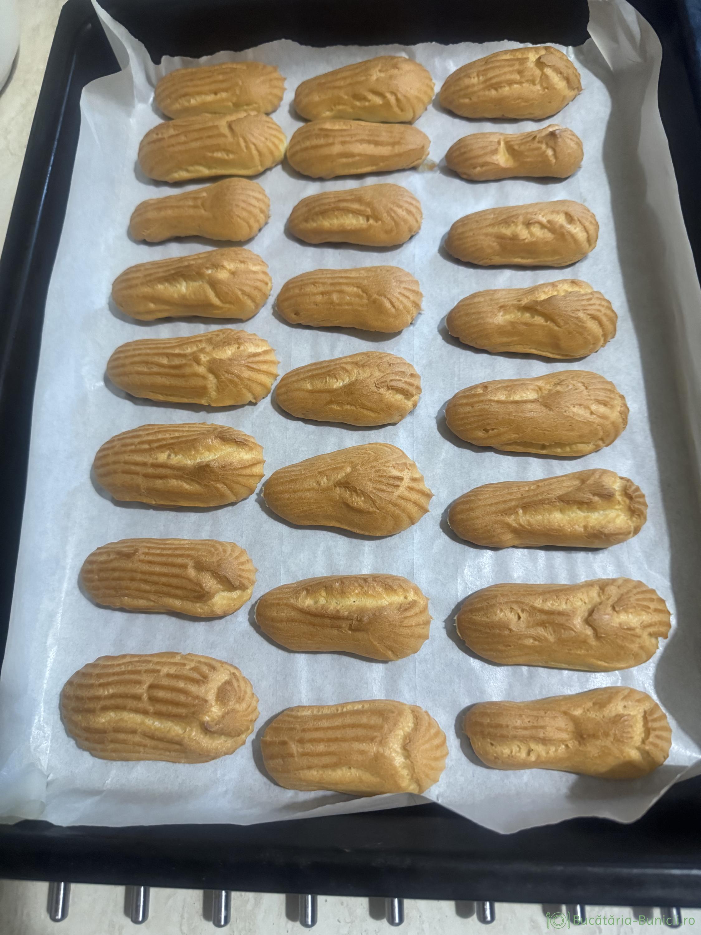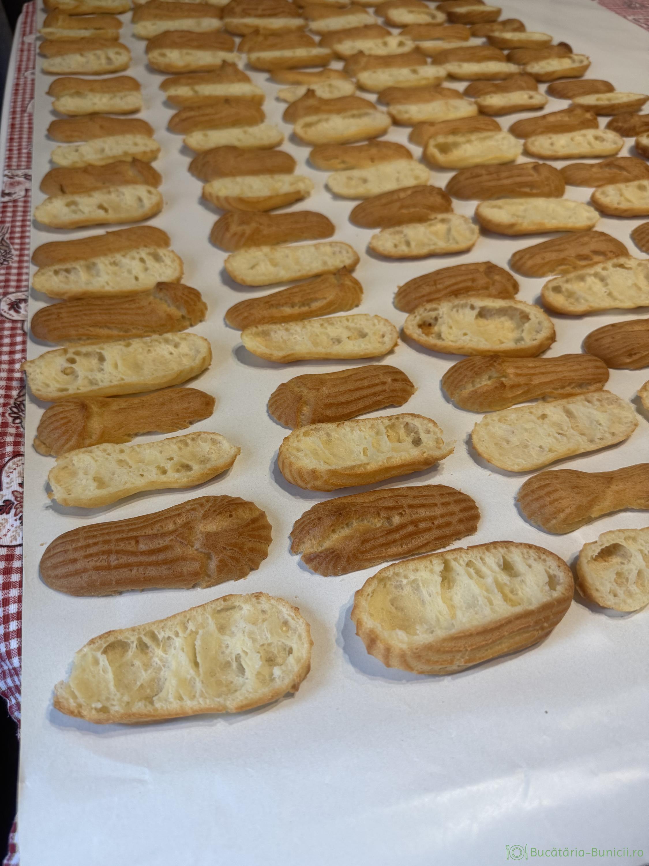 - Continuam cu restul de aluat, făcând bastonașe, dar schimbăm hârtia de copt din tavă. Un sfat primit, când am făcut prima dată eclere, asta fiind cu 35 de ani în urmă a fost: vasele, tăvile folosite la eclere, sa fie curate, fără dulce, sau gras pe ele.